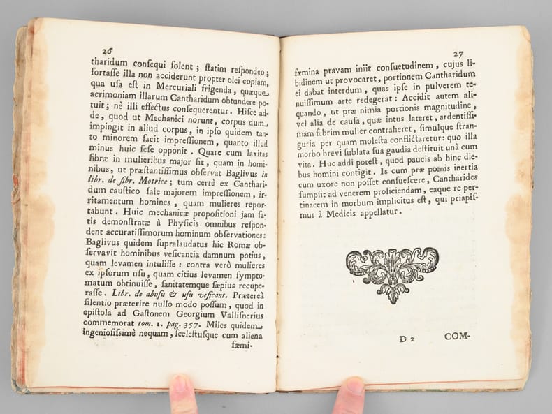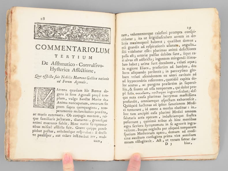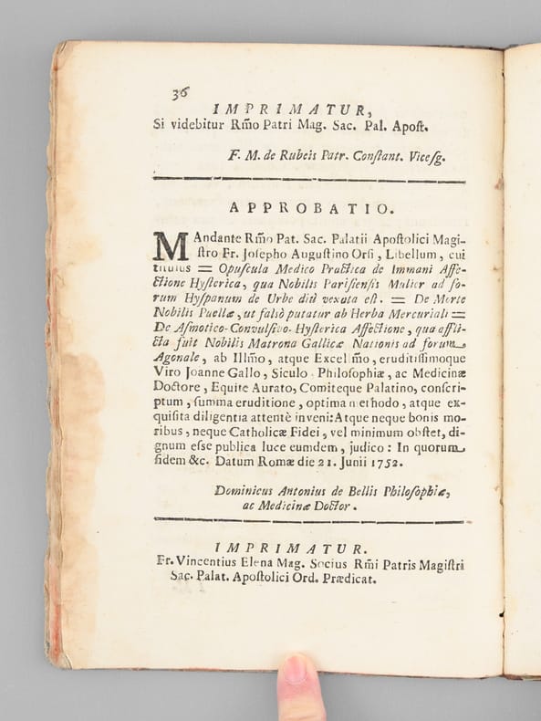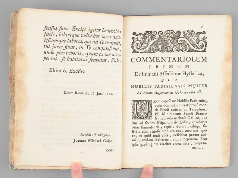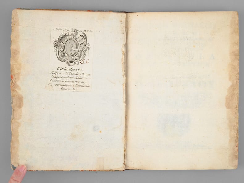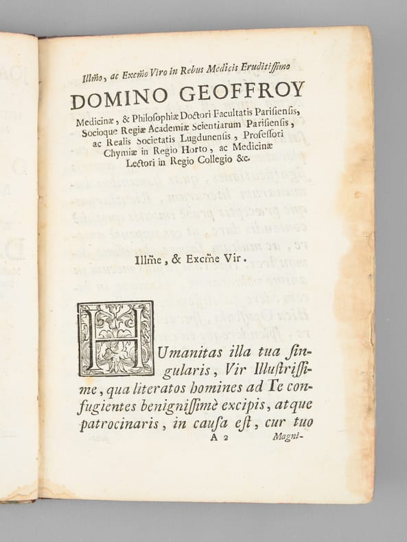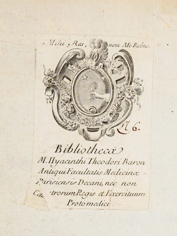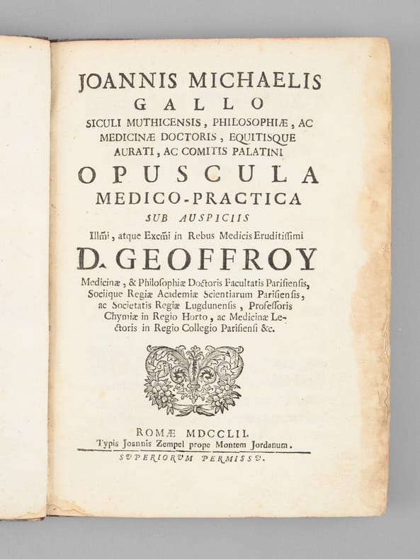 Médecin et chirurgien sicilien, né à Modica dans une famille noble en 1729, Giovanni Michele Gallo était curé de l'abbé de Parme ; noble, il servit avec succès en Sicile. Cette estampe est identique à une autre estampe de 1752, à l'exception de la page de titre et de la signature A2 (le nom de Morgagni remplaçant celui de Geoffroy). Geoffroy mourut le 9 mars 1752. L'ouvrage décrit trois cas : le premier concerne l'état hystérique d'une Romaine, le second la mort d'une noble, attribuée par erreur à l'herbe de Mercure, et le dernier l'asthme convulsif hystérique d'une Romaine. L'exemplaire provient de la bibliothèque du médecin militaire, alors doyen de la Faculté de Médecine et depuis peu membre de l'Académie des Sciences, Hyacinthe Théodore Baron(1707-1787). Sicilian doctor and surgeon, born in Modica of a noble family in 1729, Giovanni Micgele Gallo was pastor of the Parmenian abbot ; a nobleman, he served in Sicily with good success. This print is identical to another printing of 1752 except for the title page and signature A2 (with the name of Morgagni for that of Geoffroy). D. Geoffroy died on 9 March 1752. The work describes three cases, the first concerning the hysterical condition of a Roman woman, the second the death of a noble girl, wrongly attributed to the herb of Mercury, and the last the convulsive hysterical asthmatic condition afflicting a Roman lady. The copy comes from the library of the military doctor, then dean of the Faculty of Medicine and recently a member of the Academy of Sciences, Hyacinthe Théodore Baron (1707-1787). Medico e chirurgo siciliano, nato a Modica da nobile famiglia nel 1729, Giovanni Michele Gallo fu parroco dell'abate parmense; nobile, prestò servizio in Sicilia con successo. Questa stampa è identica a un'altra stampa del 1752, fatta eccezione per il frontespizio e la firma A2 (con il nome di Morgagni per quello di Geoffroy). D. Geoffroy morì il 9 marzo 1752. L'opera descrive tre casi, il primo riguardante la condizione isterica di una donna romana, il secondo la morte di una nobile fanciulla, erroneamente attribuita all'erba di Mercurio, e l'ultimo la condizione asmatica convulsiva isterica che affliggeva una dama romana. La copia proviene dalla biblioteca del medico militare, allora preside della Facoltà di Medicina e recentemente membro dell'Accademia delle Scienze, Hyacinthe Théodore Baron (1707-1787).. Etat très satisfaisant (forte mouill. marginale, coupes frottées, ex-libris de Hyacinthe Théodore Baron)Welcome, 14314594