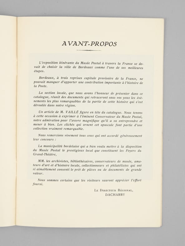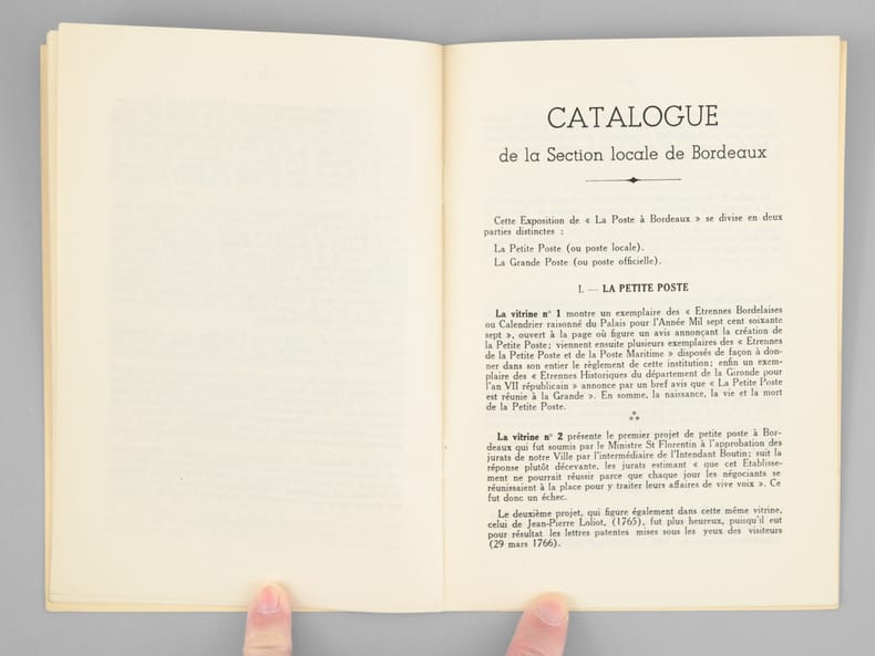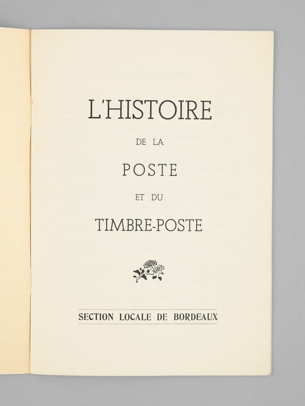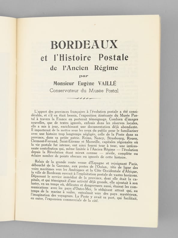 Brochure publiée à l'occasion de l'exposition itinérante du Musée Postal, accueillie à Bordeaux dans les Foyers du Grand-Théâtre. On y trouvera un article d'Eugène Vaillé, Conservateur du Musée Postal, sur "Bordeaux et l'Histoire Postale de l'Ancien Régime", ainsi que le catalogue de la section locale de Bordeaux. Bon état (manipulé avec traces de froissement, bon exemplaire par ailleurs).