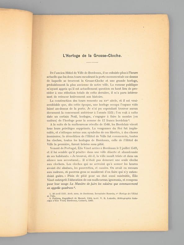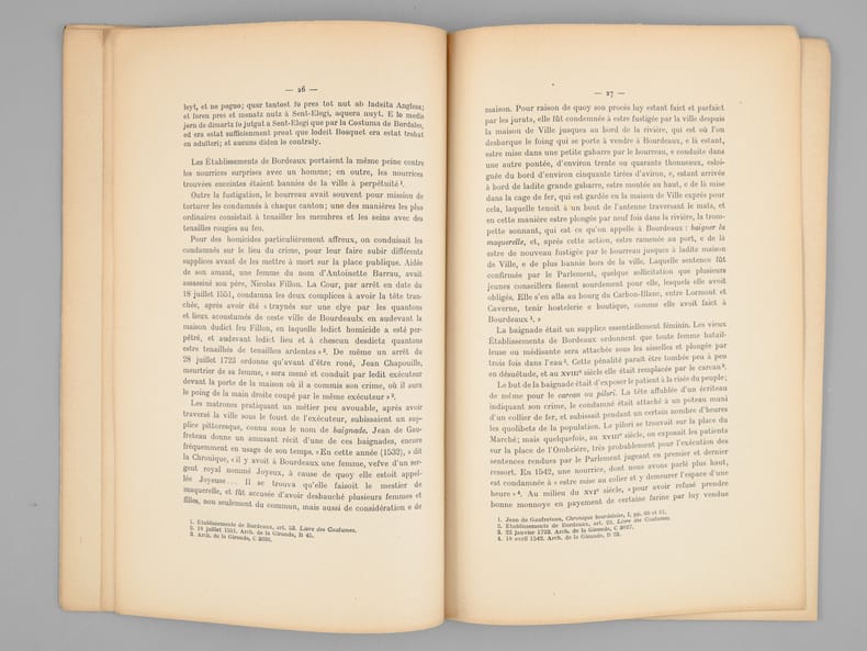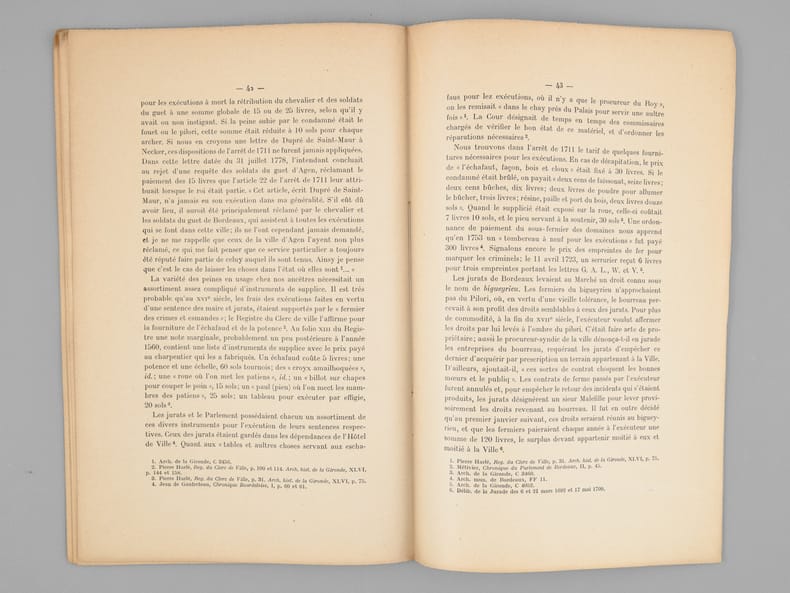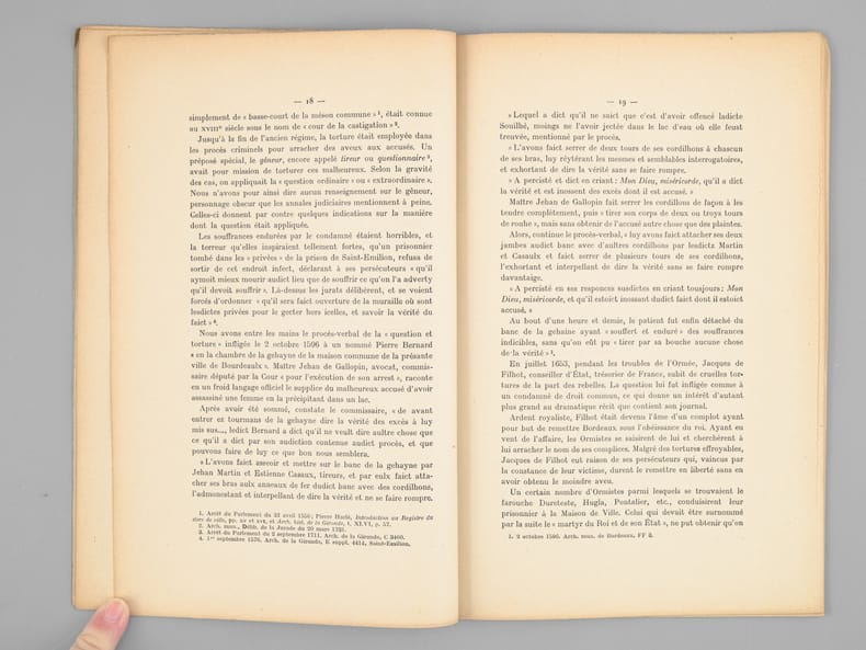 L'essentiel de l'ouvrage est consacré au "Bourreau de Bordeaux avant la Révolution". Etat très satisfaisant (rouss. sur couv. avec petit mq. au second plat, bon état par ailleurs).