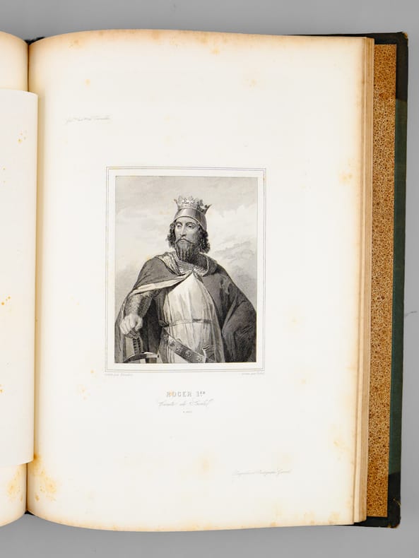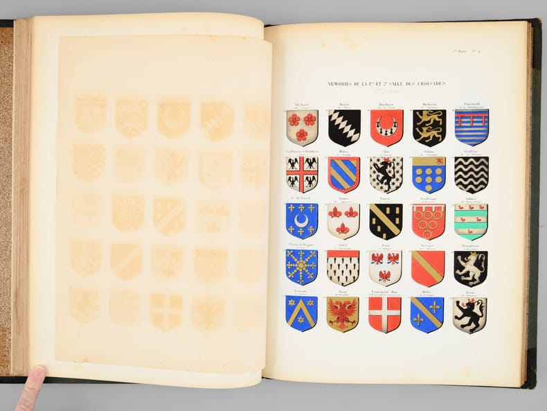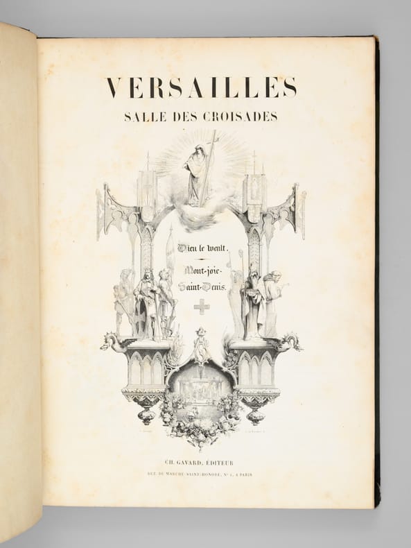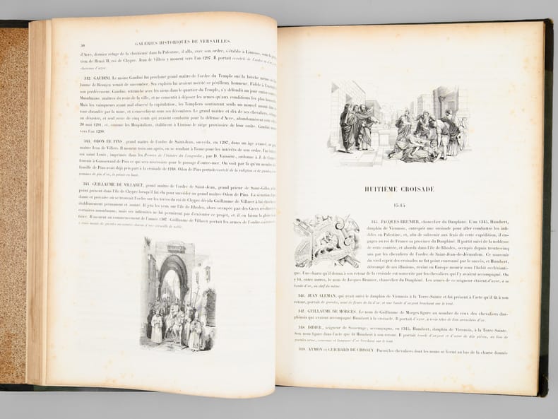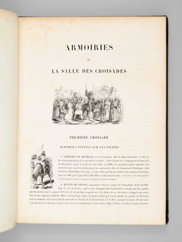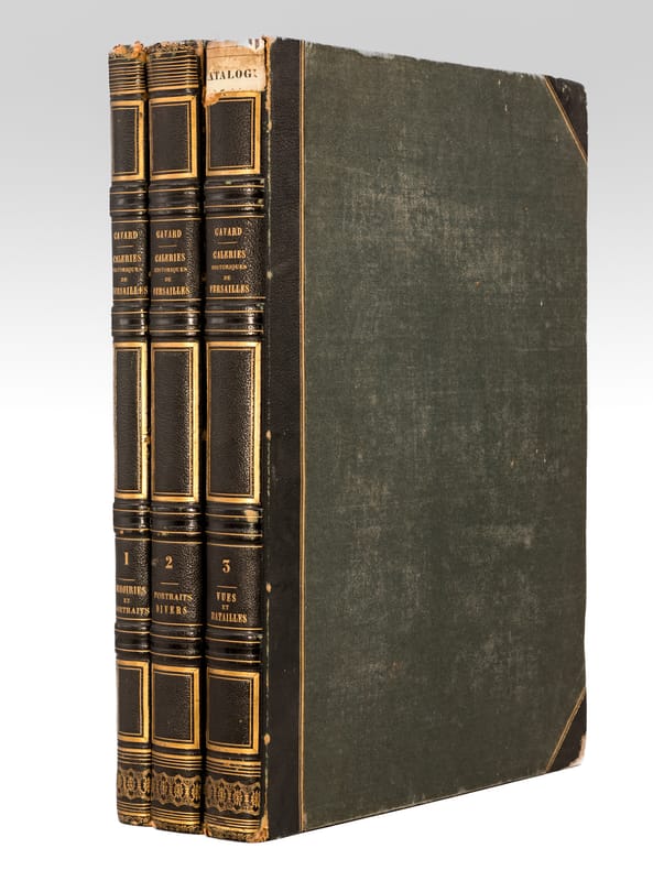 3 vol. in-folio reliure de l'époque demi-chagrin vert, Ch. Gavard Editeur, Paris, s.d. [ circa 1839-1842 ], Tome I : 63 pp., 15 planches en couleurs (Armoiries de la Salle des Croisades), 17 ff. et 16 planches hors texte (Portraits des principaux Chefs des Croisés) ; Tome II : Portraits divers : 54 planches et texte ; Tome III : 6 ff., 86 planches