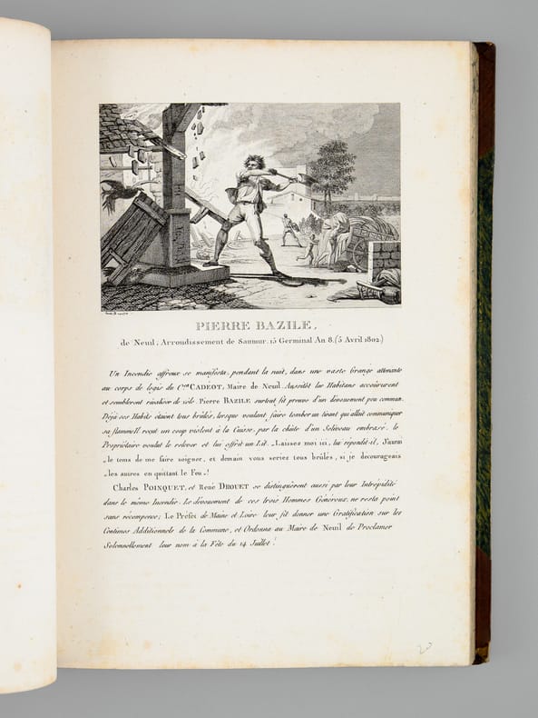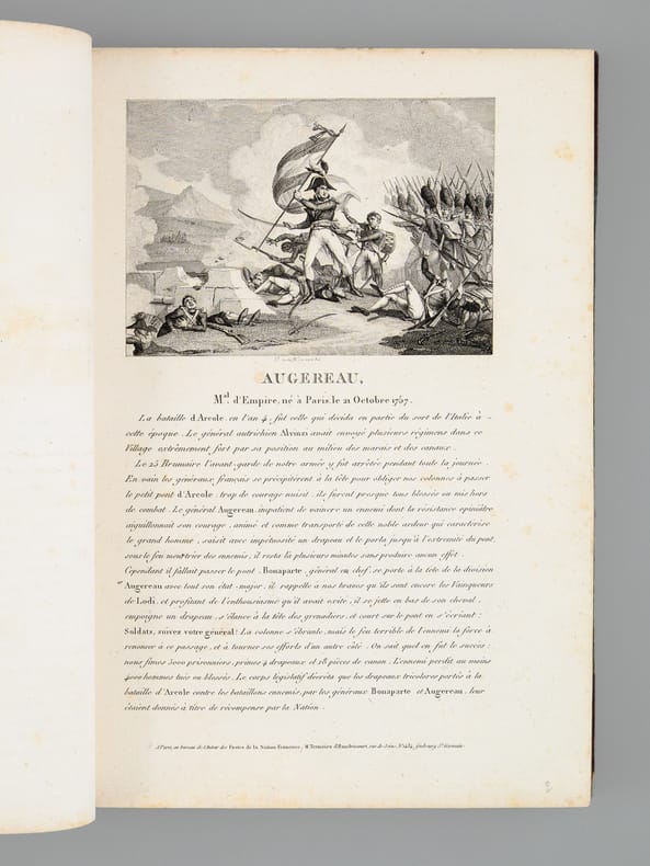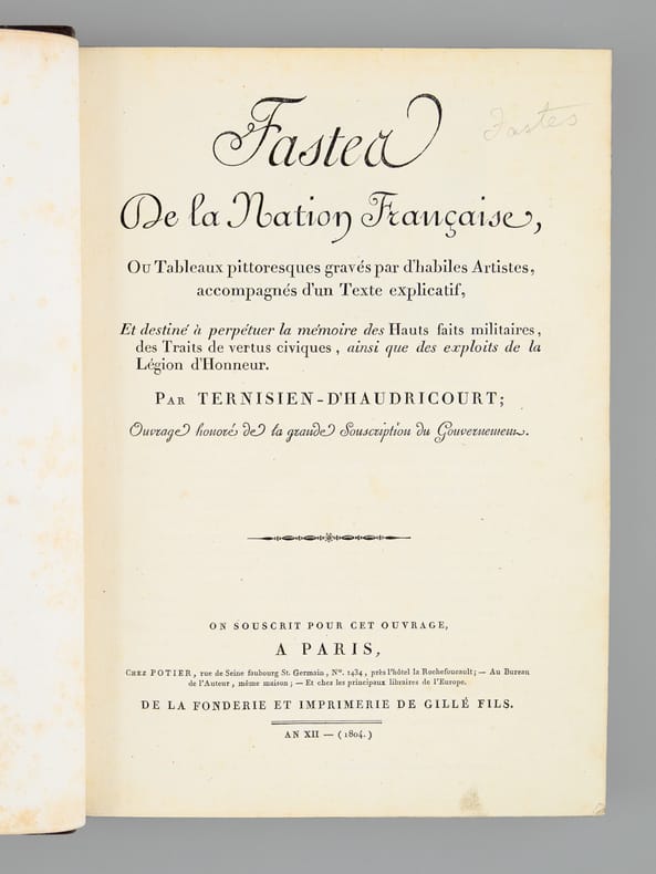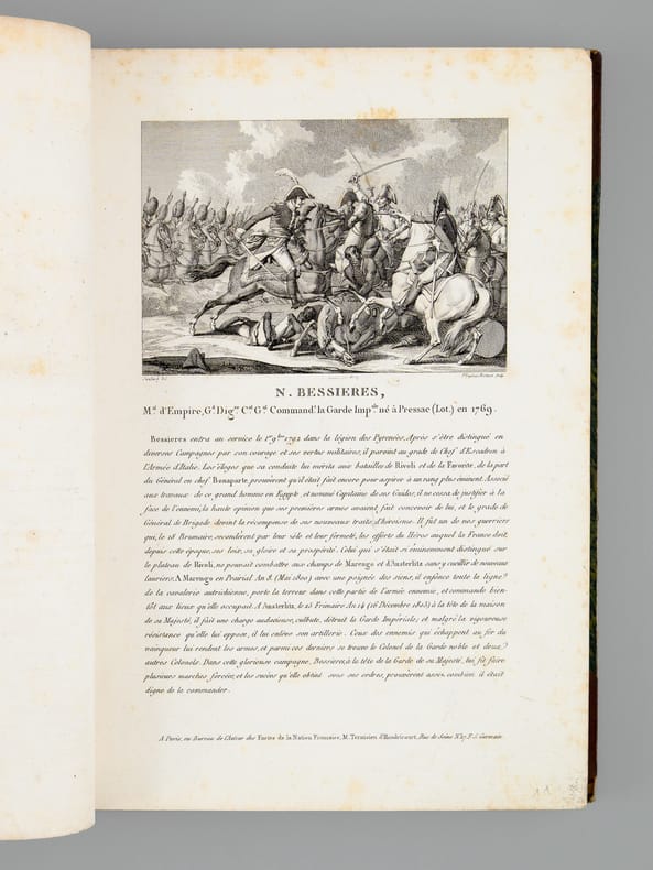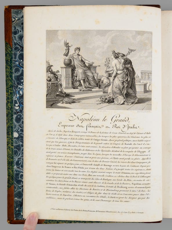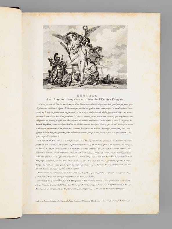 1 vol. in-4 reliure lég. postérieure demi-cuir à coins brun, dos à 5 nerfs On souscrit pour cet ouvrage, A Paris, Chez Potier, Au Bureau de l'Auteur, Et chez les Principaux libraires de l'Europe, De la Fonderie et Imprimerie de Gillé Fils, Paris, An XII, 1804, 4 ff. (Frontispice : Napoléon le Grand, titre gravé, titre, planche : Hommage), 1 f., 3 pp., 2 ff., 20 ff. (Lettres des Souverains, Princes, Ministres, etc...), 10 pp., 116 pl., 2 ff.
