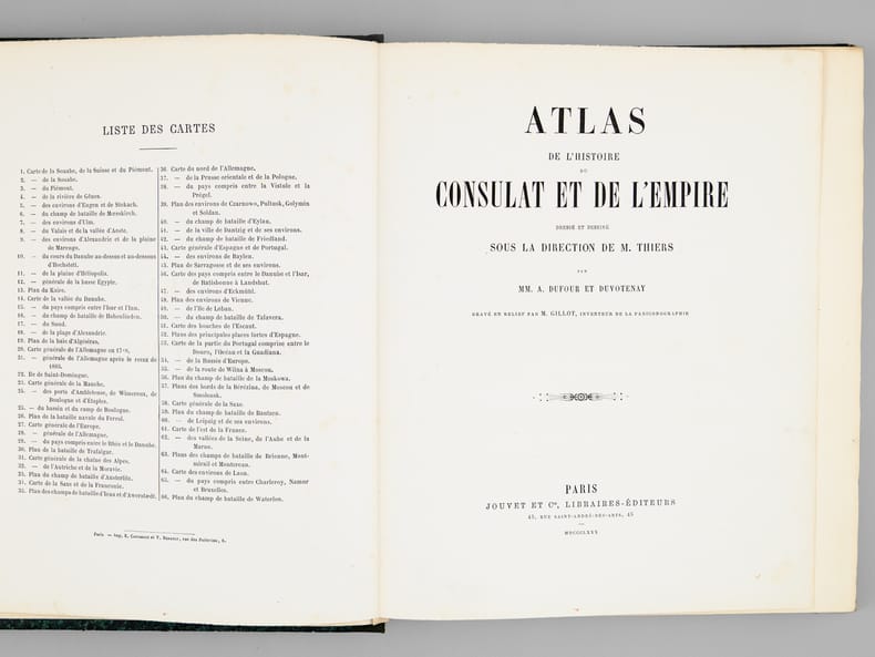 Dressé et dessiné sous la direction de M. Thiers par MM. A Dufour et Duvotenay, gravé en relief par M. Gillot, inventeur de la paniconographie, 1 vol. in-4 (29,5 x 24,5 cm) cartonnage éditeur demi-percaline verte, Jouvet et Cie, Paris, 1880, 2 ff. et 66 cartes