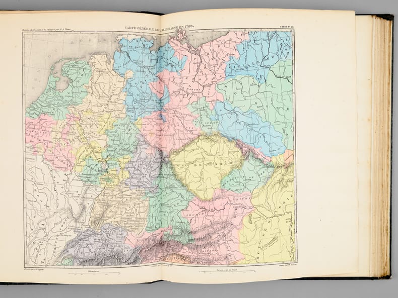 Pas toujours joint aux volumes de texte, cet atlas complète la classique Histoire du Consulat et de l'Empire, tant dans son édition originale de 1842-1865 que dans les réimpressions. Bon exemplaire. - - VENTE PAR CORRESPONDANCE UNIQUEMENT