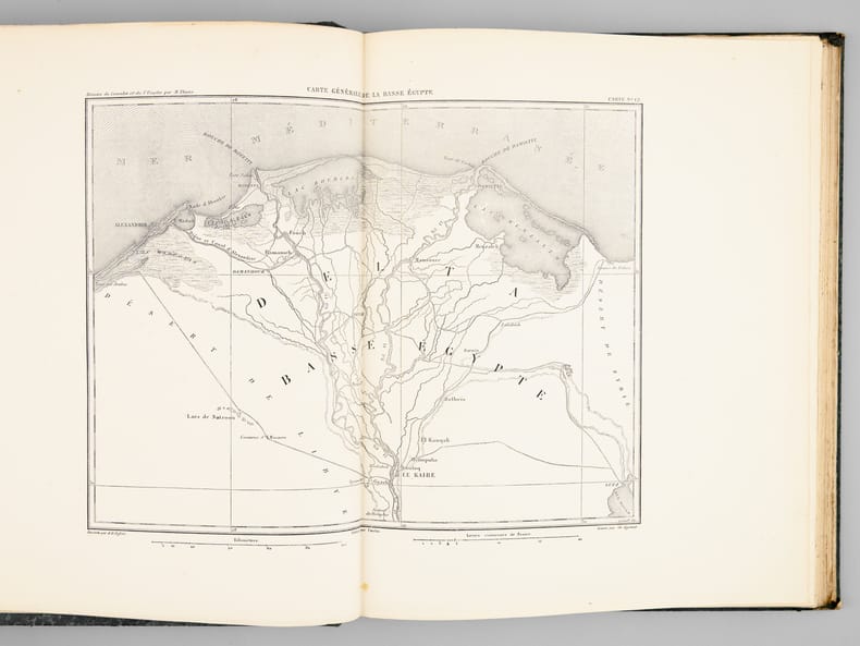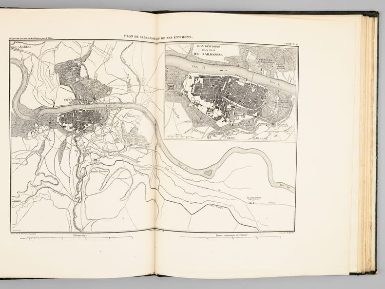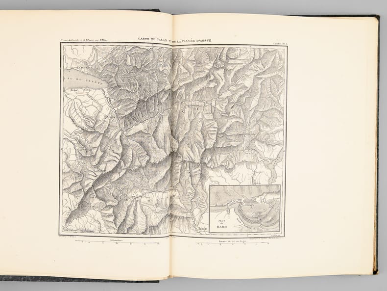 Paris, Paulin-Lheureux, 1845-62, atlas (1866), in-8vo, atlas in-folio, chaque volume env. 500 p., l'atlas comprend 66 cartes dont 7 sur double-page montées sur onglets (deux coloriées), non paginé, toutes les cartes en excellent état + 2 cartes ajoutées: une carte du Nord de l'Italie pour l'étude de la campagne de Napoléon III en1859 par le colonel Suisse F. Lecomte et une carte en fac-similé de la ville de Paris en 1576, reliures en pleine percaline verte, dos et plats estampés de filets à froid, quelques frottements et usures. Atlas in-folio relié en demi-chagrin, dos à nerfs orné de filets dorés, Généralement bel ensemble.