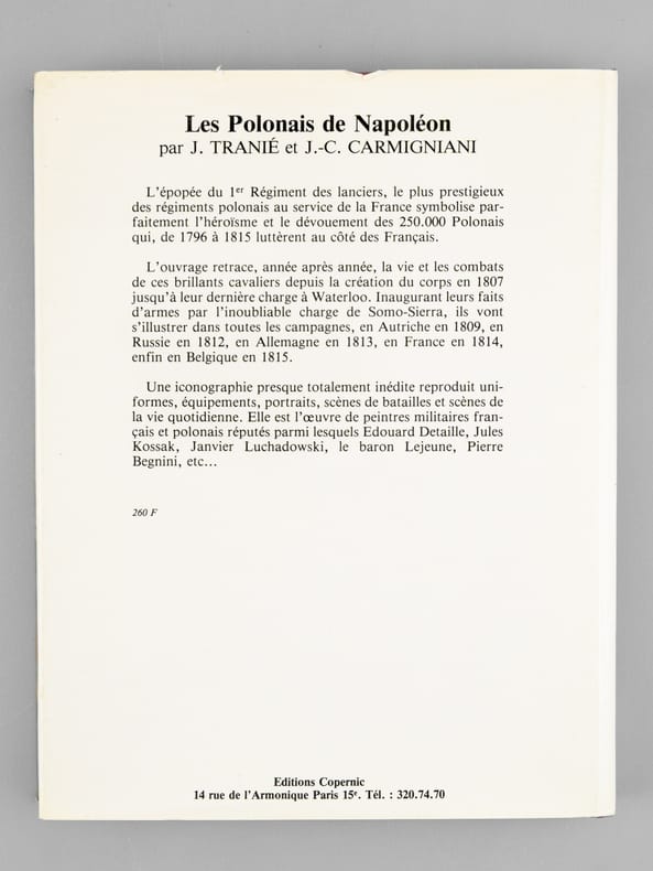 Napoléon avait promis aux Polonais la reconstruction d’une Pologne indépendante, ils s’engagèrent en masse dans ses armées. Il ne tint pas son engagement, ils tinrent leur place dans toutes les batailles de l’Empire ! Tranié et Carmigniani consacrent cet ouvrage de belle facure aux plus célèbres des Polonais – le 1er régiment de Lanciers de la Garde Impériale. Accompagnons ces cavaliers d’exception de leur naissance à 1815 en passant par leur charge fantastique à Somo Sierra, leur charge victorieuse à Wagram, le choix de la fidélité en 1813 et leur courage inépuisable en 1814 ! Les Polonais de l’Empereur se battent en Allemagne en 1813, puis repassent le Rhin au début de l’année 1814 pour participer glorieusement à la campagne de France. Ils se battront à Brienne, la Rothiere, Champaubert, Vauchamp, Montereau. Après l’abdication de l’Empereur, un détachement de 109 cavaliers accompagne Napoléon à l’ile d’Elbe. Le reste du régiment, sous la conduite du général Krasinski, se présente au Grand Duc Constantin et rejoint la Pologne. Lors de la réorganisation de la Garde pendant les Cent jours, les Polonais trop peu nombreux pour reformer le 1er régiment sont amalgamés au 2e régiment de Chevau-légers et prennent rang de 1er escadron sous les ordres du général de Colbert. Ils participeront à la campagne de Belgique et chargeront à Waterloo. — Les livres de Jean Tranié et Juan-Carlos Carmigniani (aujourd'hui tous les deux disparus) reposent tous sur une même et parfaite alchimie : le texte de Tranié est particulièrement bien écrit, dans un français classique, riche, épique ; le récit des opérations militaires est précis et explicatif et il est émaillé de nombreuses anecdotes dramatiques ou croustillantes ; enfin, le travail de recherche iconographique de Carmigniani est d'une richesse incroyable et est mis en valeur par un art très accompli de la de la légende qui fait mouche pour les accompagner. Le présent volume, intitulé « Les Polonais de Napoléon », est intégralement consacré aux faits d'armes du 1er Régiment de lanciers de la Garde Impériale : « sous drapeaux étrangers presque sur toute la terre, ce soldat ne combattit que pour sa patrie ! ». Le livre est un bel hommage aux cavaliers qui s'illustrèrent à la Somosierra, à Lützen, pendant la campagne de France et bien évidemment à Waterloo. « Ils font partie de la légende. Ils incarnent la fougue du cavalier léger, le courage légendaire de la vieille Pologne, la fidélité et le panache » affirme Jean Tranié en conclusion de son merveilleux ouvrage.