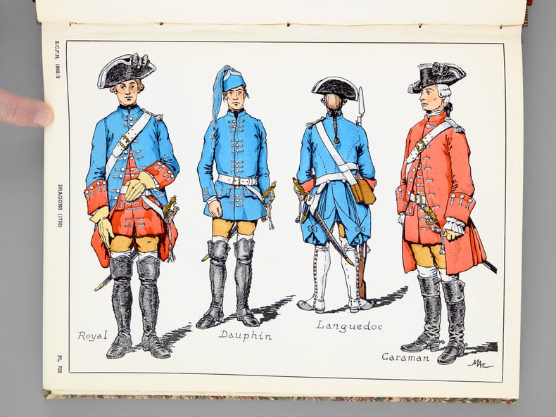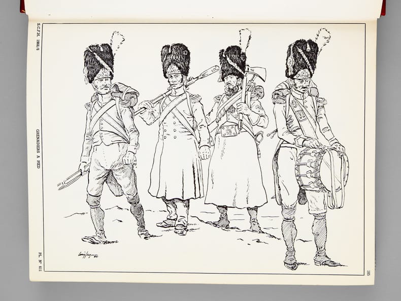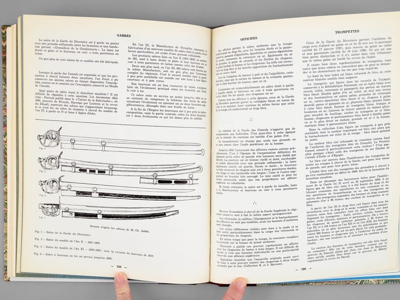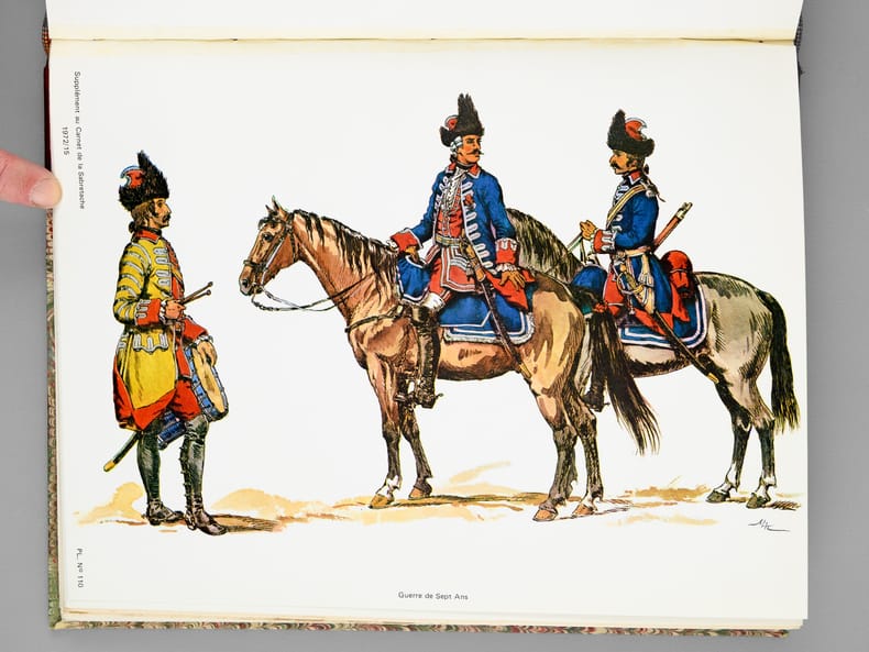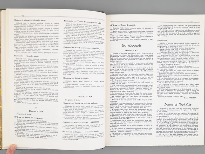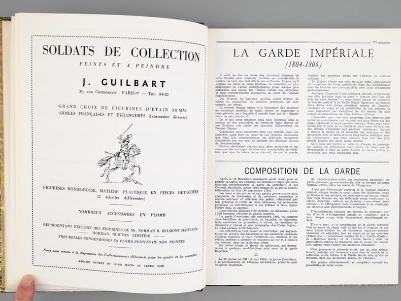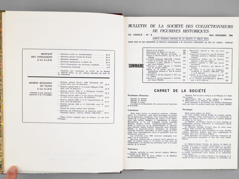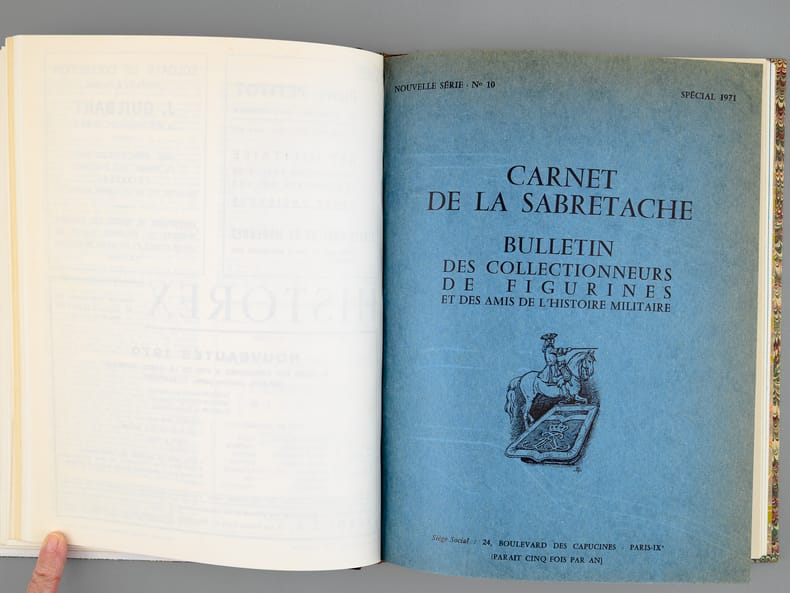 2 vol. in-4 reliure demi-basane rouge, dos à 5 nerfs, couvertures conservées : Carnet de la Sabretache. Bulletin des Collectionneurs de Figurines et des Amis de l'Histoire Militaire (Lot de 7 numéros reliés en deux volumes : Texte et Planches). N° 6 Nov. Déc. 1966 La Garde Impériale 1804-1806 - N°5/1 décembre 1968 Les Dragons 1635-1804 - N°5/2 1969 Les Dragons 1805/1804 - N°10 1971 Les Hussards Français 1792/1815 - N°15 1972 Les Grenadiers à cheval 1676-1830 - N°30 1975 Les Lanciers 1807/1871 - N° 45 1978 Les Artilleurs Français 1830/1918