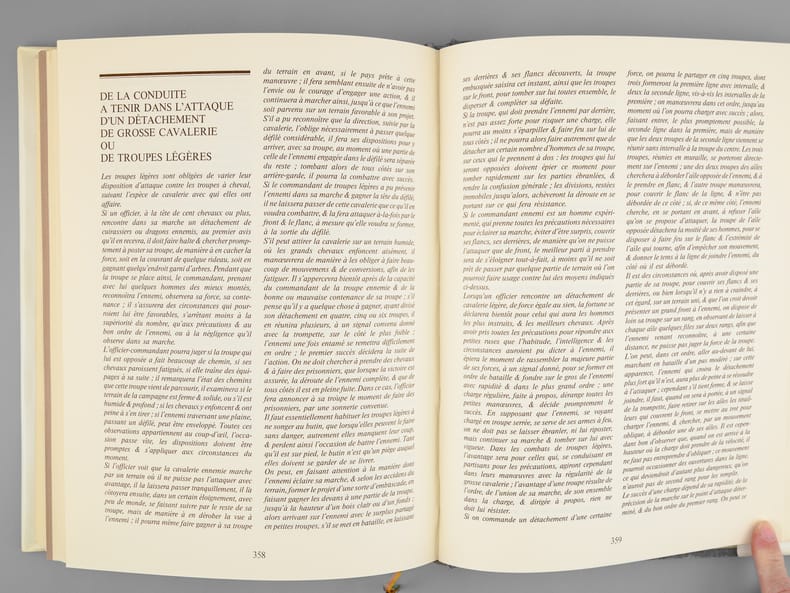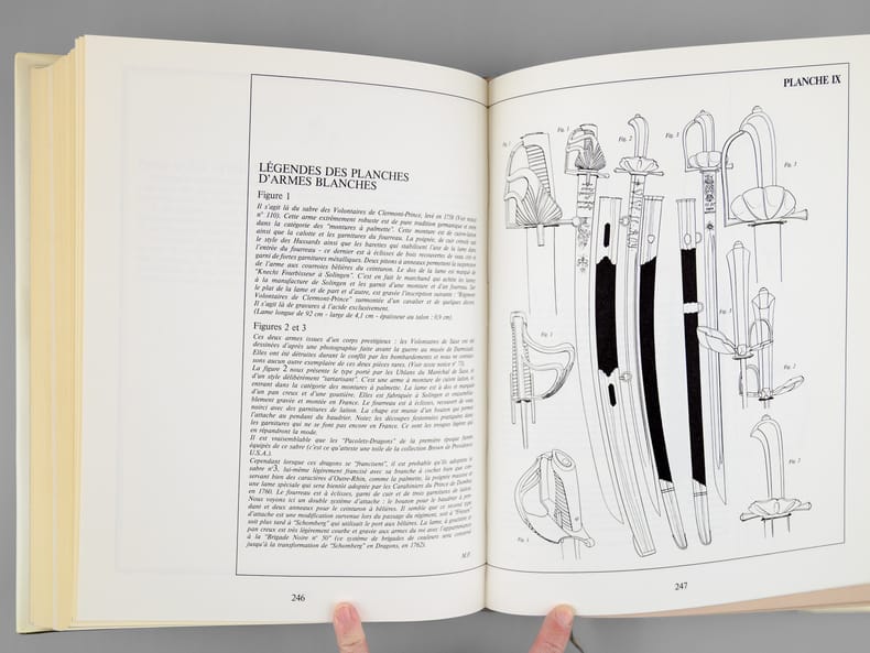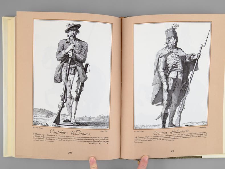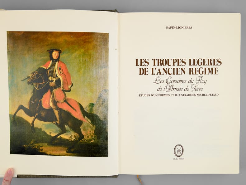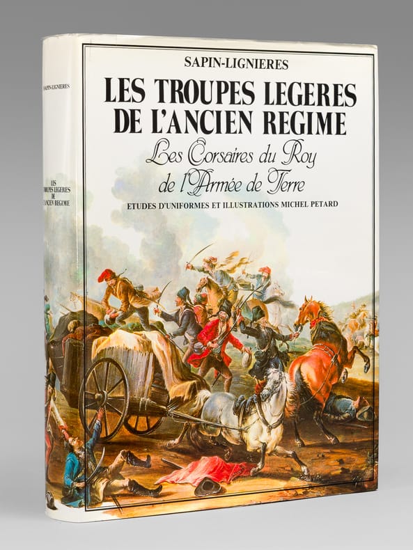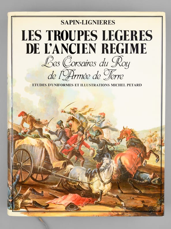 Saint-Julien-du-Sault, Presses Saltusiennes / François-Pierre Lobies Editeur, De re militari, 1979, in-4 rel. pleine toile ed. (24,5 x 32), 397 p., E.O. tirée à 1500 exemplaires, préface de Christian Ariès, XVIII planches dont une partie en couleur (M. Pétard), 2 planches d'uniformes dans l'esprit de Gudenus (M. Pétard), 7 croquis de cavalerie par C. Parrocel, 20 croquis de sujets militaires vers 1710 par A. Watteau, manuscrit anonyme des Fusilliers de Montagne 175, nouveau recueil de F. Chereau, 5 planches en couleur du manuscrit de Valenciennes, 3 planches en coul. du Recueil des Troupes du Roi. Manuscrit de 1768, impression sur papier canson ivoire et blanc pour les planches, jaquette, nom manuscrit en page de garde, bon état.