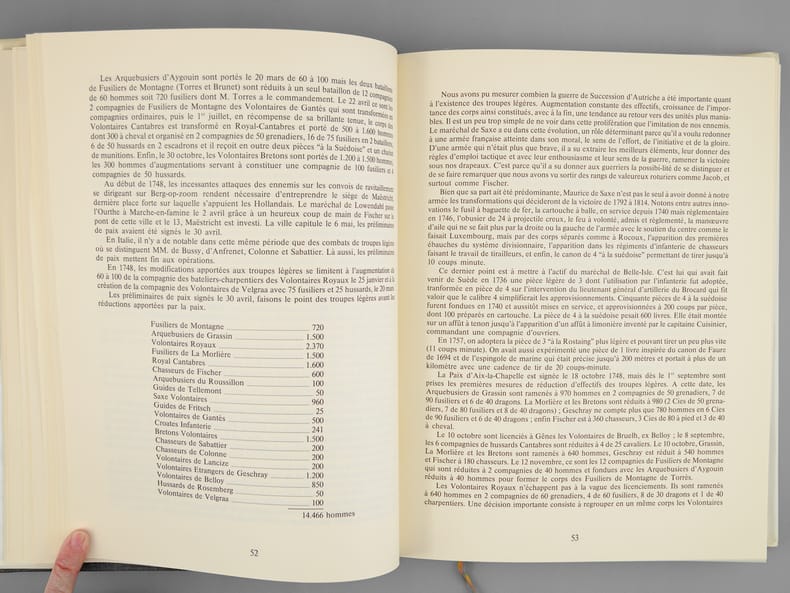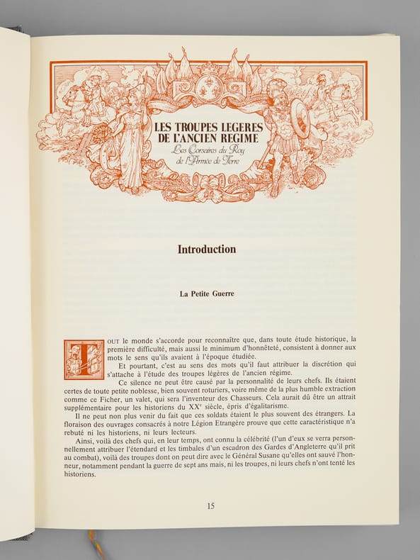 "Tout le monde s'accorde pour reconnaître que, dans toute étude historique, la première difficulté, mais aussi le minimum d'honnêteté, consistent à donner aux mots le sens qu'ils avaient à l'époque étudiée. Et pourtant, c'est au sens des mots qu'il faut attribuer la discrétion qui s'attache à l'étude des troupes légères de l'ancien régime. Pour avoir souvent utilisé avec fruit les remarquables ouvrages du Général Susane : "Histoire de l'Infanterie Française" et "Histoire de la Cavalerie Française", nous avons adopté son mode de présentation : une étude d'ensemble permettant de mieux saisir les causes, effets, conséquences des mesures prises pour les troupes légères, sans toutefois prétendre refaire l'histoire militaire des guerres de l'ancien régime. Chaque troupe citée, même à l'échelon compagnie est dotée d'un numéro d'ordre ; dans une deuxième partie, une notice détaillée pour chaque unité présentera l'historique, les campagnes, les effectifs, les uniformes les chefs les plus marquants. In fine, une table onomastique pourra faciliter les recherches". Voir le sommaire sur photos jointes.