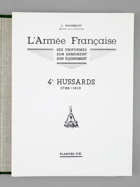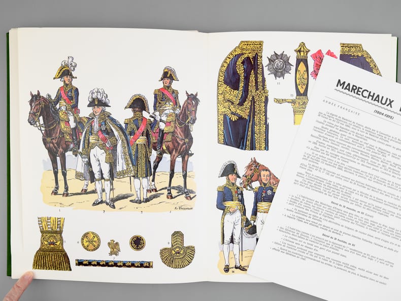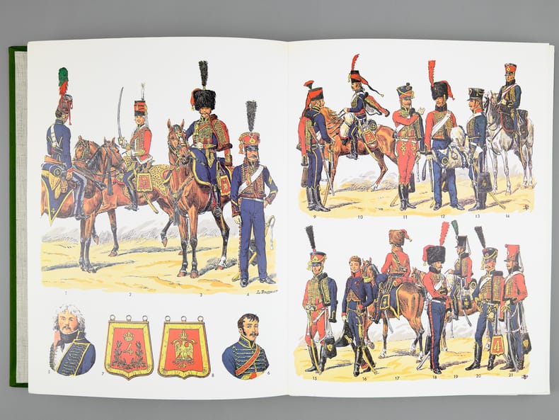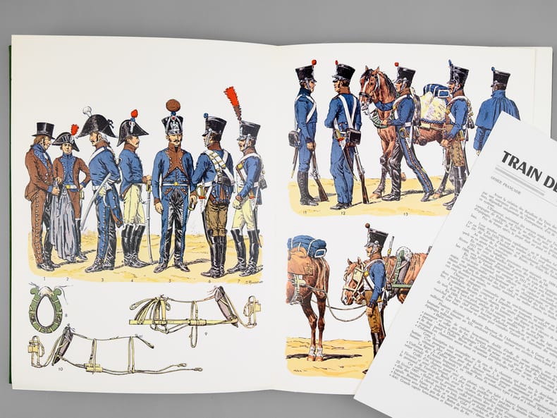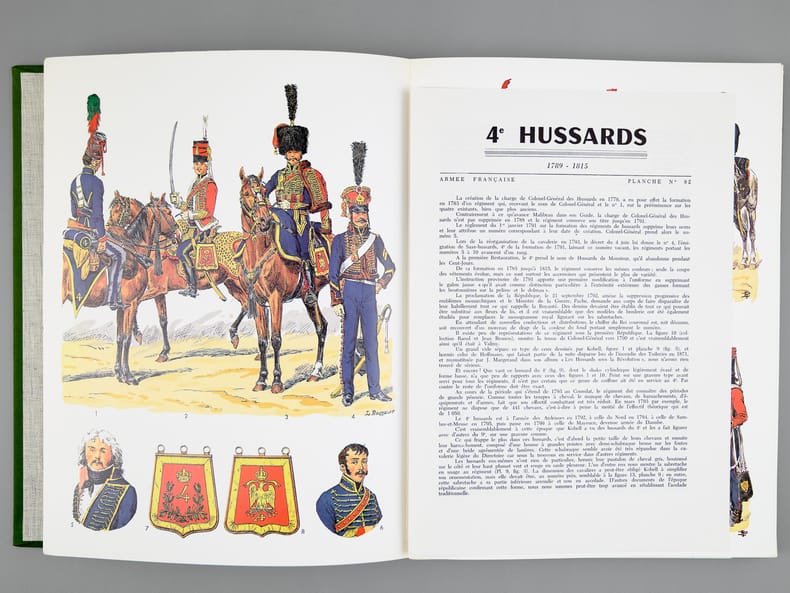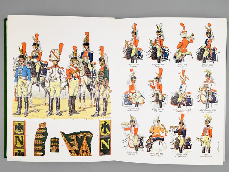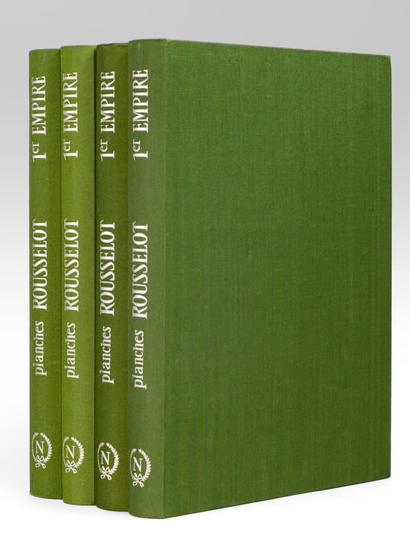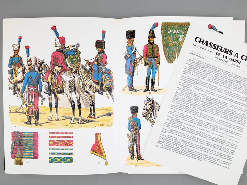 4 chemise pleine toile verte éditeur sous étui vert, P.S. Diffusion, 1978, 1979, 1980-1981, [ 1982 ], Contient les planches : Classeur I : 1 -Chevau-légers-lanciers 1811-1815 ; 2 - Carabiniers 1810-1815 ; 3 - Infanterie de ligne - fusiliers 1804-1812 ; 5 - Infanterie légère, généralités 1804-1813 ; 7 - Dragons 1804-1815 ; 9 : Hussards Généralités 1790-1804 ; 11 - Chasseurs à cheval, généralités 1804-1814 ; 13 - Garde Impériale, dragons 1806-1814 (1967) ; 15 - Cuirassiers 1804-1810 ; 17 - Infanterie de la ligne, compagnies d'élite 1804-1813 ; 20 - Dragons, trompettes et sapeurs 1804-1814 ; 22 - Hussards, généralités 1804-1812 ; 23 - Garde Impériale, grenadiers à cheval 1804-1815 ; 25 - Dragons, officiers 1804-1815 ; 28 - Artillerie à pied 1804-1815 ; 30 - Carabiniers 1810-1815 ; 31 - Marins de la Garde Impériale 1803-1815 (1) ; Classeur II : 32 - Marins de la Garde Impériale 1803-1815 (2) ; 33 - Infanterie légère, compléments 1804-1813 ; 36 - Artillerie à cheval 1804-1815 ; 37 - Cuirassiers 1810-1815 ; 40 - Grenadiers à pied de la Garde 1800-1815 ; 44 - Carabiniers 1804-1810 ; 45 - Grenadiers à cheval, trompettes 1804-1815 ; 46 - Cuirassiers, officiers 1804-1815 ; 47 - Chevau-légers, polonais de la Garde 1807-1814 ; 48 - Infanterie de ligne 1812-1815 ; 49 - Chasseurs à cheval, officiers 1804-1814 ; 52 - Artillerie à cheval, officiers et trompettes 1804-1815 ; 53 - Garde Impériale, dragons 1806-1814 (II) ; 54 - Hussards, officiers 1804-1815 ; 57 - Hussards, schémas 1804-1812 ; Classeur III : 58 - Chasseurs à pied de la Garde 1800-1815 ; 60 -Artillerie à cheval de la Garde 1800-1815 ; 61 : Gendarmerie Nationale 1791-1800 ; 62 - Infanterie de ligne, officiers 1804-1815 ; 63 - Grenadiers à pied de la Garde (tête de colonne) 1800-1815 ; 65 - Chevau-léger polonais, de la Garde, trompettes 1807-1814 ; 66 - Artillerie à pied 1804-1815 ; 68 - Garde Impériale 2e régiment de chevau-légers, lanciers 1810-1815 ; 69 - Chasseur à cheval de la Garde 1800-1815 (1) ; 70 - Chasseur à cheval de la Garde 1800-1815 (2) ; 71 - Officiers, généraux 1803-1815 ; 74 - Artillerie à cheval de la Garde, officiers et trompettes 1800-1815 ; 75 - Chevau-légers polonais de la Garde, officiers 1807-1815 ; 76 - Infanterie légère 1812-1815 ; 77 - Chevau-légers lanciers 1811-1815 ; 80 - Train d'artillerie de la Garde 1800-1815 ; 81 - Officiers d'état major, aides de camp 1803-1815 ; Classeur IV : 82 - 4e régiment de hussards 1790-1815 ; 83 - Chasseurs à cheval de la Garde, trompettes 1800-1815 ; 85 - Artillerie à pied de la Garde 1808-1815 ; 86 - Dragons, compléments 1804-1815 ; 88 -2e chevau-légers de la Garde, trompette et officiers 1810-1815 ; 89 - Infanterie de ligne, têtes de colonnes 1804-1812 ; 90 - Train des équipages 1807-1815 ; 91 - Cuirassiers, trompettes 1804-1812 ; 94 - Chasseurs à cheval de la Garde, officiers 1800-1815 ; 95 - Gendarmerie d'élite de la Garde 1801-1815 ; 96 - Dragons, complément 1804-1815 ; 97 - Chasseurs à cheval, trompettes 1804-1815 ; 100- Maréchaux d'empire 1804-1815 ; 101- Fusiliers de la Garde 1806-1814 ; 102 - Cuirassiers, trompettes (II)1804-1812 ; 103 Sapeurs du génie de la Garde 1811-1815 ; 106 - Train d'élite de la Garde, officiers, sous-officiers et trompettes 1800-1815 et 2 planches jointes "Le Plumet" D7 et D3 : Royaume de Bavière I et II Drapeaux 1806-1813