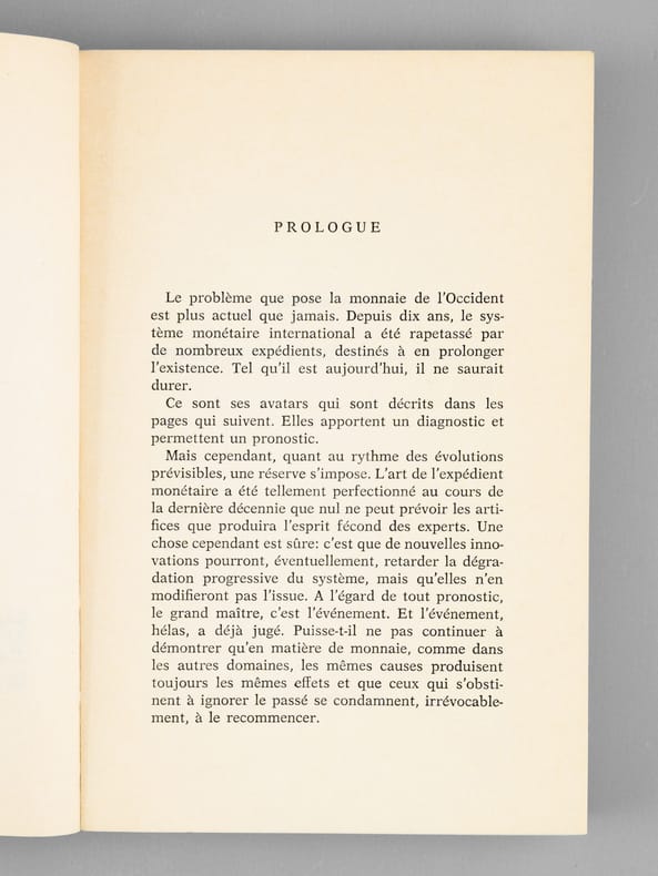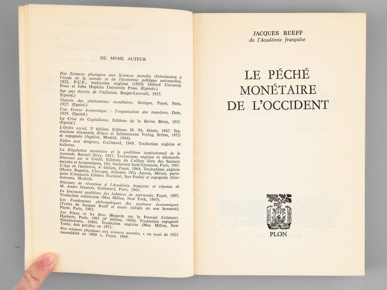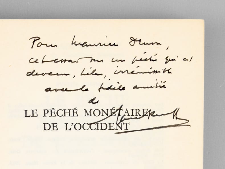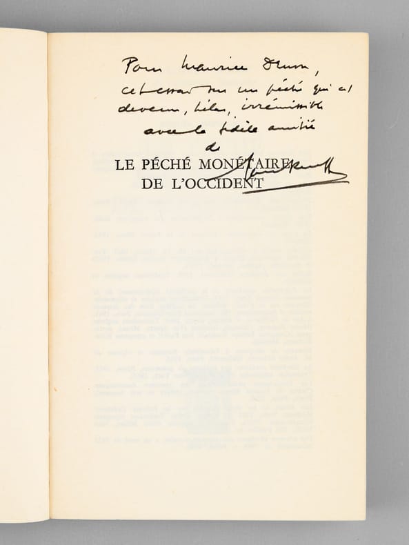Avec un bel envoi : "Pour Maurice Druon, cet essai sur un péché qui est devenu, hélas, irréverssible. Avec la fidèle amitié de Jacques Rueff". Maurice Druon (1918-2009), neveu de Joseph Kessel, fut résistant, écrivain auteur notamment de la saga des Rois maudits, homme politique. Elu à l'Académie Française en 1968, il en devint le Secrétaire Perpétuel en 1985. Jacques Rueff, quant à lui, avait été élu à l'Académie en 1964. Etat très satisfaisant (rares annotations en marge par Maurice Druon) pour cet exemplaire d'une origine prestigieuse.