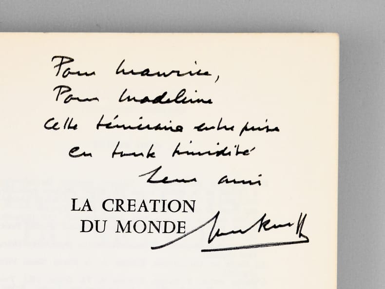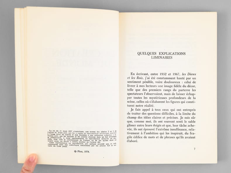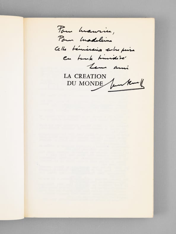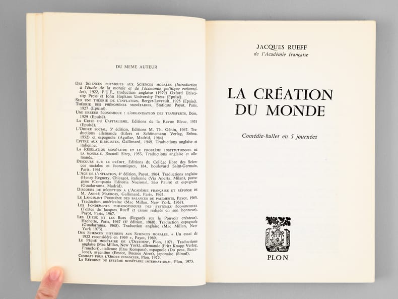 Avec un bel envoi : "Pour Maurice, pour Madeleine, cette téméraire entreprise, en toute humilité. Son Ami Jacques Rueff". Le dédicataire était Maurice Druon (1918-2009), neveu de Joseph Kessel, résistant, écrivain auteur notamment de la saga des Rois maudits, homme politique. Elu à l'Académie Française en 1968, il en devint le Secrétaire Perpétuel en 1985. Jacques Rueff, quant à lui, avait été élu à l'Académie en 1964. Bon état pour cet exemplaire d'une origine prestigieuse. Ce petit livre est un approfondissement, sous une forme très originale, des thèmes déjà présentés en 1968 par Jacques Rueff dans son ouvrage intitulés Les Dieux et Les Rois.