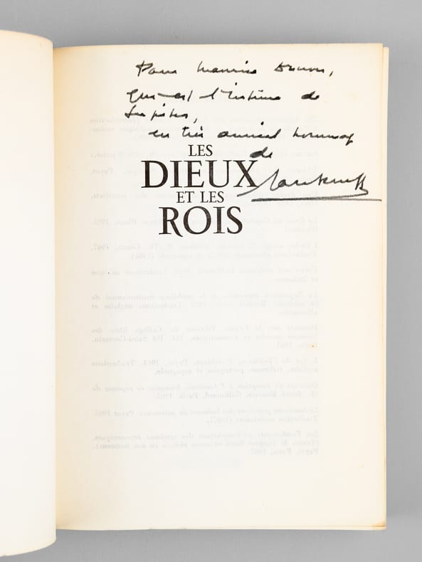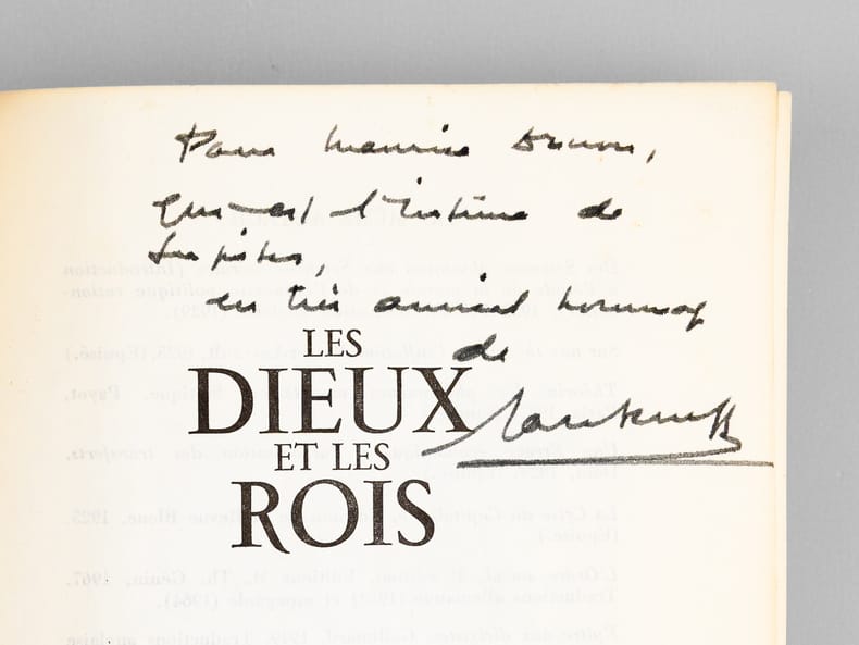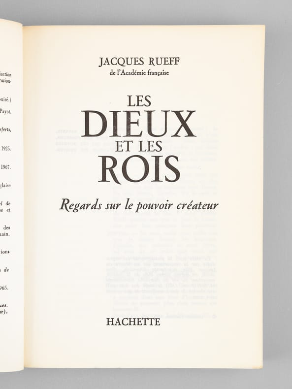 Avec un bel envoi : "Pour Maurice Druon, qui est l'intime de ces [...], en très amical homage de Jacques Rueff". Le dédicataire était Maurice Druon (1918-2009), neveu de Joseph Kessel, qui fut résistant, écrivain auteur notamment de la saga historique des Rois maudits, et homme politique. Elu à l'Académie Française en 1968, il en devint le Secrétaire Perpétuel en 1985. Jacques Rueff, quant à lui, avait été élu à l'Académie en 1964. Bon état pour cet exemplaire d'une origine prestigieuse.