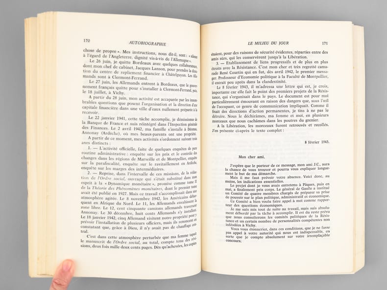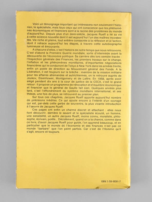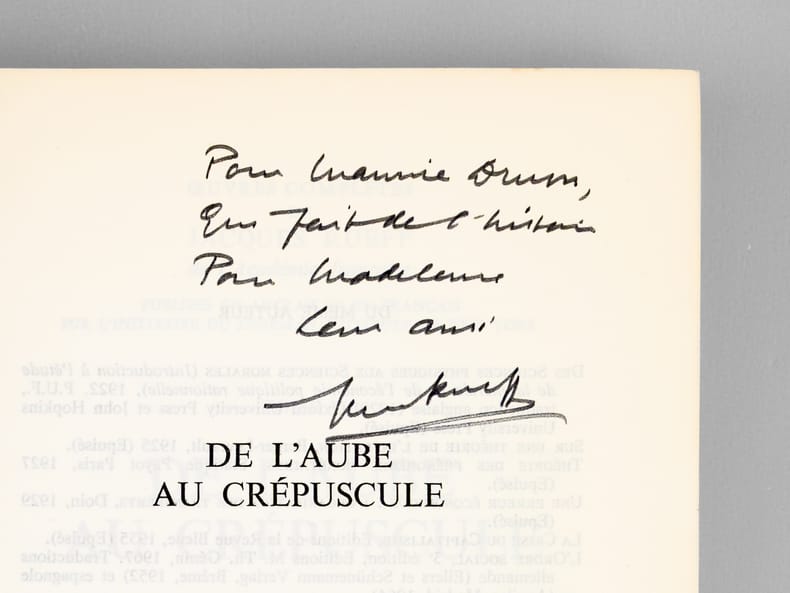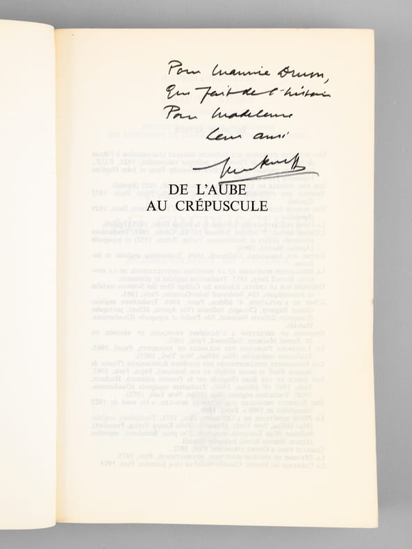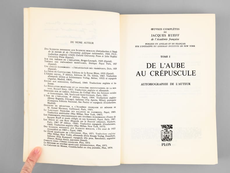 Avec un bel envoi : "Pour Maurice Druon, qui fait de l'histoire. Pour Madeleine, leur ami, Jacques Rueff". Les dédicataires étaient Maurice Druon (1918-2009) et son épouse. Maurice Druon, qui était neveu de Joseph Kessel, fut résistant, écrivain auteur notamment de la saga historique des Rois maudits, et homme politique. Elu à l'Académie Française en 1968, il en devint le Secrétaire Perpétuel en 1985. Jacques Rueff, quant à lui, avait été élu à l'Académie en 1964. Bon état pour cet exemplaire d'une origine prestigieuse.