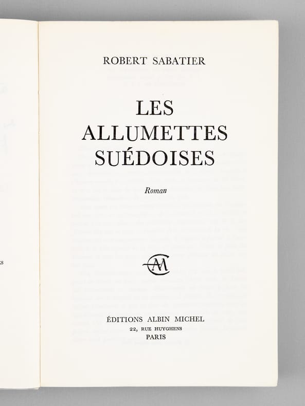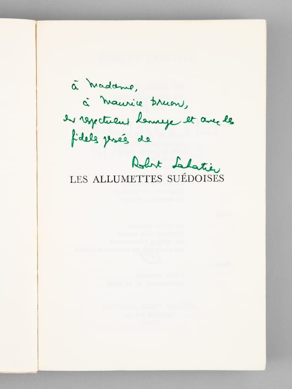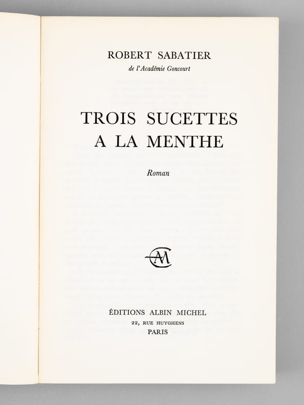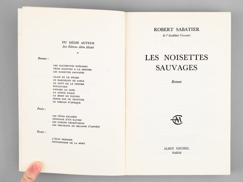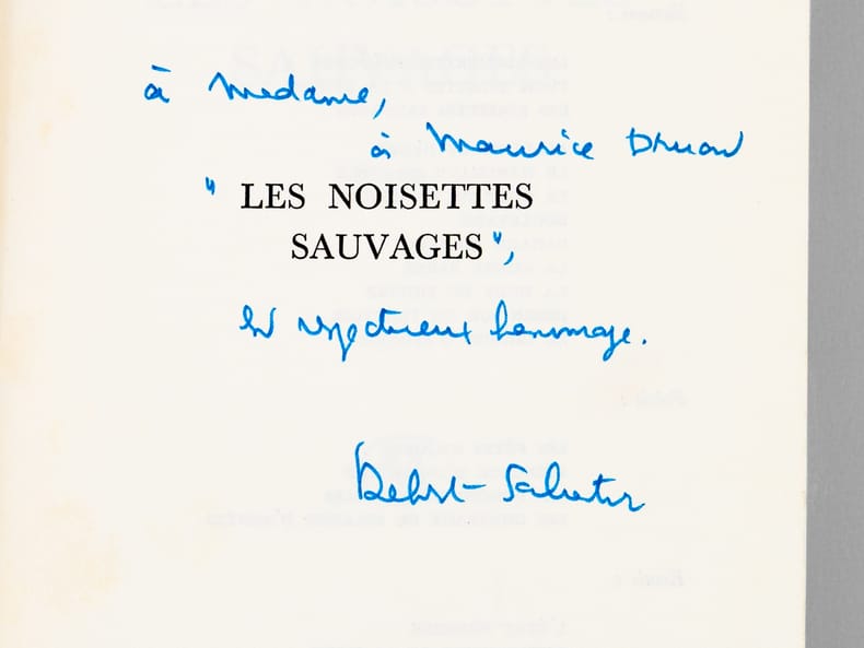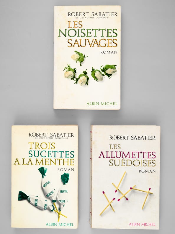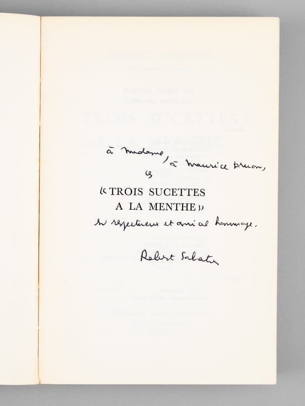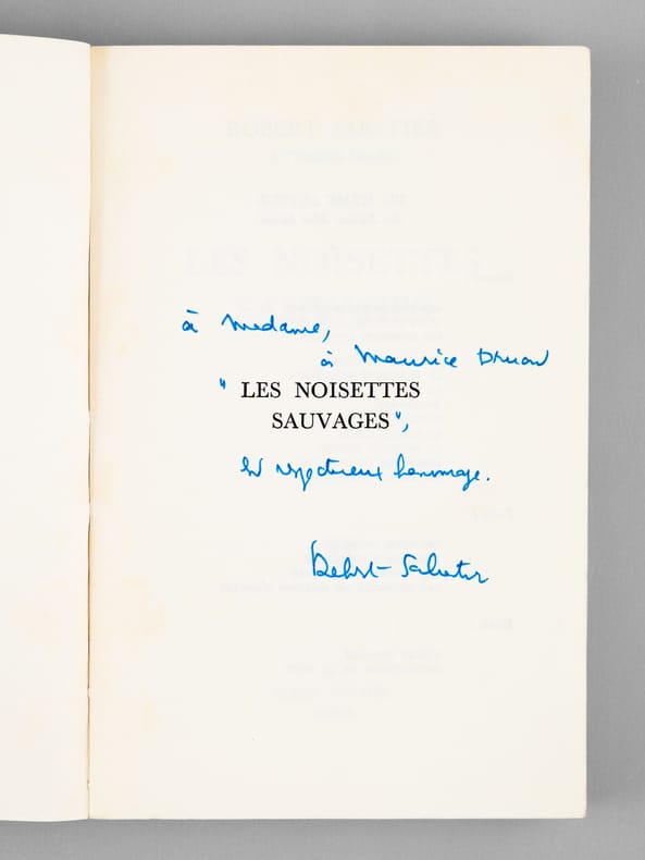 Etat satisfaisant (couv. frottées, intéireur propre par ailleurs) pour ces exemplaires d'une origine prestigieuse. Envois ms. de l'auteur à l'académicien Maurice Druon et à son épouse : "A Madame, à Maurice Druon, en respectueux hommage et avec les fidèes pensées de Robert Sabatier" (Le allumettes); "A madame, à Maurice Druon, les trois sucettes à la menthe, en respectueux et amical hommage" ; "A madame, à Maurice Druon, Les noisettes sauvages en respectueux hommage". Prix pour l'ensemble.