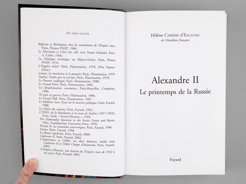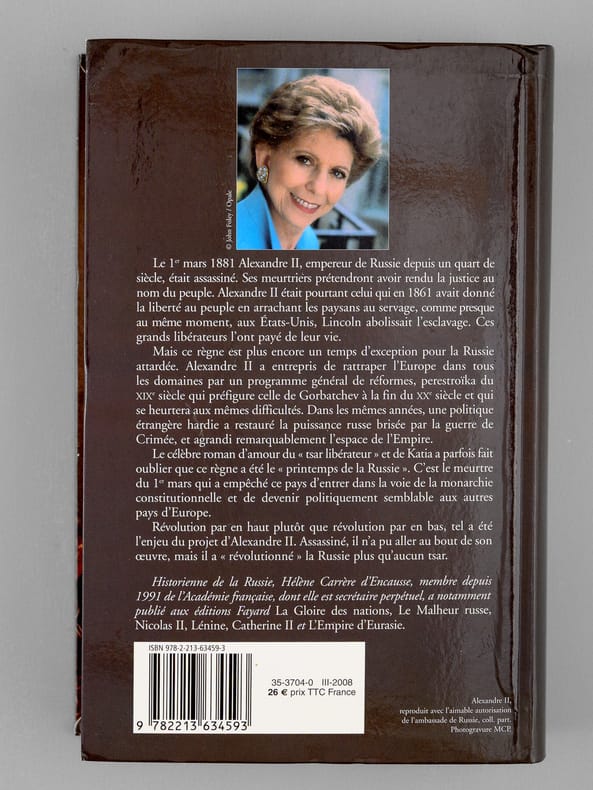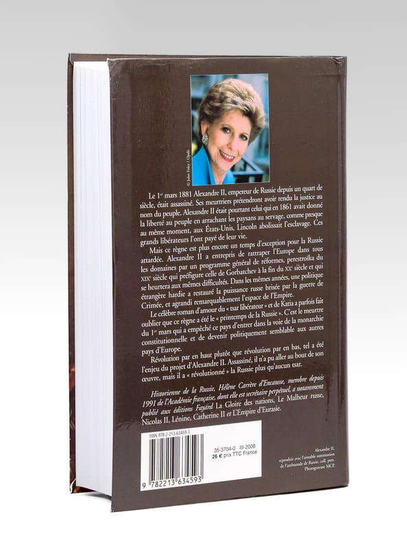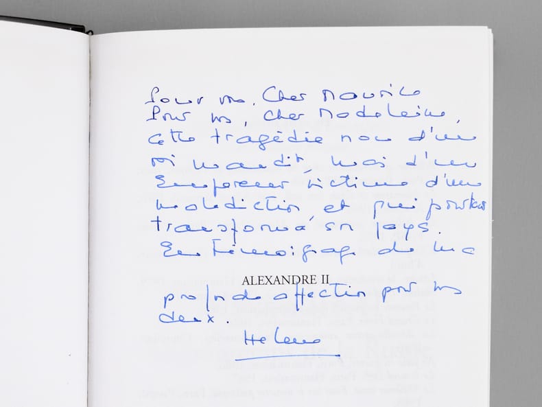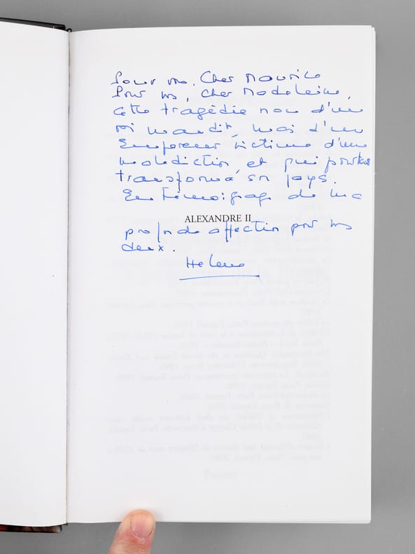 Superbe dédicace de l'auteur à l'académicien Maurice Druon (1918-2009), qui était lui-même d'ascendance russe (il était neveu de Joseph Kessel) : "Pour vous Cher Maurice, pour vous Chère Madeleine, cette tragédie non d'un roi maudit mais d'un Empereur victime d'une malédiction, et qui pourtant transforma son pays. En témoignage de ma profonde affection pour vous deux." Maurice Druon, auteur notamment de la célèbre saga historique des Rois maudits, fut élu à l'Académie Française en 1968, et il en devint le Secrétaire Perpétuel, de 1985 à 1999. Hélène Carrère d'Encausse, élue à l'Académie en 1990, remplaça Maurice Druon à la tête de cette institution. Bon état pour cet exemplaire d'une provenance exceptionnelle.