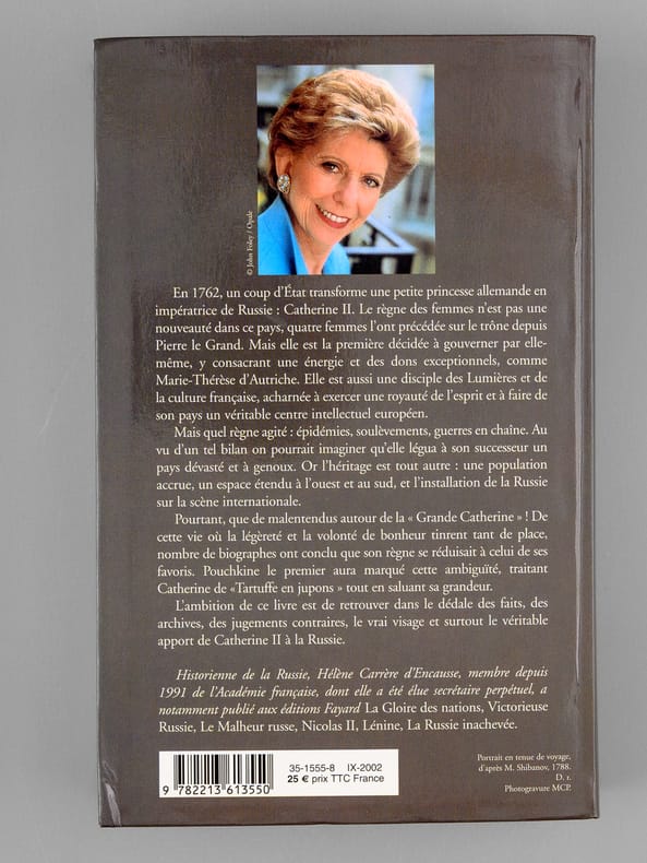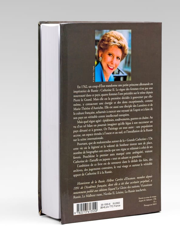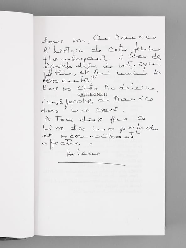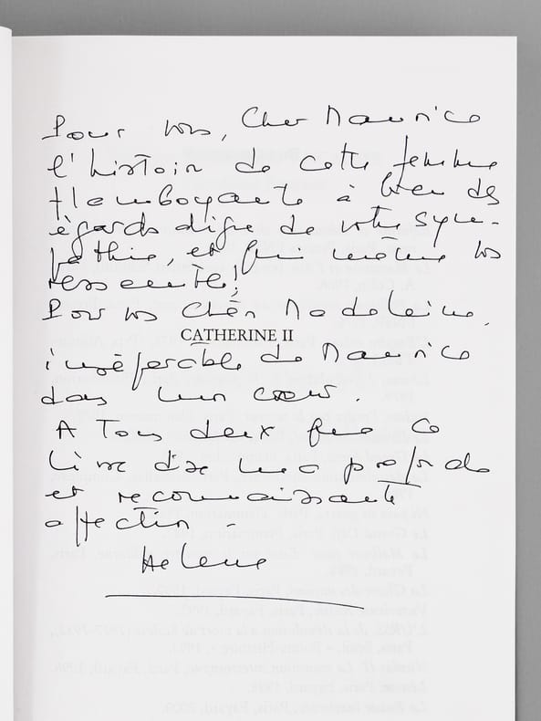Superbe dédicace de l'auteur à l'académicien Maurice Druon (1918-2009), qui était lui-même d'ascendance russe (il était neveu de Joseph Kessel), et à son épouse : "Pour vous Cher Maurice, l'histoire de cette femme flamboyante à bien des égards digne de votre sympathie, et qui même vous ressemble. Pour vous Chère Madeleine, inséparable de Maurice, dans un même coeur. Atous deux, que ce livre dise ma profonde et reconnaissante affection." Maurice Druon, auteur notamment de la célèbre saga historique des Rois maudits, fut élu à l'Académie Française en 1968, et il en devint le Secrétaire Perpétuel, de 1985 à 1999. Hélène Carrère d'Encausse, élue à l'Académie en 1990, remplaça Maurice Druon à la tête de cette institution. Bon état pour cet exemplaire d'une provenance exceptionnelle.