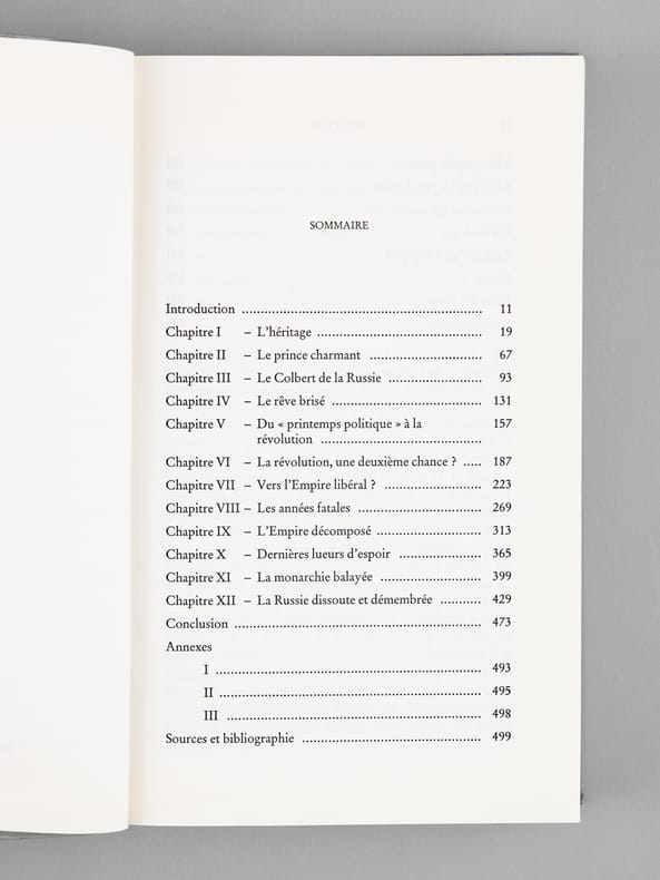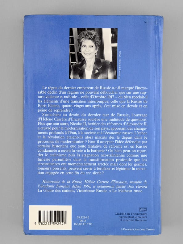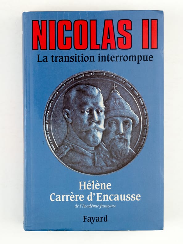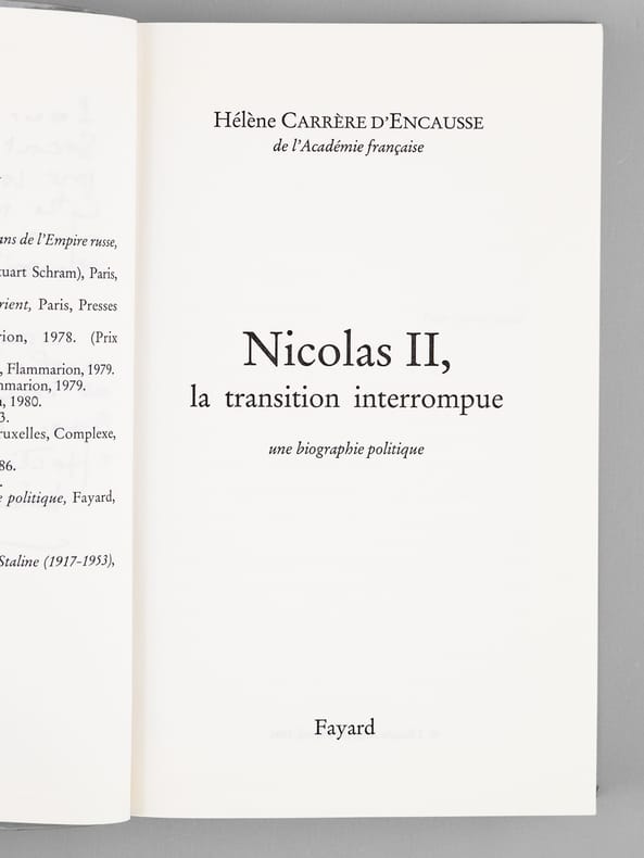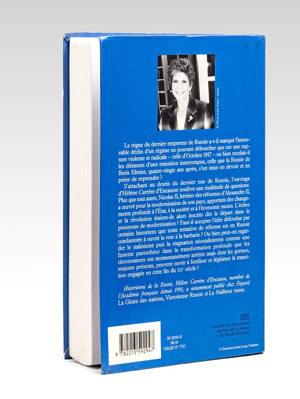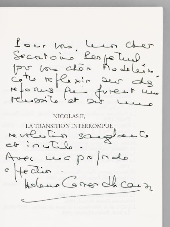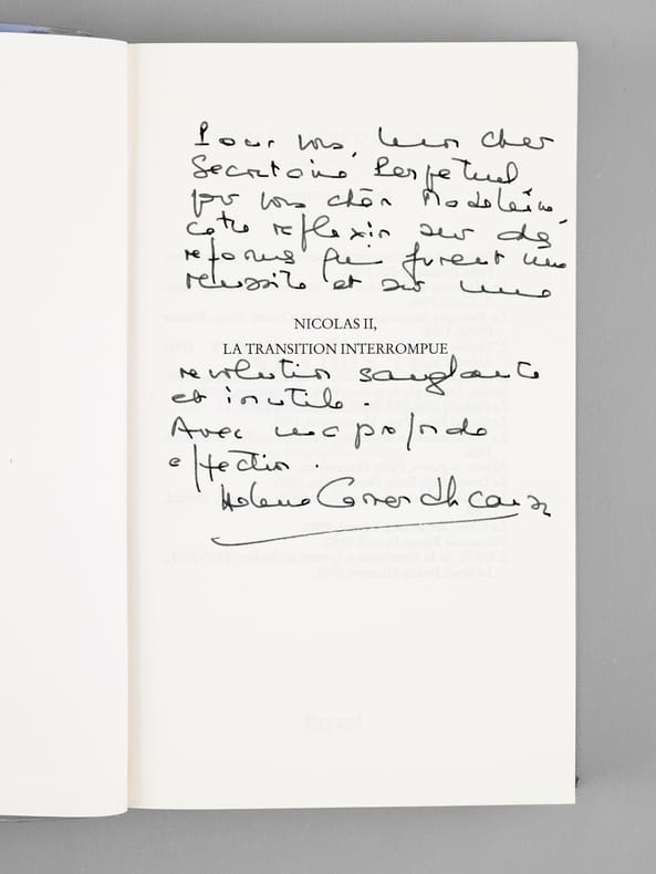 Superbe dédicace de l'auteur à l'académicien Maurice Druon (1918-2009), qui était lui-même d'ascendance russe (il était neveu de Joseph Kessel), et à son épouse : "Pour vous, mon cher Secrétaire Perpétuel, pour vous chère Madeleine, cette réflexion sur des réformes qui furent une réussite et sur une révolution sanglante et inutile. Avec ma profonde affection." Maurice Druon, auteur notamment de la célèbre saga historique des Rois maudits, fut élu à l'Académie Française en 1968, et il en devint le Secrétaire Perpétuel, de 1985 à 1999. Hélène Carrère d'Encausse, élue à l'Académie en 1990, remplaça Maurice Druon à la tête de cette institution. Bon état pour cet exemplaire d'une provenance exceptionnelle.