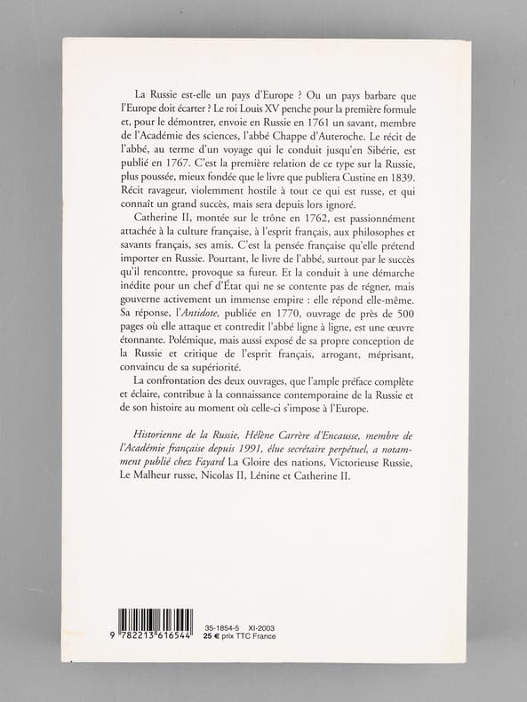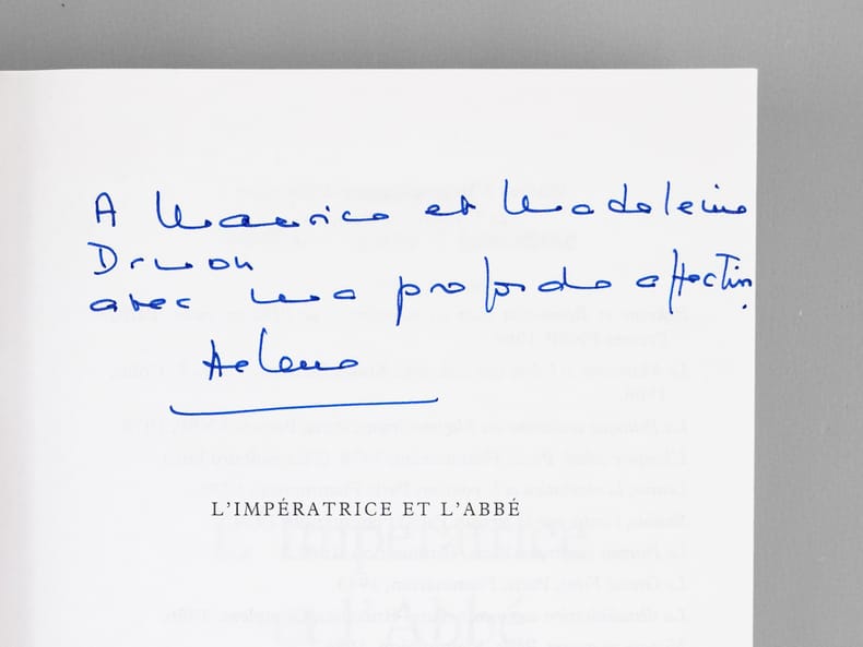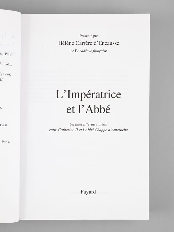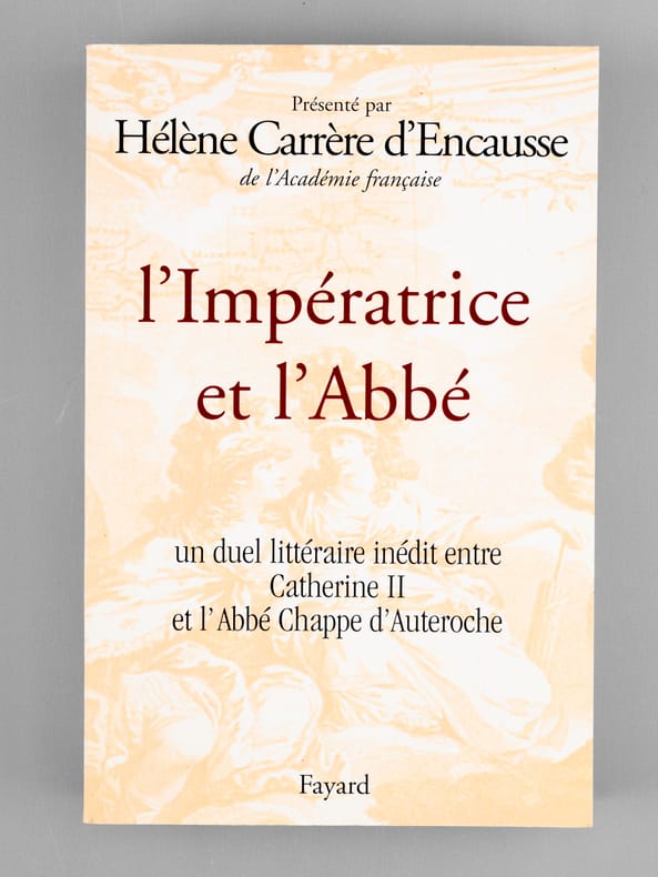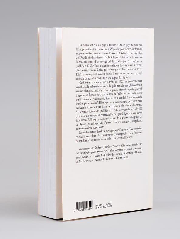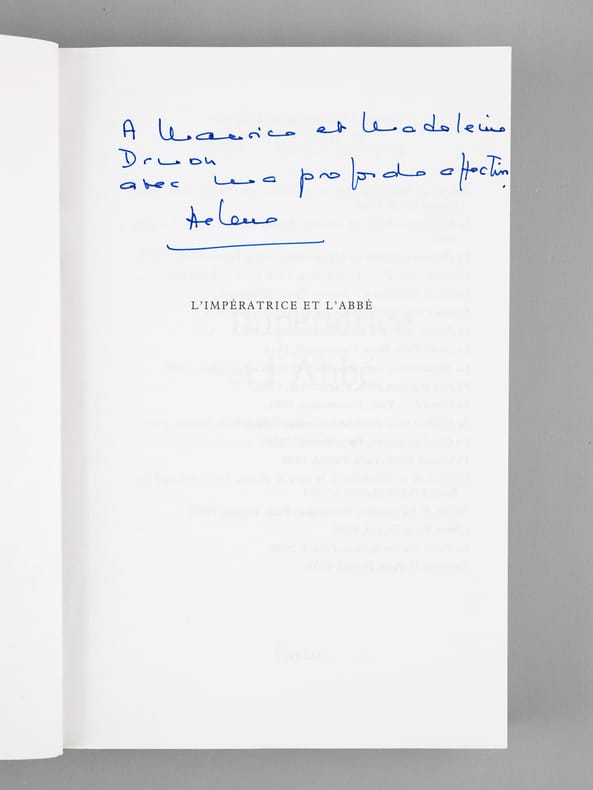 Dédicace de l'auteur à l'académicien Maurice Druon (1918-2009), qui était lui-même d'ascendance russe (il était neveu de Joseph Kessel), et à son épouse : "A Maurice et Madeleine Druon, avec ma profonde affection." Maurice Druon, auteur notamment de la célèbre saga historique des Rois maudits, fut élu à l'Académie Française en 1968. Il en devint le Secrétaire Perpétuel, de 1985 à 1999. Hélène Carrère d'Encausse, élue à l'Académie en 1990, remplaça Maurice Druon à la tête de cette institution. Bon état pour cet exemplaire d'une provenance exceptionnelle.