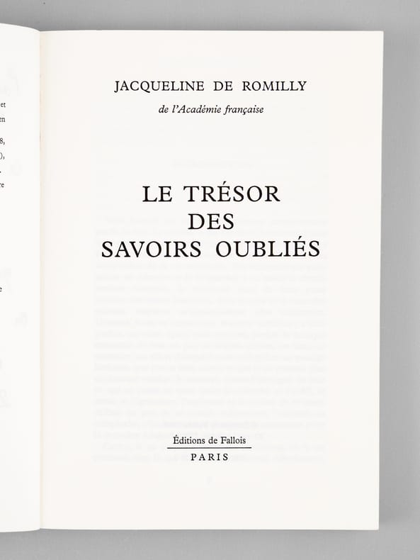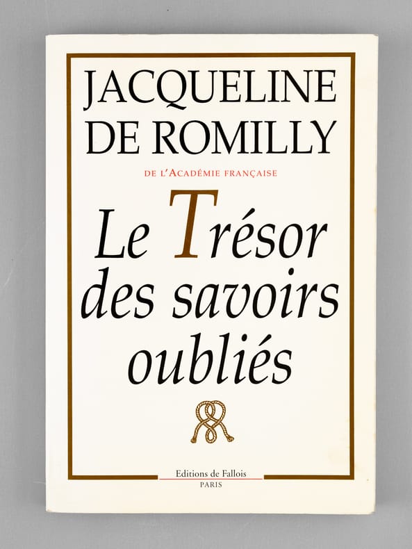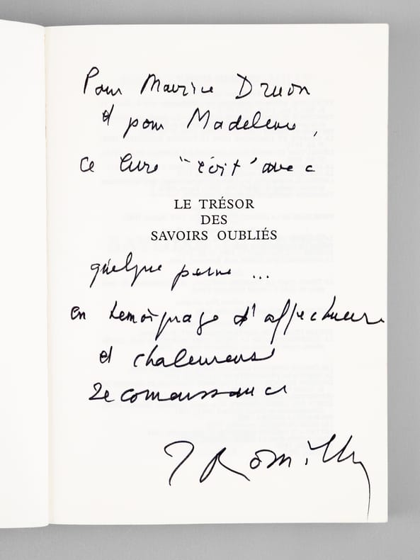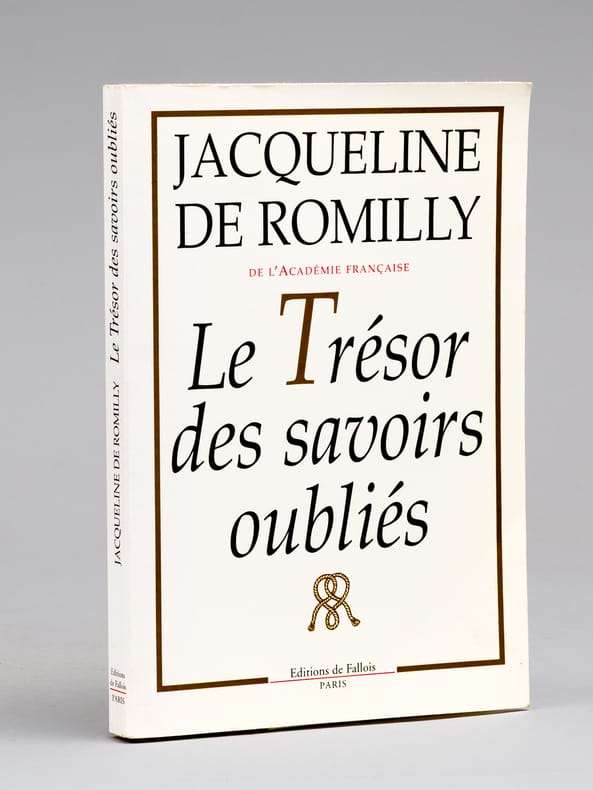 Bel envoi de l'auteur à l'académicien Maurice Druon et à son épouse : "Pour Maurice Druon et pour Madeleine, ce livre "écrit" avec quelque peine... En témoignage d'affectueuse et chaleureuse reconnaissance." Maurice Druon (1918-2009), auteur notamment de la célèbre saga historique des Rois maudits, fut élu à l'Académie Française en 1968. Il en devint le Secrétaire Perpétuel, de 1985 à 1999. Jacqueline de Romilly fut élue à l'Académie Française en 1988. Bon état pour cet exemplaire, d'une origine prestigieuse.