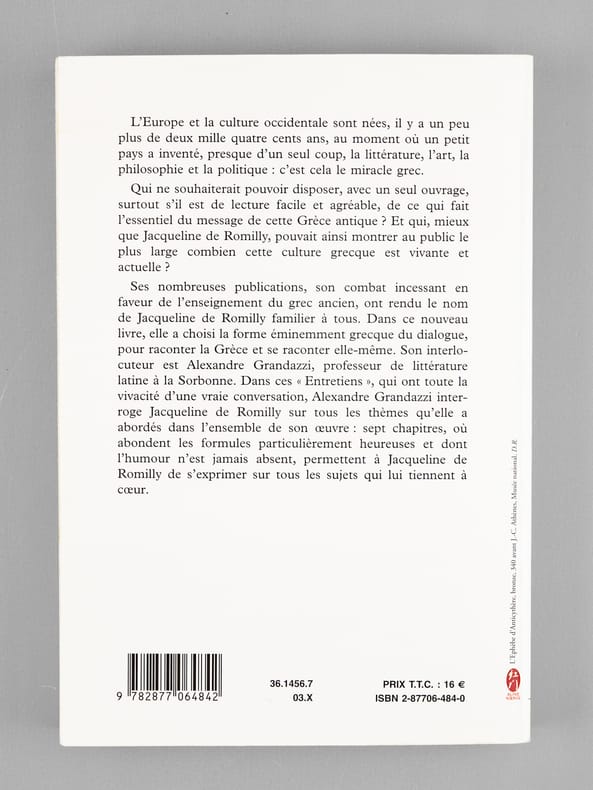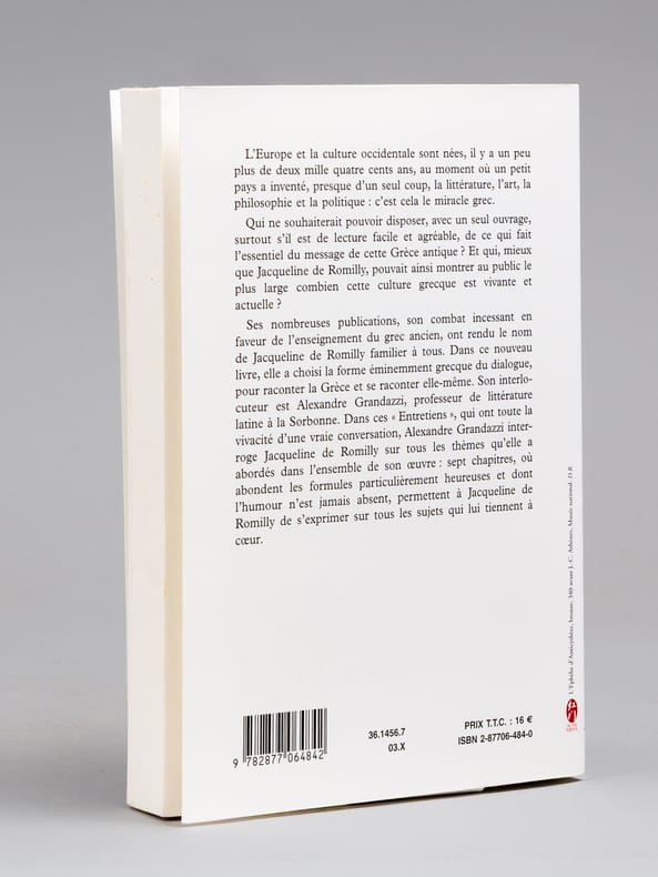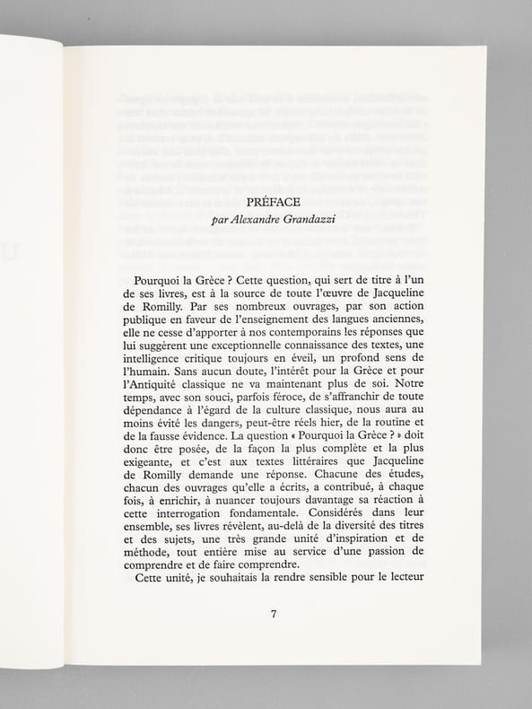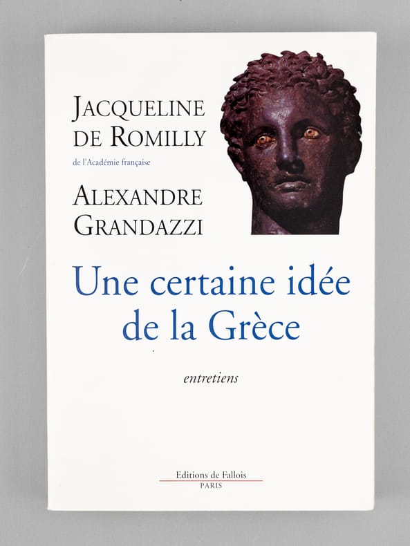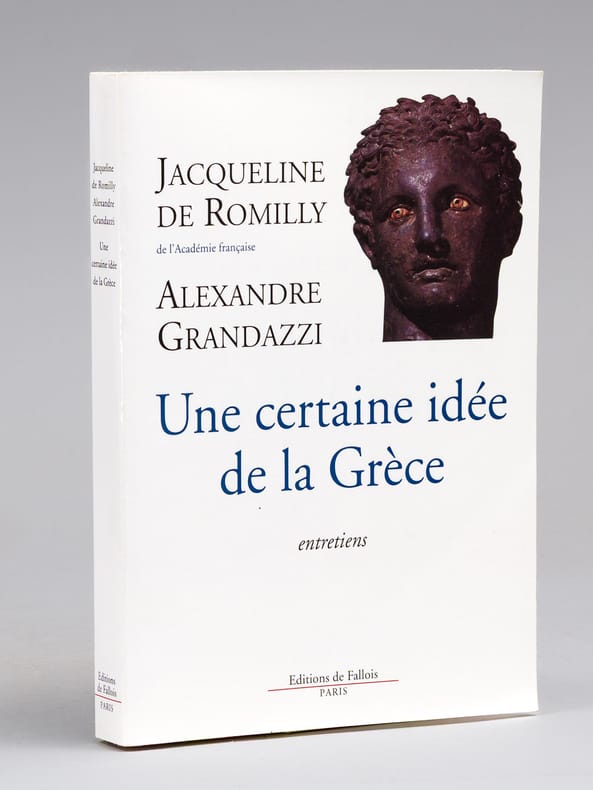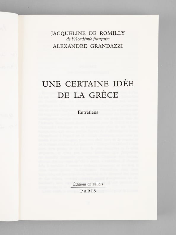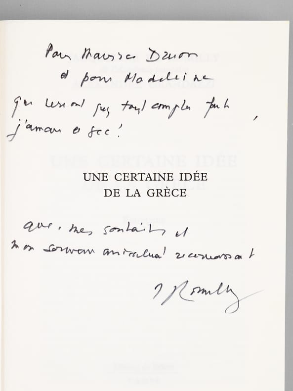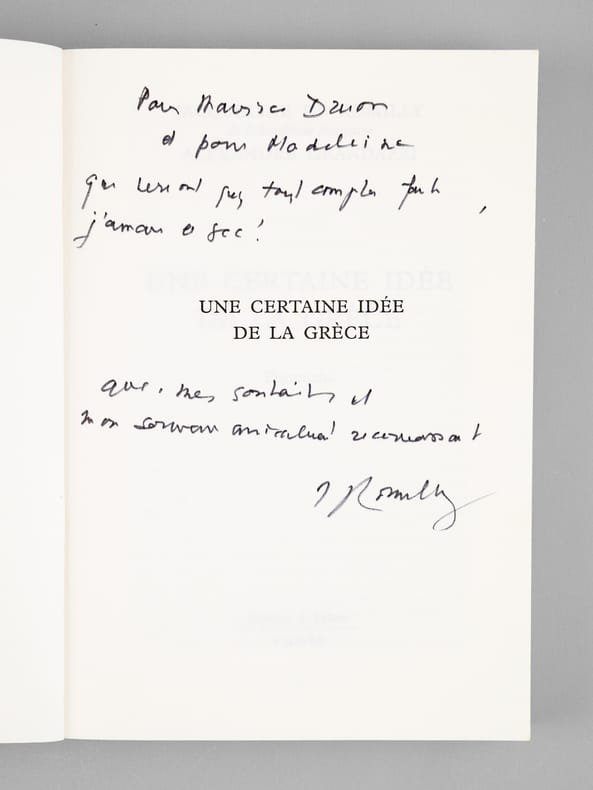 Bel envoi de l'auteur à l'académicien Maurice Druon et à son épouse : "Pour Maurice Druon et pour Madeleine, qui verront que tout compte fait, j'aimais le Grec. Avec mes souhaits et mon souvenir amicalement reconnaissant." Maurice Druon (1918-2009), auteur notamment de la célèbre saga historique des Rois maudits, fut élu à l'Académie Française en 1968. Il en devint le Secrétaire Perpétuel, de 1985 à 1999. Jacqueline de Romilly, quant à elle, fut élue à l'Académie Française en 1988. Bon état pour cet exemplaire, d'une origine prestigieuse.