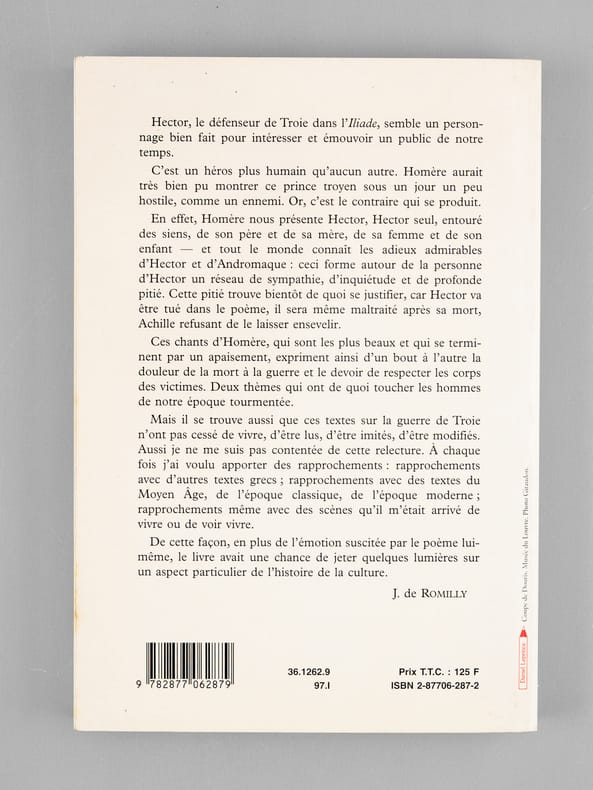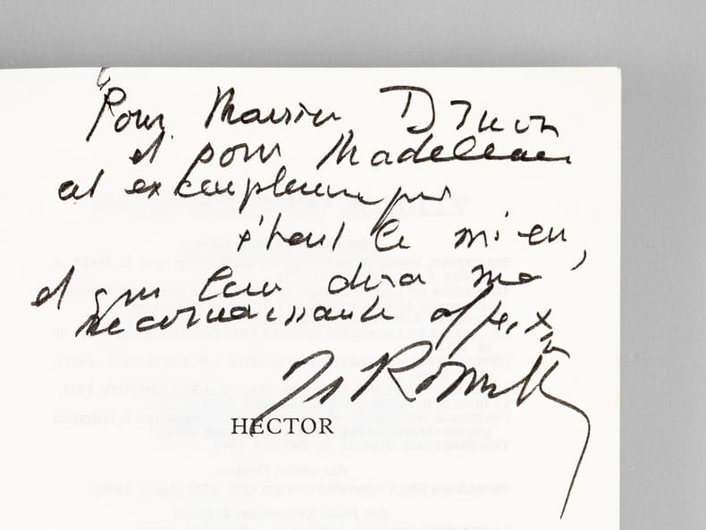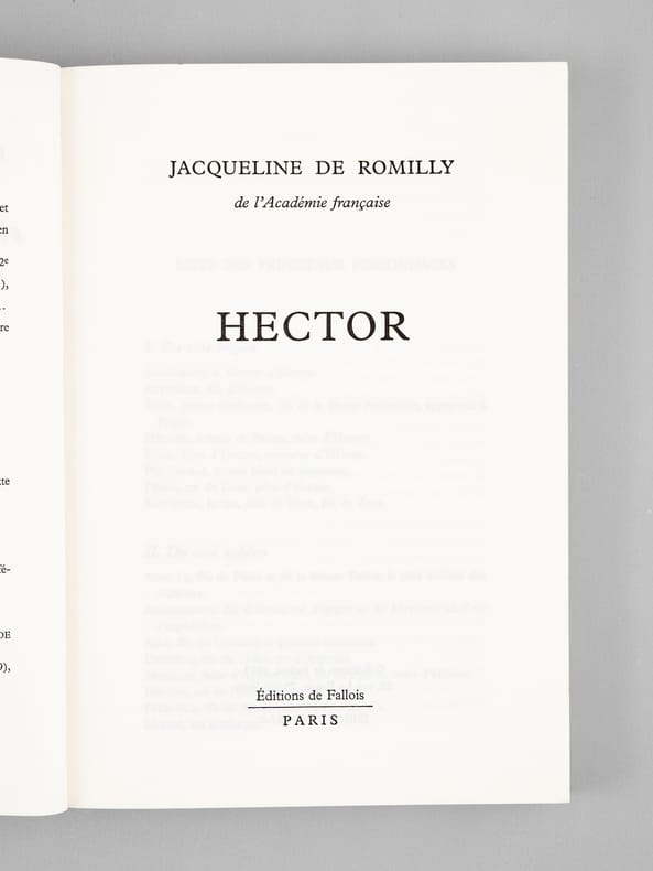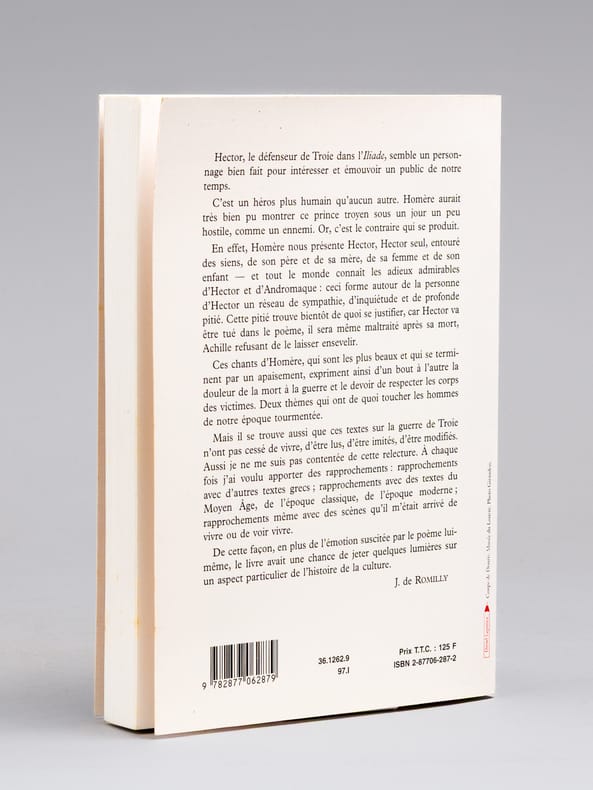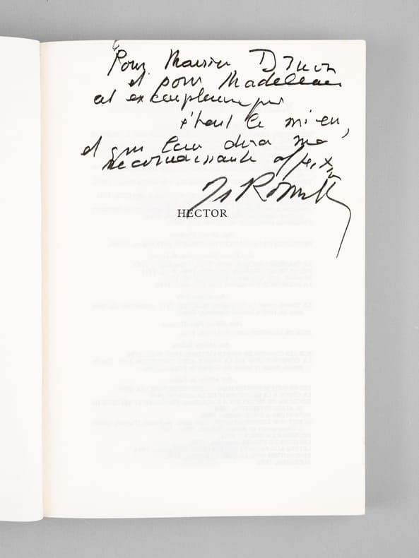 Bel envoi de l'auteur à l'académicien Maurice Druon et à son épouse : "Pour Maurice Druon et pour Madeleine, cet exemplaire qui était le mien et qui leur dira ma reconnaissante affection." Maurice Druon (1918-2009), auteur notamment de la célèbre saga historique des Rois maudits, fut élu à l'Académie Française en 1968. Il en devint le Secrétaire Perpétuel, de 1985 à 1999. Jacqueline de Romilly, quant à elle, fut élue à l'Académie Française en 1988. Etat très satisfaisant (lég. rouss. sur tr. sup., bon état par ailleurs) pour cet exemplaire, d'une origine prestigieuse.