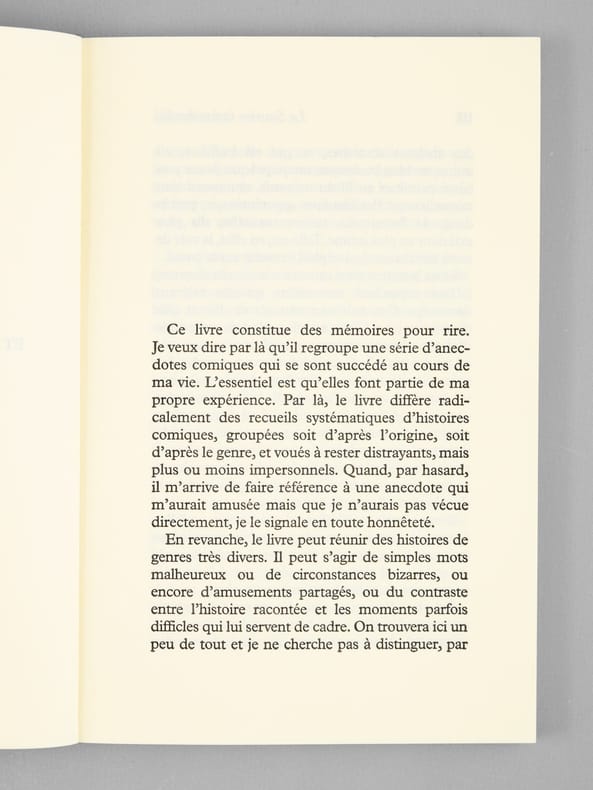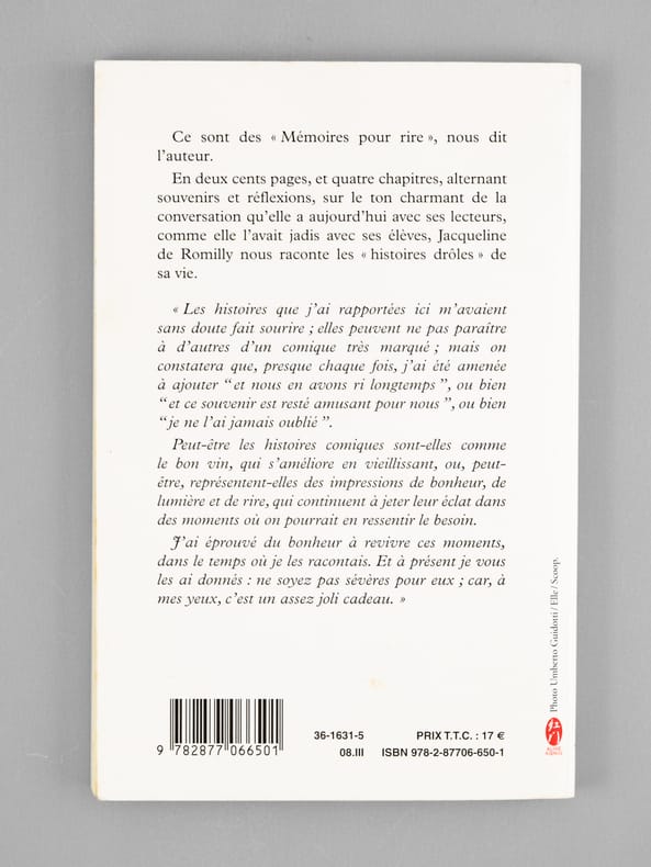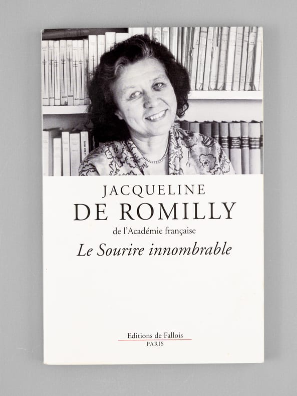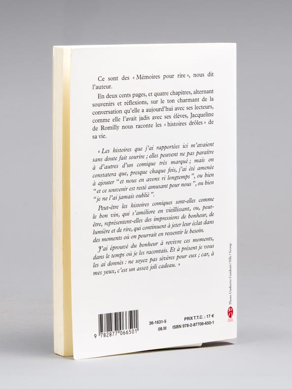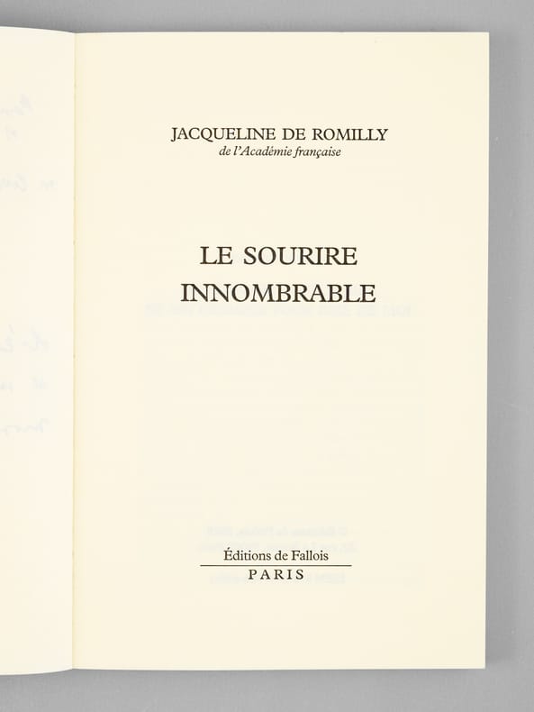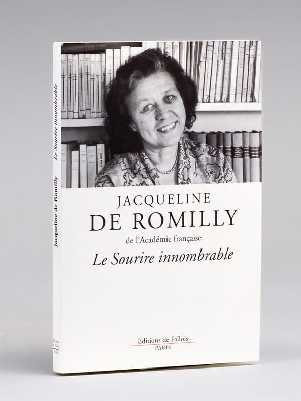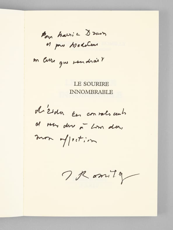 Bel envoi de l'auteur à l'académicien Maurice Druon et à son épouse : "Pour Maurice Druon et pour Madeleine, ce livre qui voudrait dérider les convalescents et vous dire à tous deux mon affection." Maurice Druon (1918-2009), auteur notamment de la célèbre saga historique des Rois maudits, fut élu à l'Académie Française en 1968. Il en devint le Secrétaire Perpétuel, de 1985 à 1999. Jacqueline de Romilly, quant à elle, fut élue à l'Académie Française en 1988. Etat très satisfaisant (lég. rouss. sur tr. sup., bon état par ailleurs) pour cet exemplaire, d'une origine prestigieuse. Le ton de la dédicace fait référence à la teneur de ce petit livre, qui est un recueuil d'histoires drôles vévues par l'auteur tout au long de sa vie.
