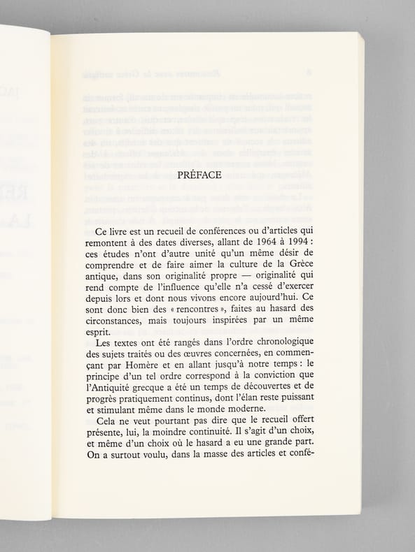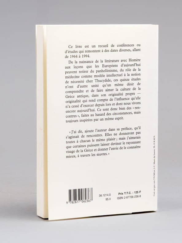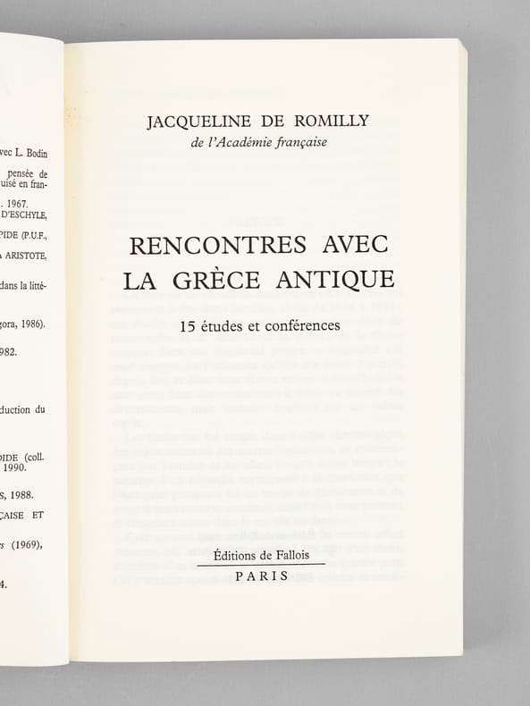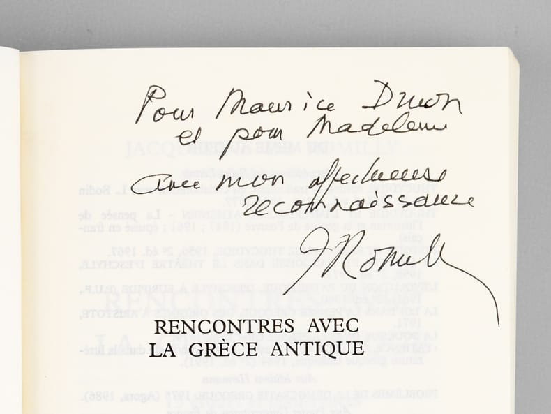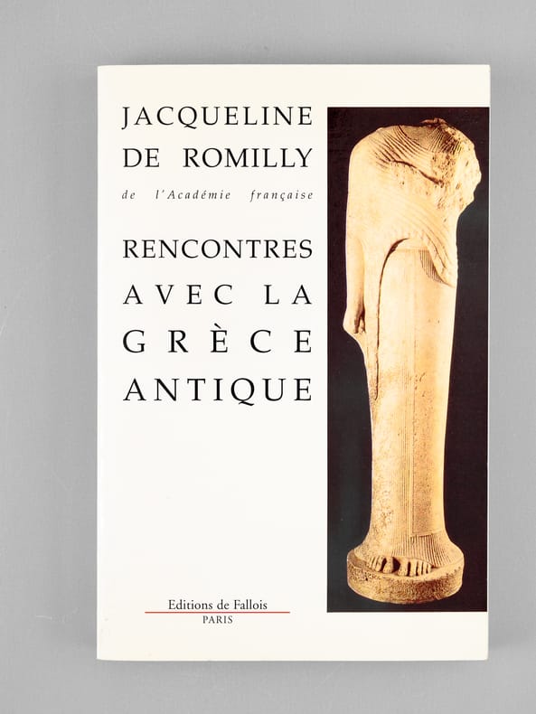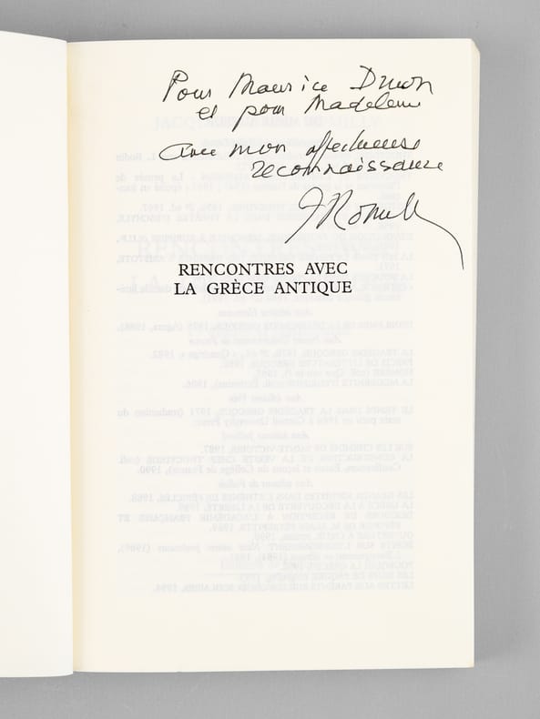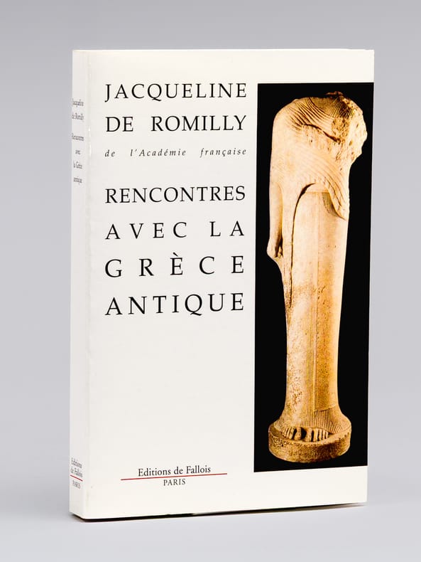 Envoi de l'auteur à l'académicien Maurice Druon et à son épouse : "Pour Maurice Druon et pour Madeleine, avec mon affectueuse reconnaissance." Maurice Druon (1918-2009), auteur notamment de la célèbre saga historique des Rois maudits, fut élu à l'Académie Française en 1968. Il en devint le Secrétaire Perpétuel, de 1985 à 1999. Jacqueline de Romilly, quant à elle, fut élue à l'Académie Française en 1988. Etat très satisfaisant (lég. rouss. sur tr. sup., bon état par ailleurs) pour cet exemplaire, d'une origine prestigieuse.