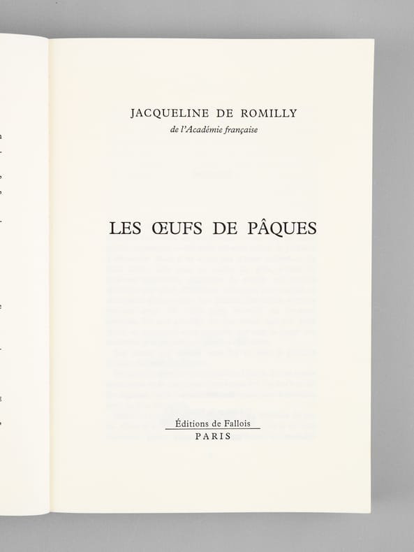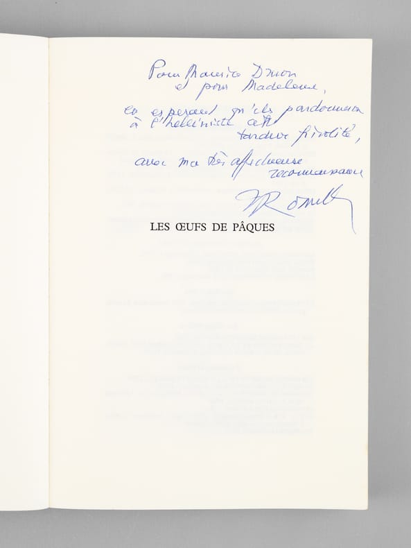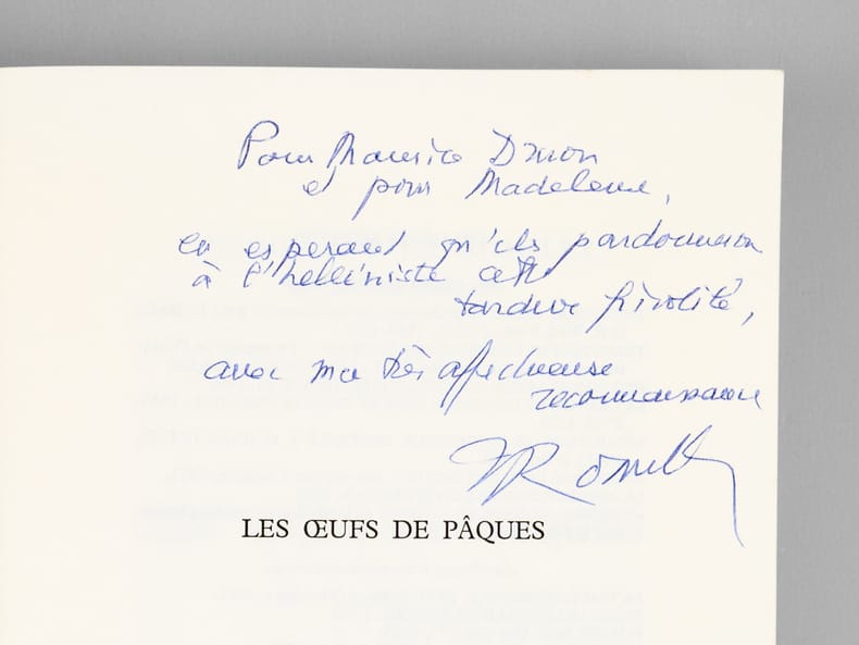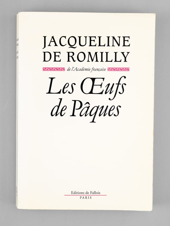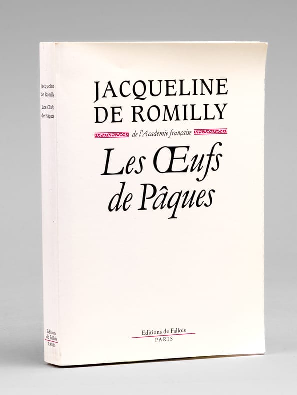 Bel envoi de l'auteur à l'académicien Maurice Druon et à son épouse : "Pour Maurice Druon et pour Madeleine, en espérant qu'ils pardonneront à l'helléniste cette tardive frivolité, avec ma très affectueuse reconnaissance." Maurice Druon (1918-2009), auteur notamment de la célèbre saga historique des Rois maudits, fut élu à l'Académie Française en 1968. Il en devint le Secrétaire Perpétuel, de 1985 à 1999. Jacqueline de Romilly, quant à elle, fut élue à l'Académie Française en 1988. Etat très satisfaisant (lég. rouss. sur tr., bon état par ailleurs) pour cet exemplaire, d'une origine prestigieuse.