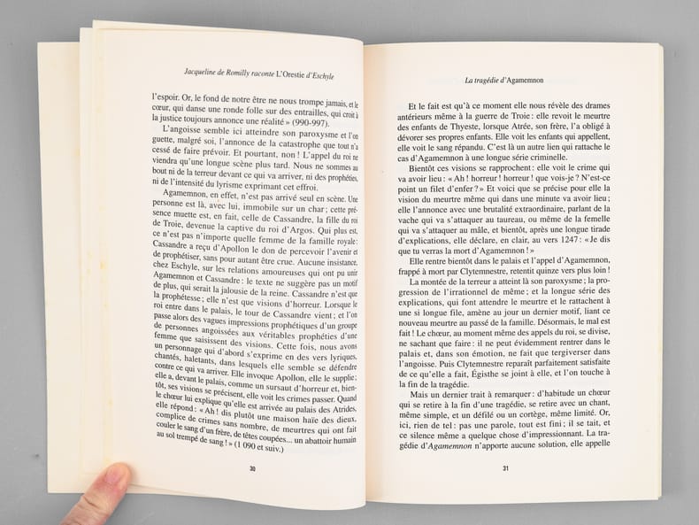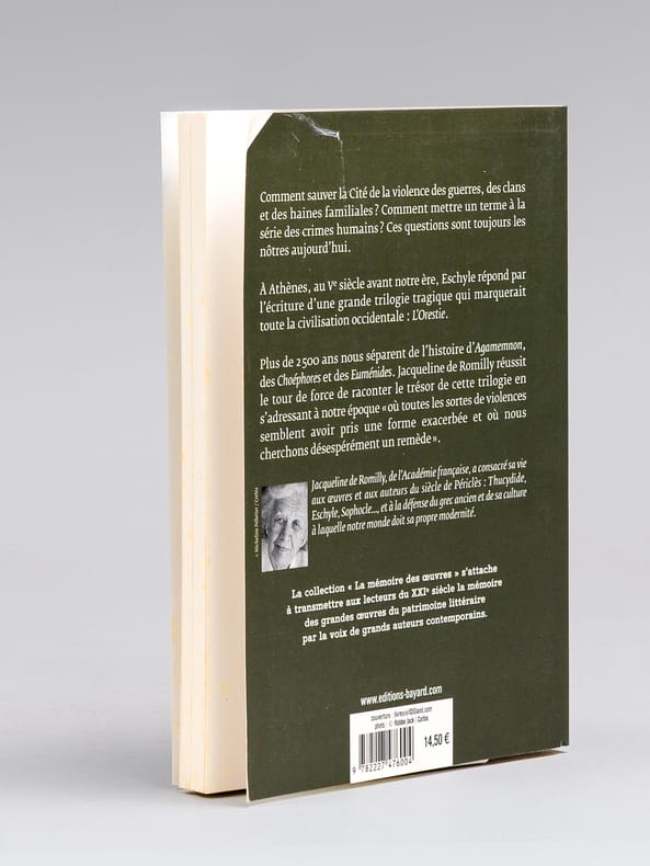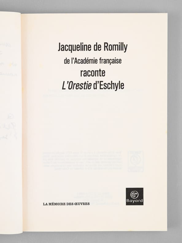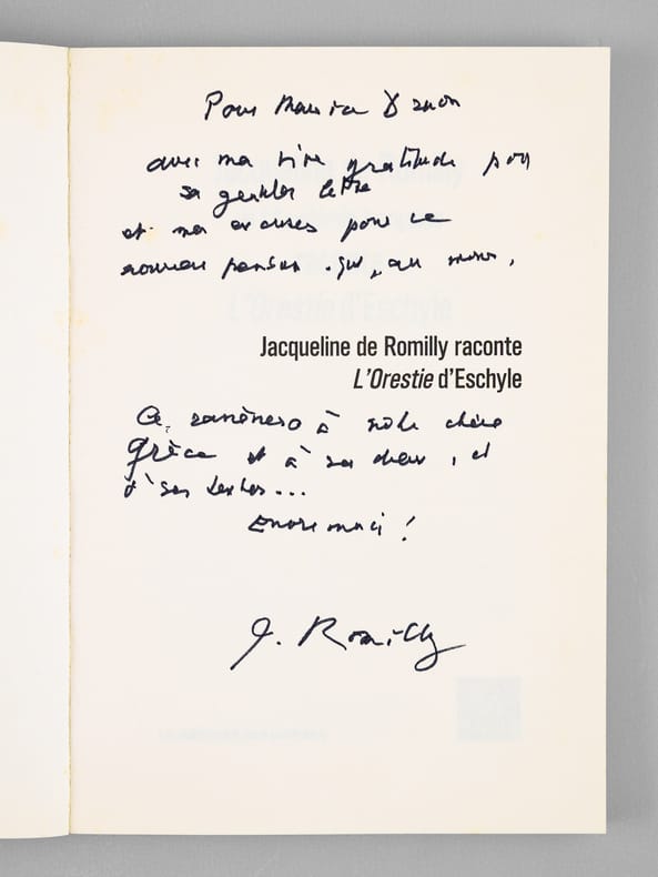 Bel envoi de l'auteur à l'académicien Maurice Druon : "Pour Maurice Druon, avec ma vive gratitude pour sa gentille lettre et mes excuses ce nouveau pensum qui, au mois, le ramènera à notre chère Grèce et à ses dieux, et à ses textes... Encore merci!" Maurice Druon (1918-2009), auteur notamment de la célèbre saga historique des Rois maudits, fut élu à l'Académie Française en 1968. Il en devint le Secrétaire Perpétuel, de 1985 à 1999. Jacqueline de Romilly, quant à elle, fut élue à l'Académie Française en 1988. Etat très satisfaisant (lég. rouss. sur tr., bon état par ailleurs) pour cet exemplaire, d'une origine prestigieuse.