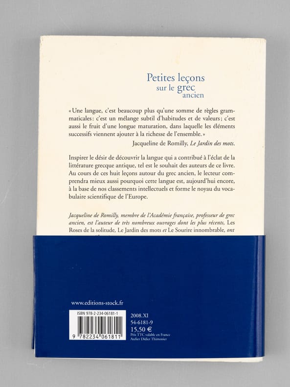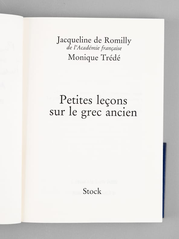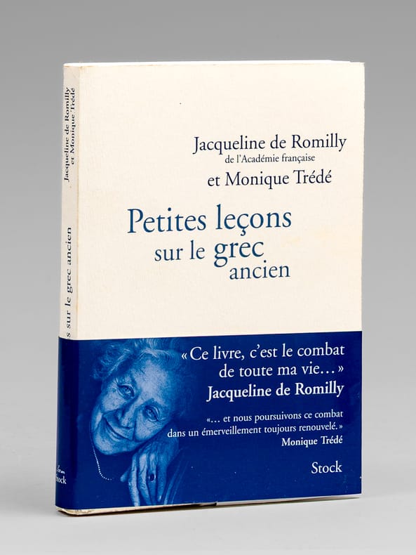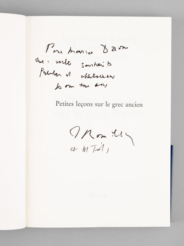 Envoi des auteurs à l'académicien Maurice Druon. Maurice Druon (1918-2009), auteur notamment de la célèbre saga historique des Rois maudits, fut élu à l'Académie Française en 1968. Il en devint le Secrétaire Perpétuel, de 1985 à 1999. Jacqueline de Romilly, quant à elle, fut élue à l'Académie Française en 1988. Etat très satisfaisant (lég. rouss. sur tr. sup., bon état par ailleurs) pour cet exemplaire, d'une origine prestigieuse.