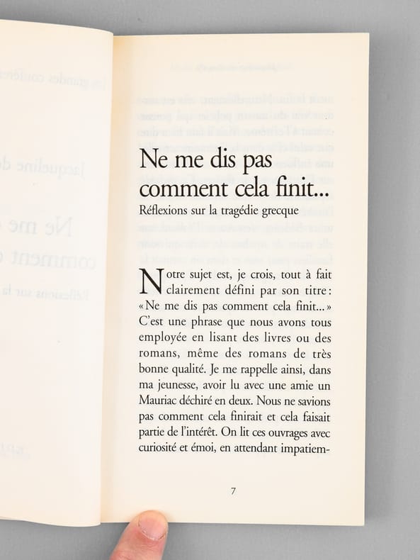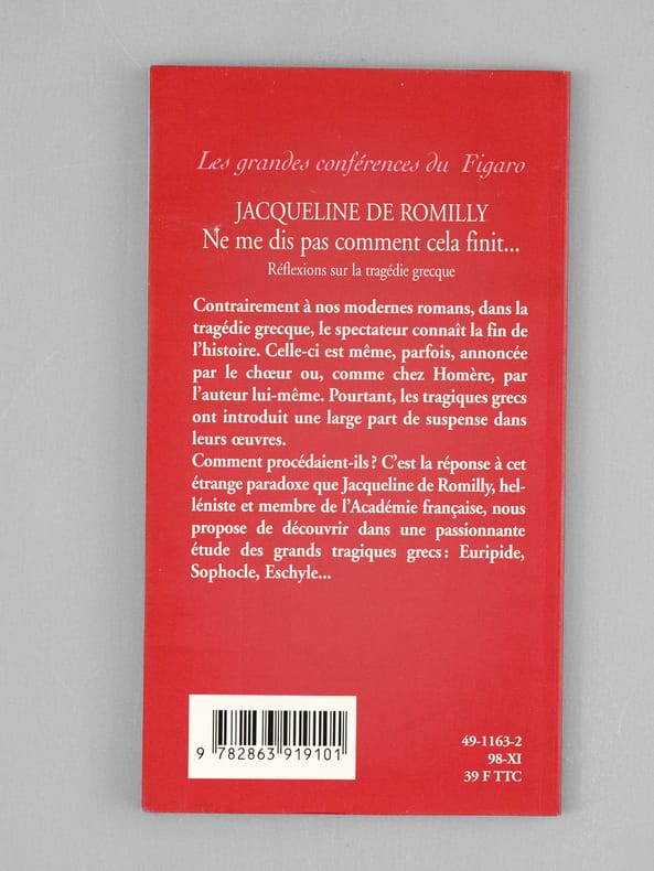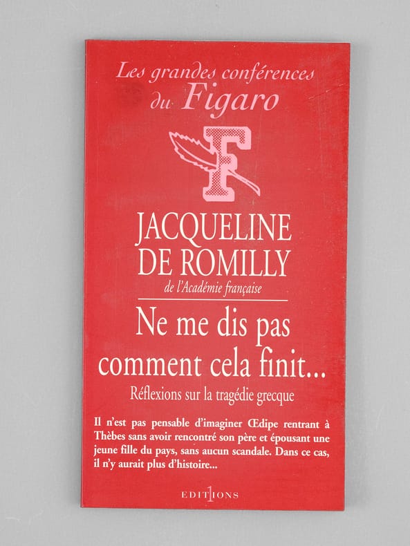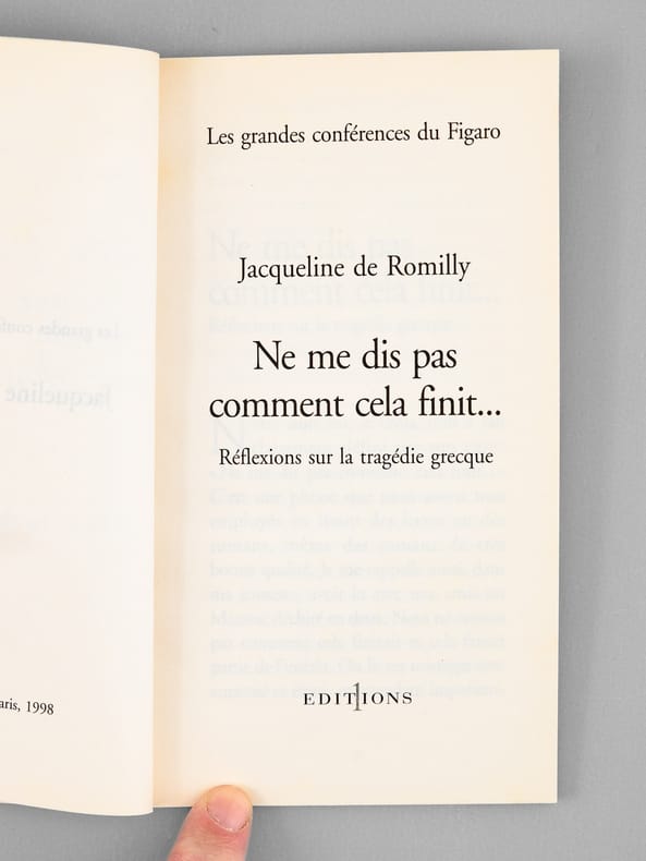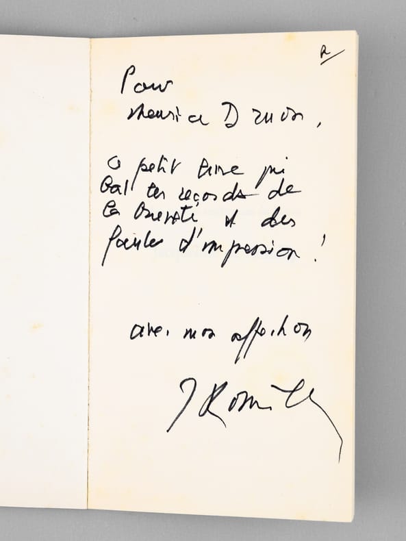 Envoi de l'auteur à l'académicien Maurice Druon : "Pour Maurice Druon, ce peiti livre qui bat des records de bieveté et des fautes d'impression ! Avec mon affection.". Maurice Druon (1918-2009), auteur notamment de la célèbre saga historique des Rois maudits, fut élu à l'Académie Française en 1968. Il en devint le Secrétaire Perpétuel, de 1985 à 1999. Jacqueline de Romilly, quant à elle, fut élue à l'Académie Française en 1988. Etat très satisfaisant (lég. rouss. sur tr. sup., bon état par ailleurs) pour cet exemplaire, d'une origine prestigieuse.