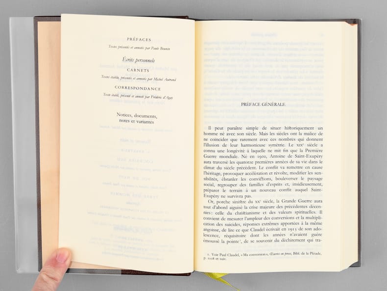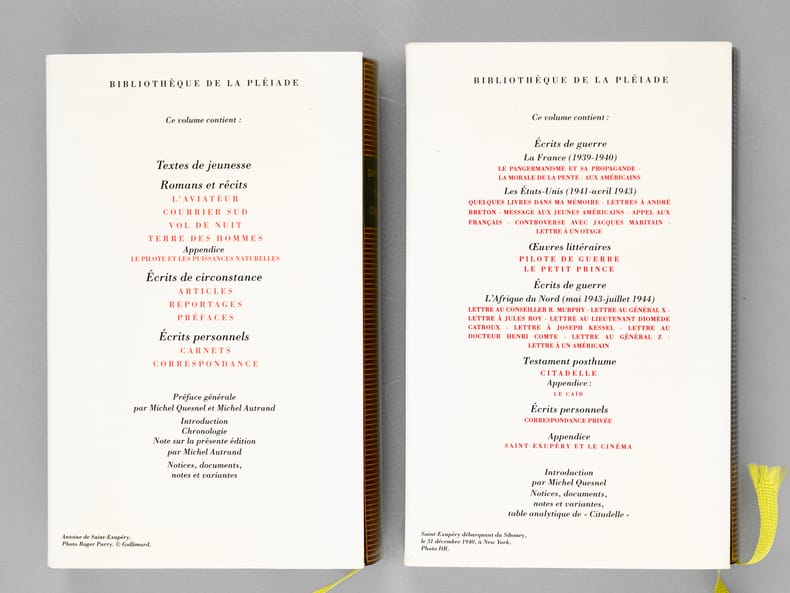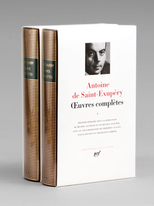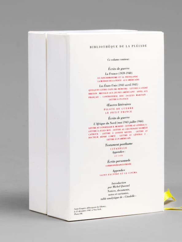 Très bon état. Contient : Tome I : Textes de jeunesse. Romans et récits : L'Aviateur - Courrier Sud - Vol de nuit - Terre des hommes. Écrits de circonstance : Articles - Reportages - Préfaces. Écrits personnels : Carnets - Correspondance. Tome II : Écrits de guerre : La France (1939-1940) : Le Pangermanisme et sa propagande - La morale de la pente - Aux Américains. Écrits de guerre : Les États-Unis (1941-avril 1943) : Quelques livres dans ma mémoire - Lettres à André Breton - Message aux jeunes Américains - Appel aux Français, controverse avec Jacques Maritain - Lettre à un otage. Œuvres littéraires : Pilote de guerre - Le Petit Prince. Écrits de guerre : L'Afrique du Nord (mai 1943 - juillet 1944) : Lettre au conseiller R. Murphy - Lettre au général X - Lettre à Jules Roy - Lettre au lieutenant Diomède Catroux - Lettre à Joseph Kessel - Lettre au docteur Henri Comte - Lettre au général Z - Lettre à un Américain. Testament posthume : Citadelle. Appendice : Le Caïd. Écrits personnels : Correspondance privée. Appendice : Saint-Exupéry et le cinéma.