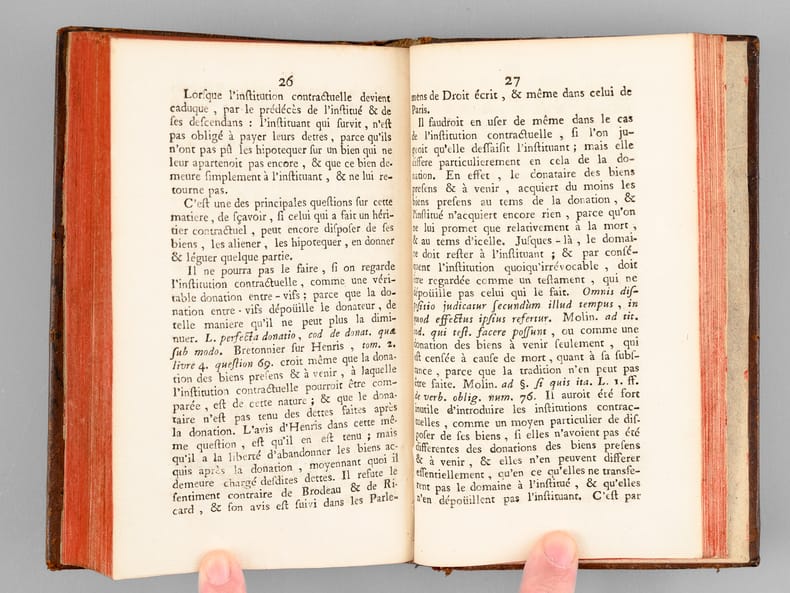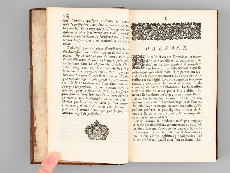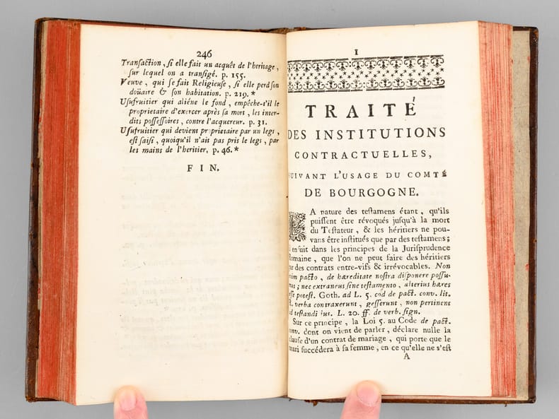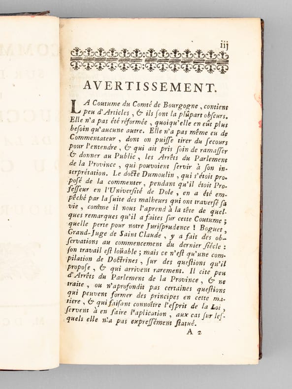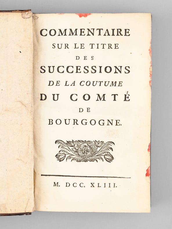 Ainsi que le précise l'auteur dans sa préface, "la Coutume du Comté de Bourgogne, contiens peu d'Articles, & ils sont la plûpart obscurs. Elle n'a pas été réformée, quoiqu'elle en eût plus besoin qu'aucune autre. Elle n'a pas même eu de Commentateur, dont on puisse tirer du secours pour l'entendre, & qui ait pris soin de ramasser & donner au Public, les Arrêts du Parlement de la Province, qui pouvoient servir à son interprétation. Le docte Dumoulin, qui s'étoit proposé de la commenter, pendant qu'il étoit professeur en l'Université de Dole, en a été empêché par la suite des malheurs qui ont traversé sa vie, comme il nous l'aprend à la tête de quelques remarques qu'il a faites sur cette Coutume ; quelle perte pour notre Jurisprudence !". Etat très satisfaisant (sans gardes volantes, petits mq. en coiffes, épidermures sur un plat, discrète mouill. marginale, bon exemplaire par ailleurs).