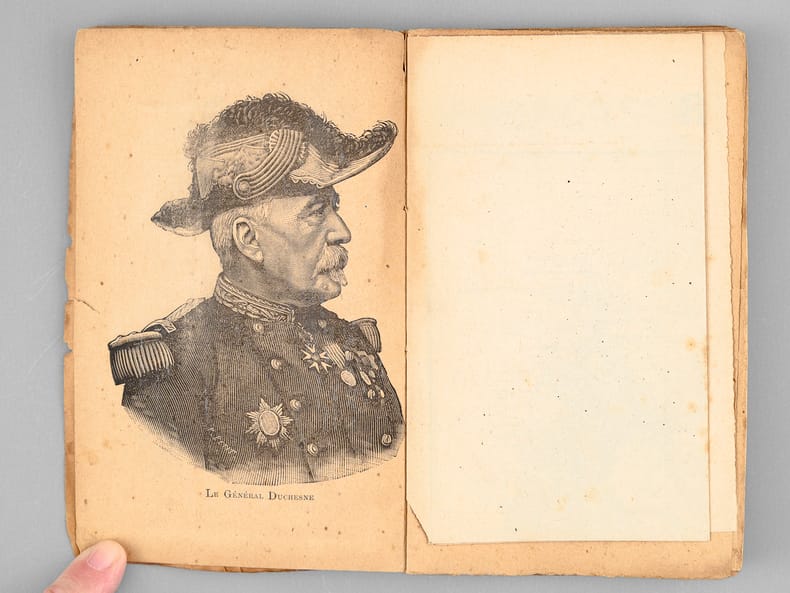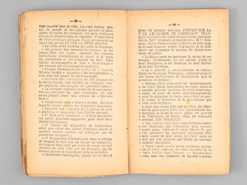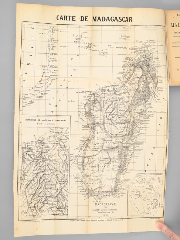 Rare exemplaire de ce petit guide relatant l'expédition de Galliéni lors de la seconde guerre franco-malgache, et fournissant nombre d'explications ethnographiques. Etat satisfaisant (couv. frottée avec fente en mors, qq. traces d'usage, bon état par ailleurs).
