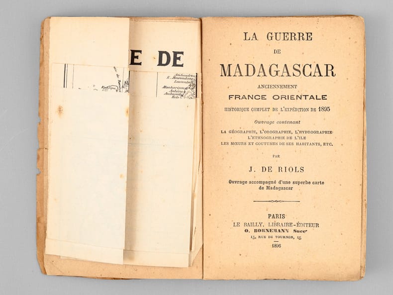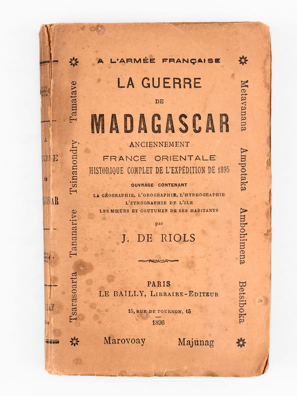 Par J. de Riols, Ouvrage accompagné d'une superbe carte de Madagascar, Le Bailly, O. Bornemann Succr., Paris, 1896, 108 pp. avec carte dépliante. Rappel du titre complet : La Guerre de Madagascar anciennement France Orientale. Historique complet de l'Expédition de 1895. Ouvrage contenant la Géographie, l'Orographie, l'Hydrographie, l'Ethnographie de l'Ile, Les Moeurs et Coutumes de ses Habitants, etc.