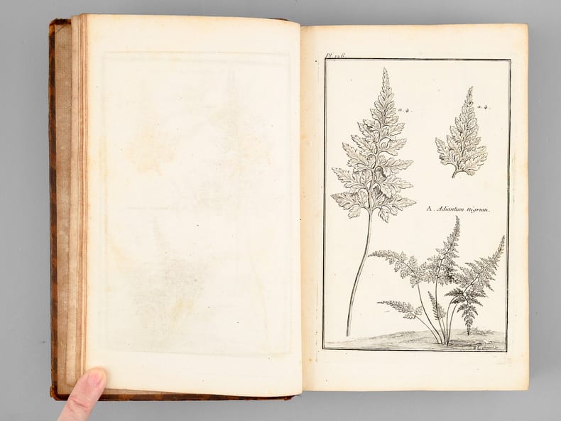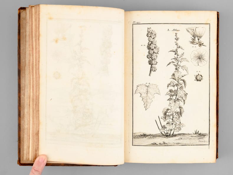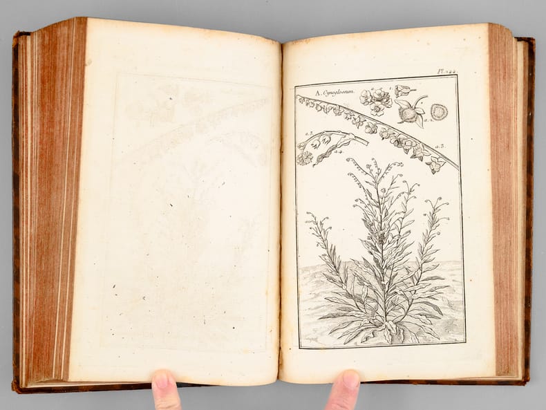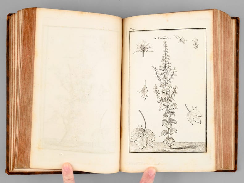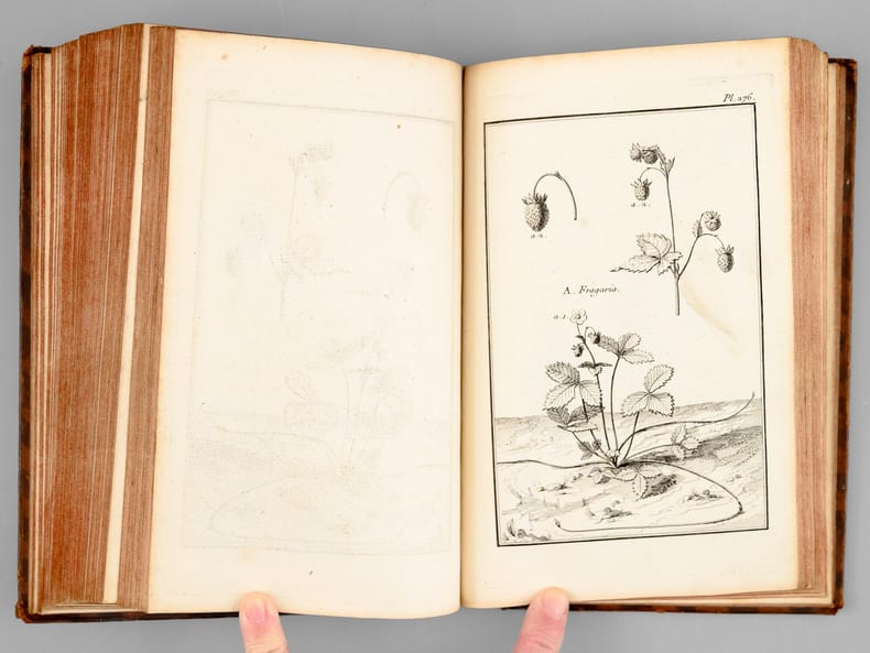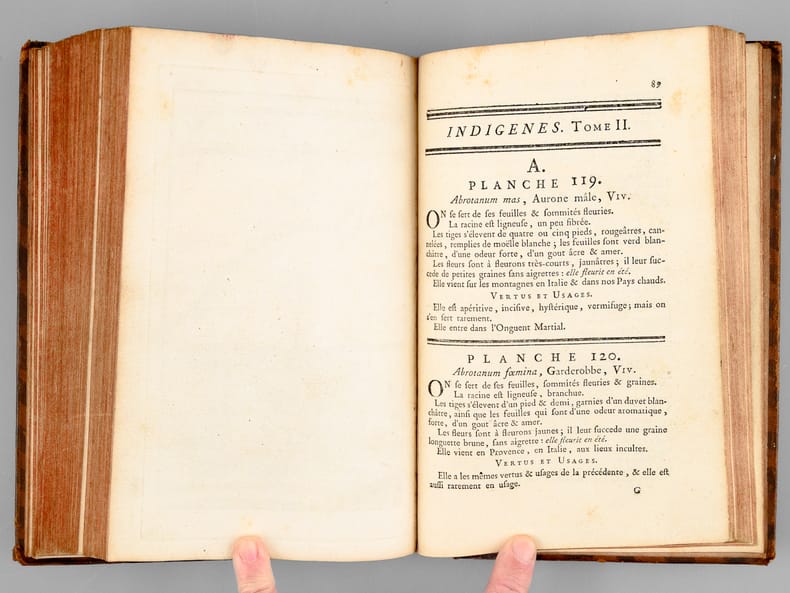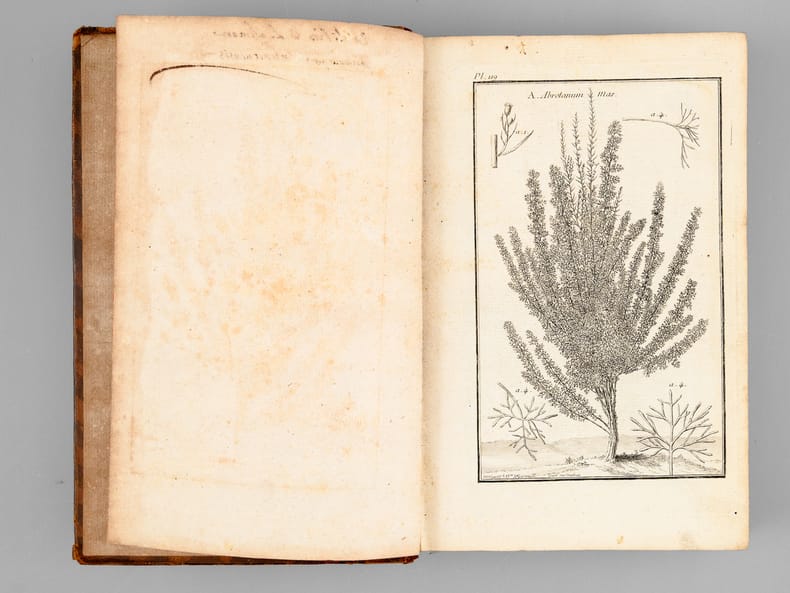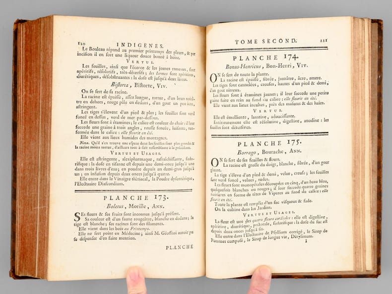 Tome second seul, recueillant 174 belles planches de botaniques, dessinées par Garsault, ainsi que le texte explicatif. Etat très satisfaisant (dos frotté avec mq. en coiffes, bon état intérieur, ex-libris ms. ancien en garde).