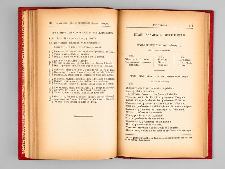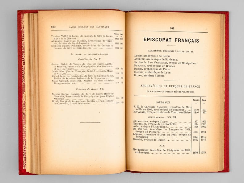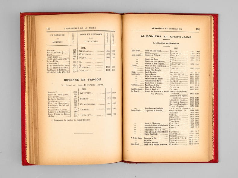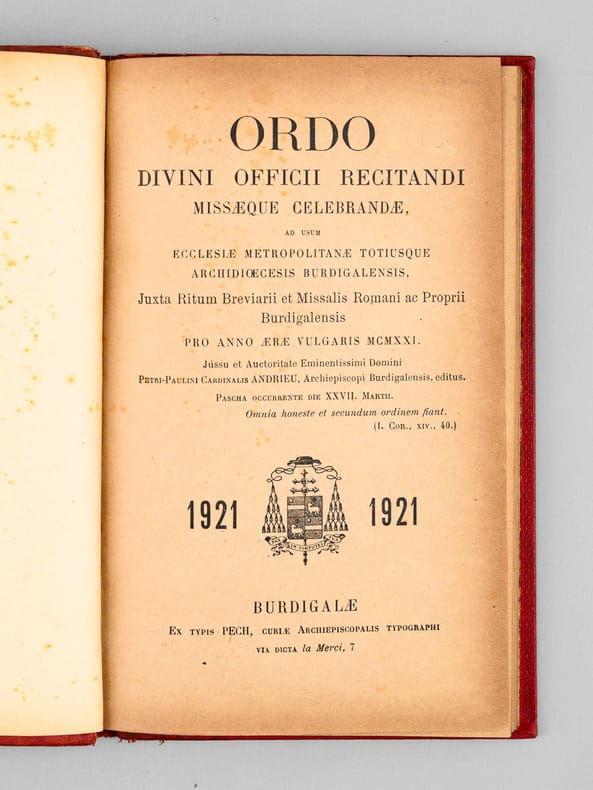 Exemplaire relié de l'Ordo du diocèse de Bordeaux pour l'année 1921. Etat très satisfaisant (reliure un peu frottée)