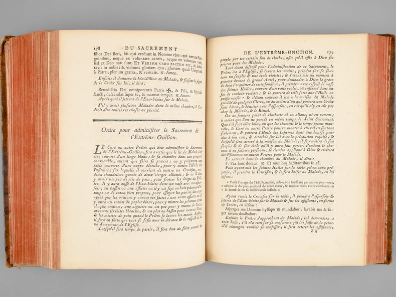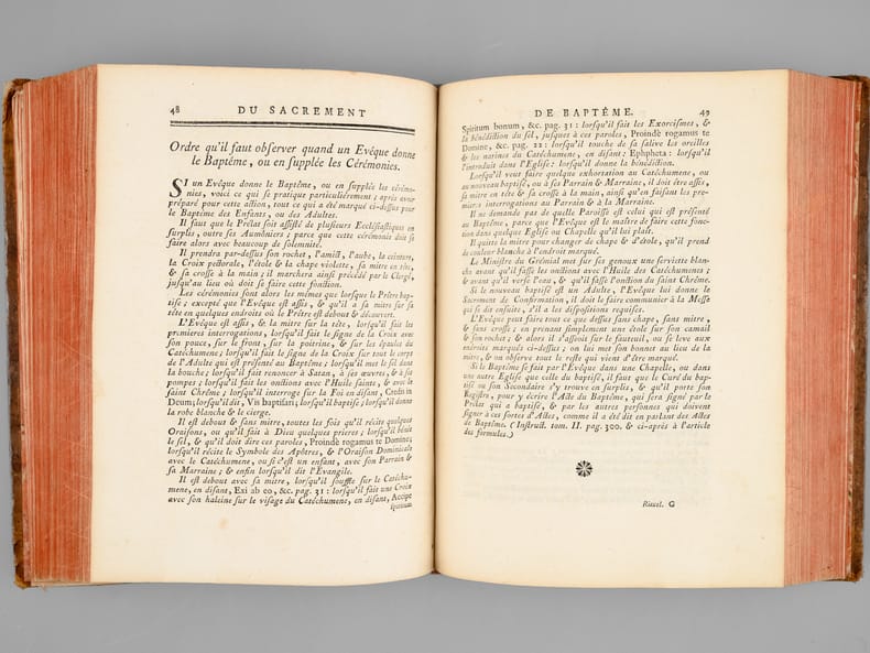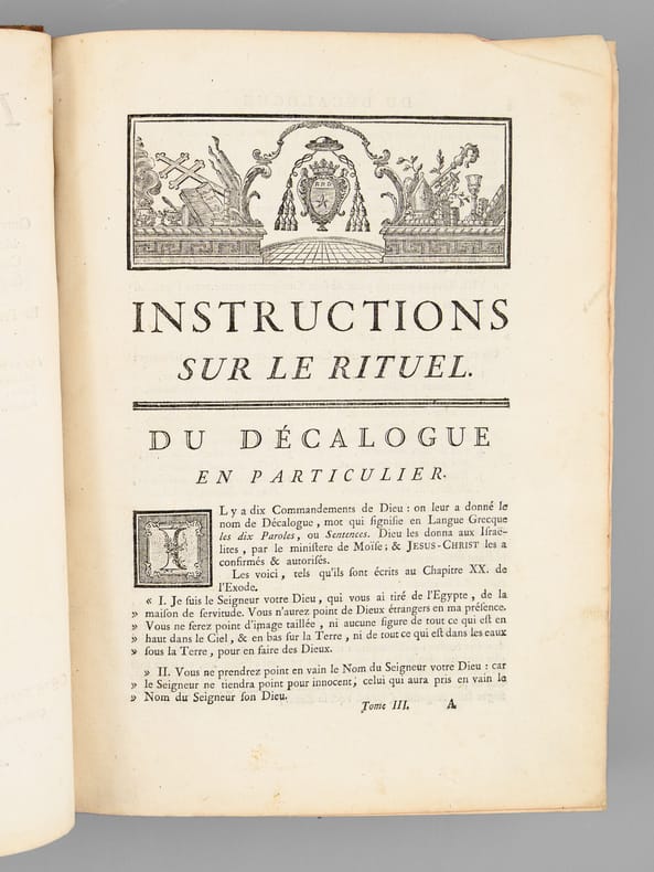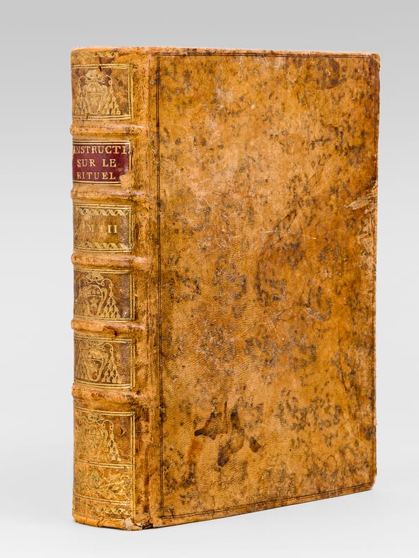Le volume contient le tome 3 seul des "Instructions sur le Rituel", mais est bien complet du "Rituel Romain, pour l'usage du Diocèse de Toulon". Etat satisfaisant (tome III seul des "Instructions", reliure un peu frottée avec usures en dos, coiffes et coupes). Brunet, III, 561