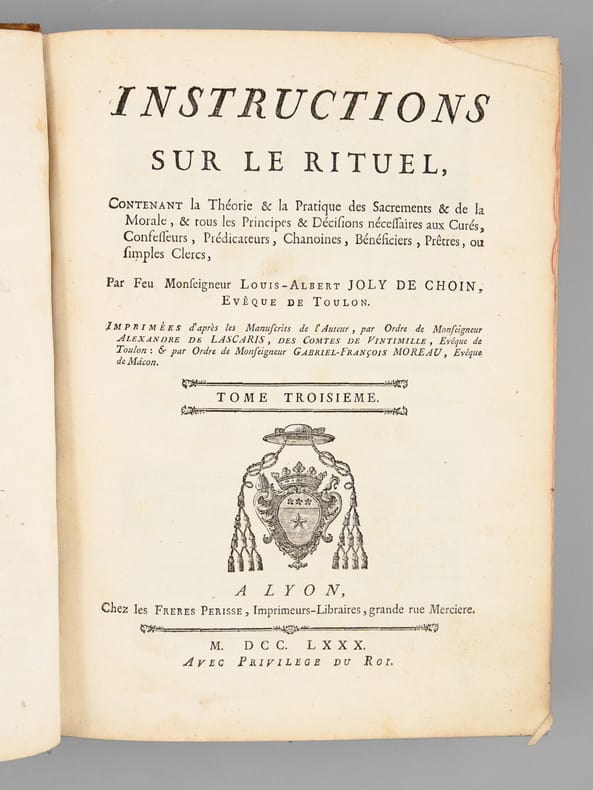 Publié par ordre de Mgr Alexandre de Lascaris, 1780 et 1778, 1 vol. in-4 reliure de l'époque pleine basane marbrée, dos à 5 nerfs oprné aux armes de Mgr Joly de Choin, Chez les Frères Perisse, Lyon, 1780, 1778, 2 ff., 339 pp., 2 ff., XII-370- 86 pp.