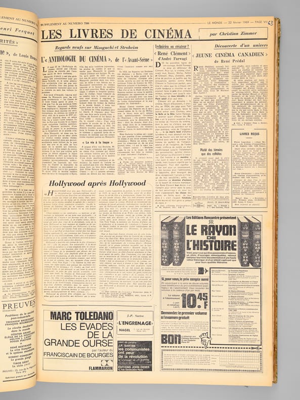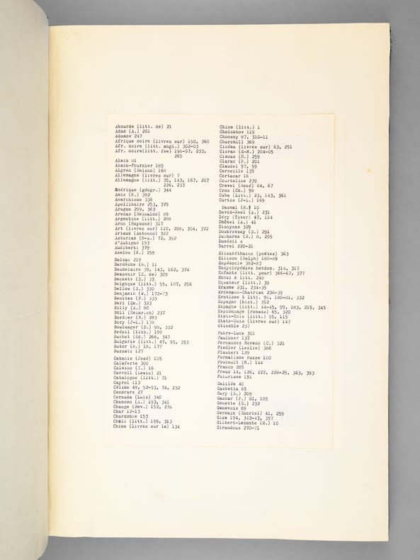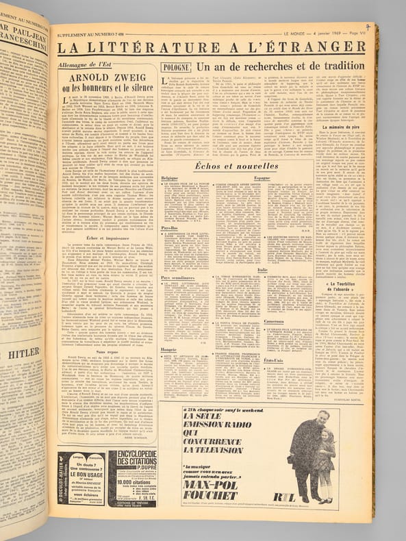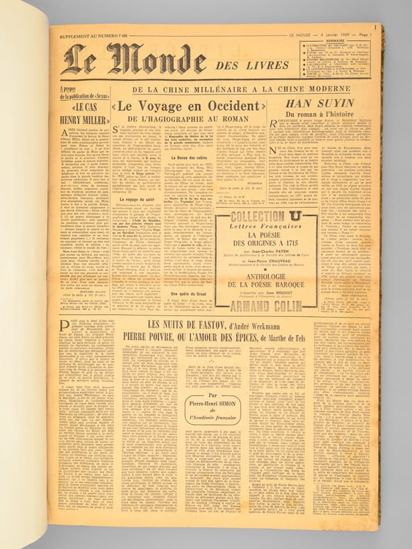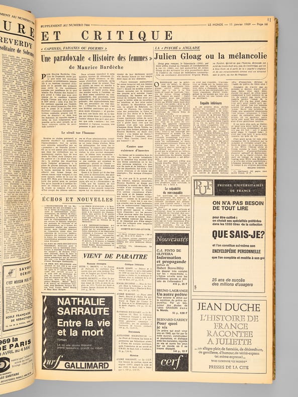 Rare exemplaire suivi, complet et relié du supplément littéraire du Journal "Le Monde" pour l'année 1969, qui a été enrichi d'une table alphabétique dactylographiée des auteurs et des thèmes. Très bon état. Une lecture passionnante que celle de ce supplément littéraire, dont le format a rarement conduit à sa conservation.