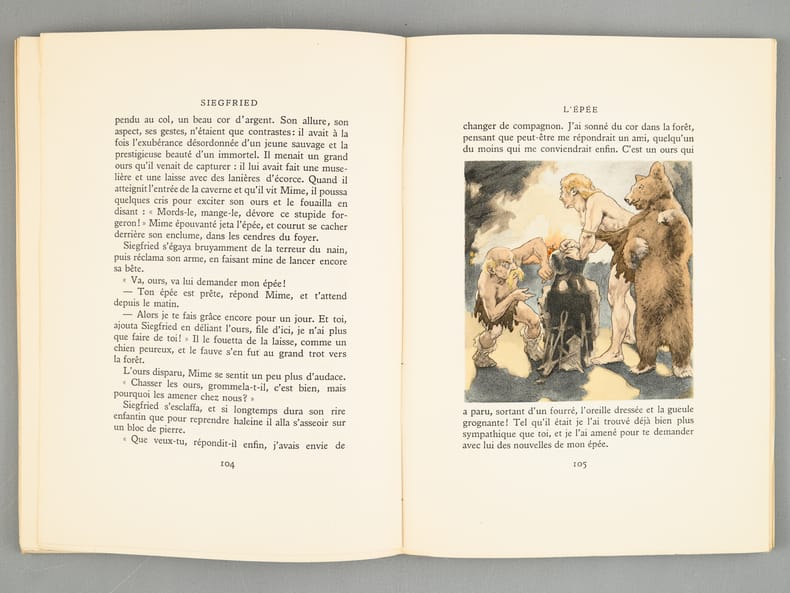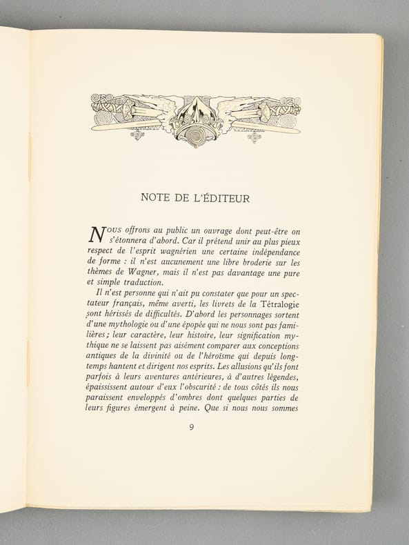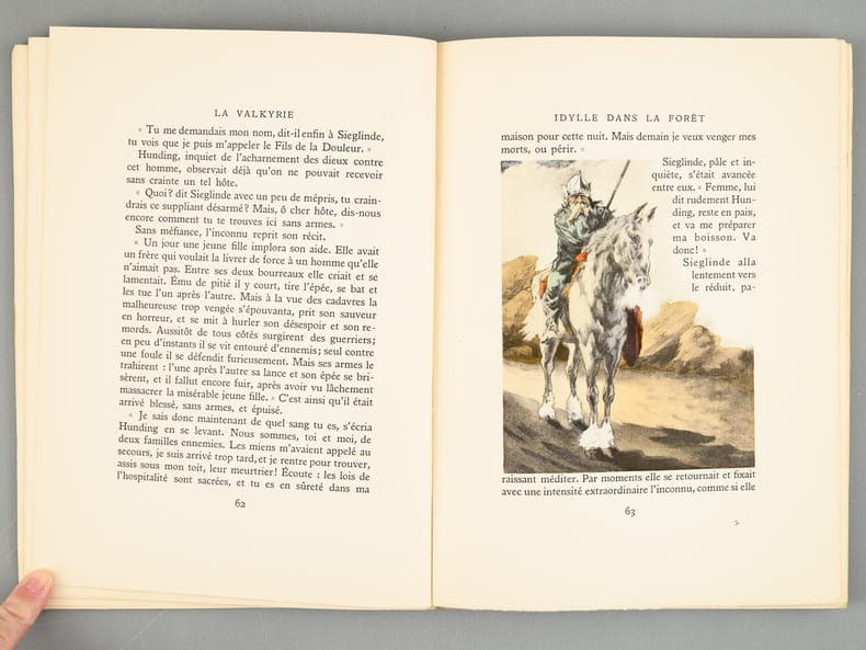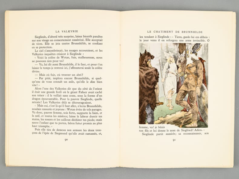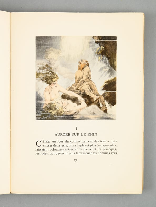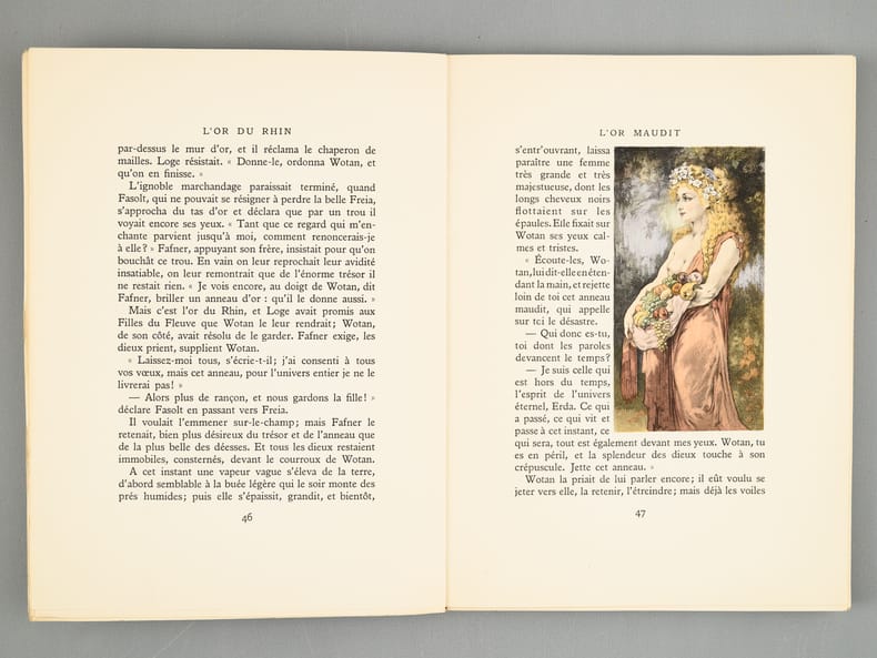 L'ANNEAU DU NIBELUNG | Tetralogie par Richard Wagner. L'Or du Rhin | La Walkyrie | Siegfried | Le Crépuscule des Dieux. Premier volume : L'Or du Rhin et la Valkyrie, par Richard Wagner, avec illustrations par Arthur Rackham. Traduits en prose rythmée par Alfred Ernst. Paris, Hachette et Cie (imprimerie Ballantyne and Company Ltd, Londres), sans date (1910) X-158-(2) pages et 34 compositions en couleurs contrecollées sur papier marron. 4 hors-textes contrecollés présentes de petites traces de pli (sans gravité). Quelques feuillets avec légère décharge (acidité du papier marron sur lequel sont montés les hors-texte). Beau papier vélin de cuve. Tirage numéroté à 330 exemplaires dont 30 exemplaires sur Japon signés par l'artiste et 300 exemplaires sur papier vélin à la forme. Celui-ci, un des 300 exemplaires sur papier vélin à la forme et numéroté au composteur (n°245). Reliure éditeur plein vélin décoré doré. Reliure très fraîche. Rubans absents. Deuxième volume : Siegfried et Le Crépuscule des Dieux, par Richard Wagner, avec illustrations par Arthur Rackham. Traduits en prose rythmée par Alfred Ernst. Paris, Hachette et Cie (imprimerie Ballantyne and Co Limited, Londres), sans date (1911) (8)-185-(2) pages et 30 compositions en couleurs contrecollées sur papier marron. Parfait état intérieur. Tirage numéroté à 390 exemplaires dont 40 exemplaires sur Japon signés par l'artiste et 350 exemplaires sur papier vélin à la forme. Celui-ci, un des 40 exemplaires sur Japon signés et numéroté (n°24) à la plume par Arthur Rackham.