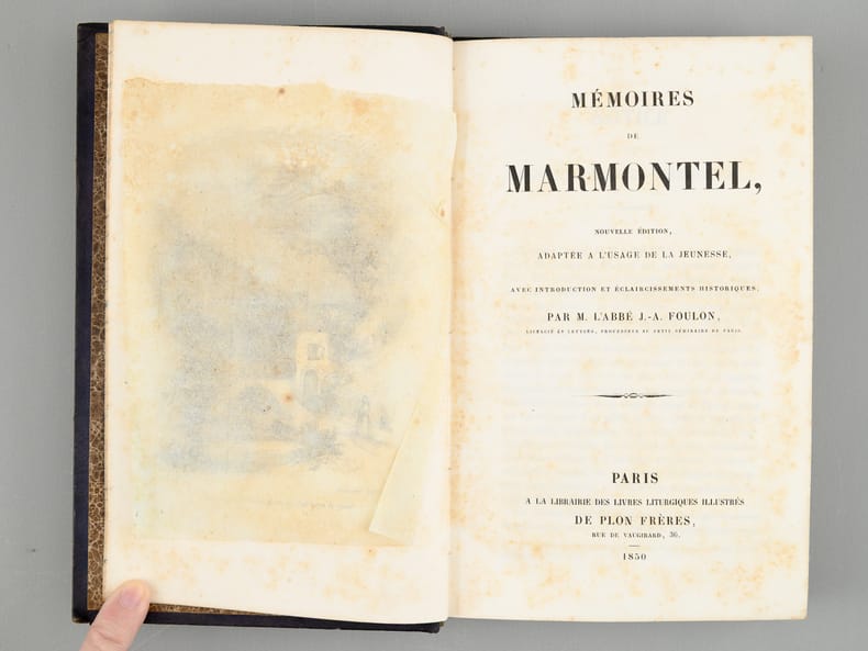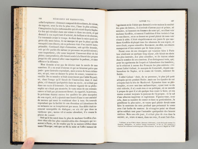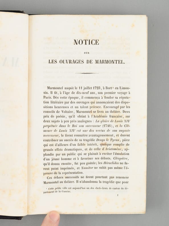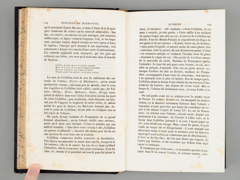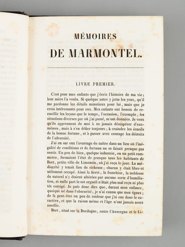 Edition peu commune des Mémoires de Marmontel, si intéressants parce "qu'ils nous font parfaitement connaitre les moeurs et l'esprit de son temps. On aime à parcourir avec Marmontel cette vaste galerie de portraits divers, qui commence à Massillon et se termine à Mirabeau. Tout le dix-huitième siècle est là avec ses intérêts, ses idées, ses préjugés, ses passions". Bon état (rouss. variables, coupes lég. frottées)