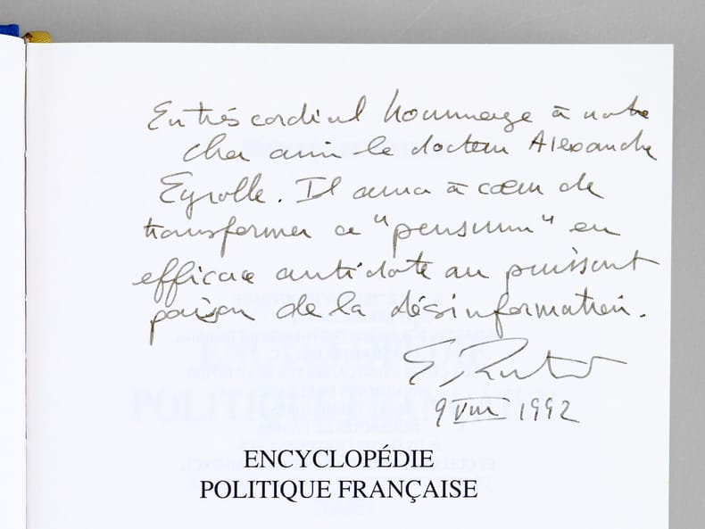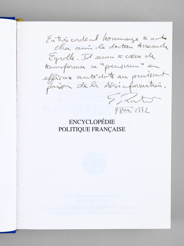 Bon exemplaire enrichi d'un bel envoi de l'auteur : "En très cordial hommage à notre cher ami le docteur A... E... Il aura à coeur de transformer ce "pensum" en efficace antidote au puissant poison de la désinformation".