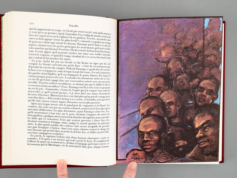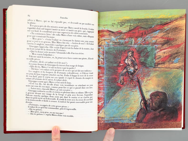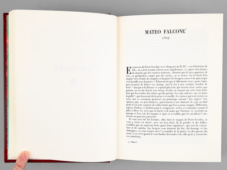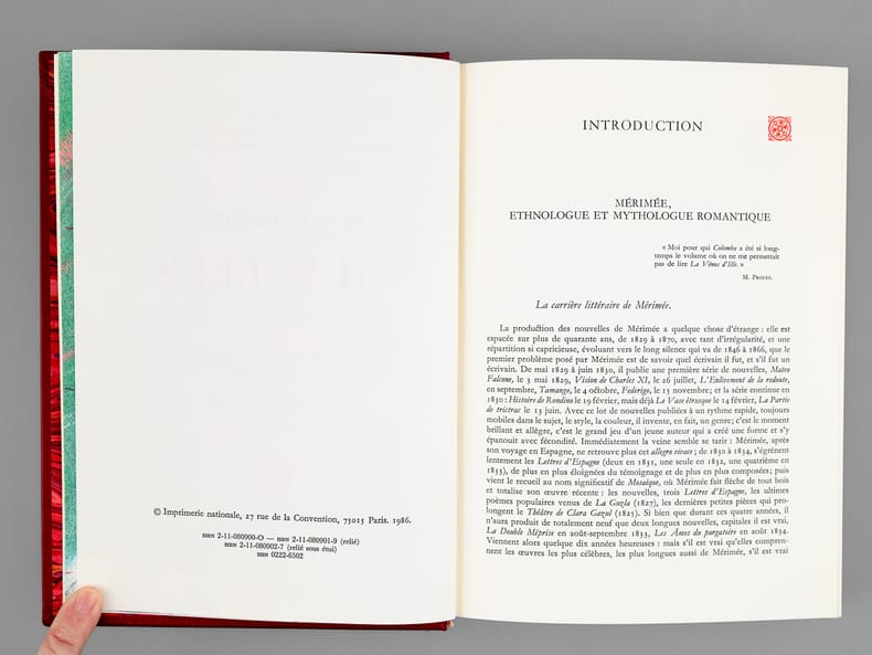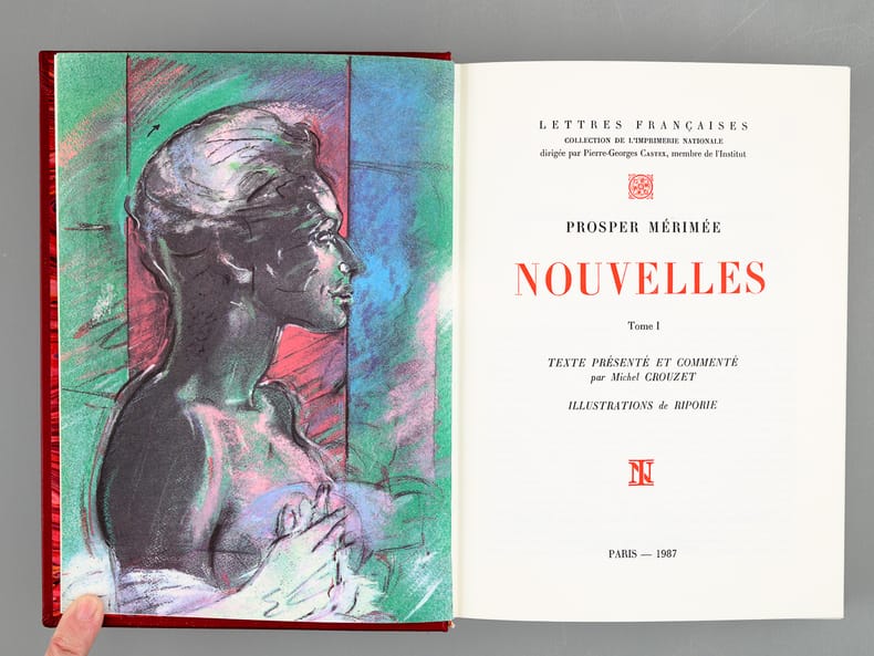 Texte présenté et commenté par Michel Crouzet, illustrations de Riporie, un des 3150 exemplaires sur papier d'édition de Rives numéroté, 2 vol. in-8 reliure pleine cuir rouge éditeur sous étui commun illustré, tête dorée, coll. Lettres Françaises, collection de l'Imprimerie Nationale, Paris, 1987