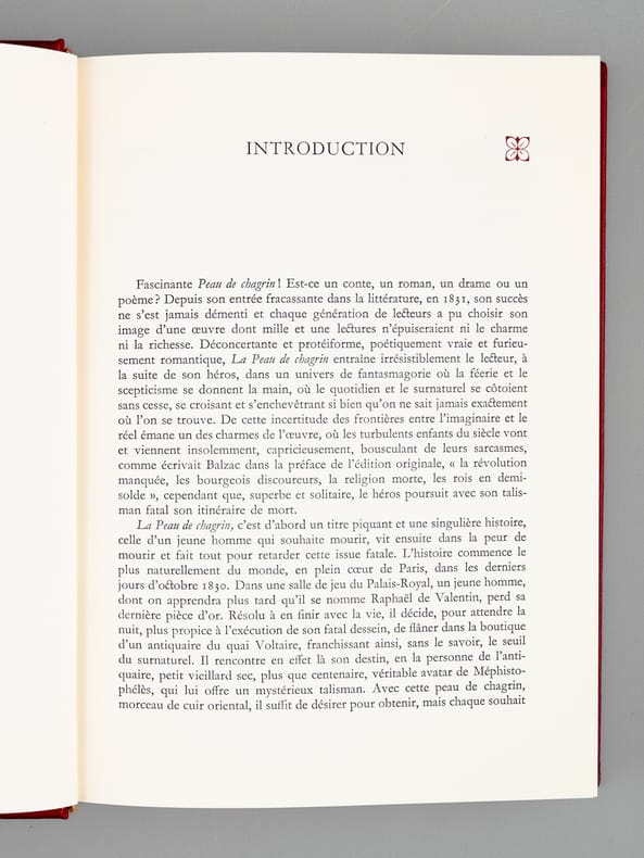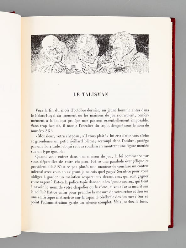 Honoré de Balzac, La Peau de chagrin, Houdaille, sans date (1838) Grand in-8, belle reliure demi-chagrin noir de l'époque en bon état, une centaine de vignettes finement imprimées de divers artistes (Gavarni...), quelques rousseurs éparses mais la majorité des pages en sont exemptes, ce qui et assez rare pour cet ouvrage, une tache sur l'une des pages de titre (voir photo), petites déchirures sur la table des matières (voir photo), à part cela bon état.