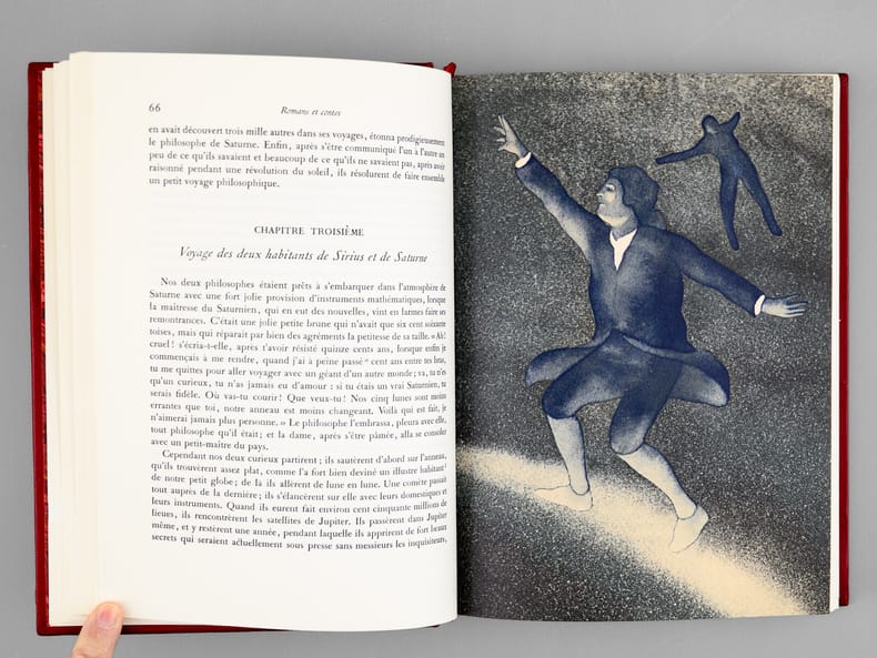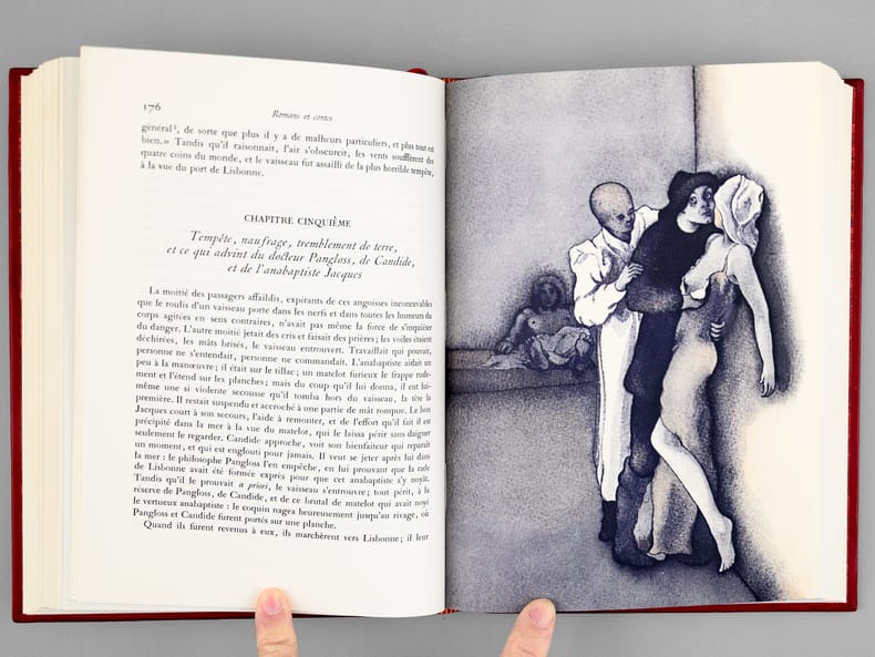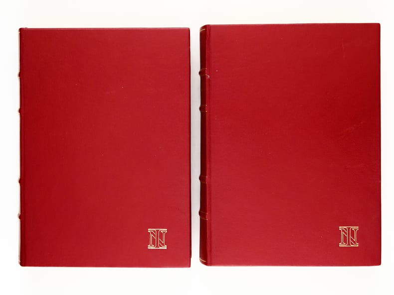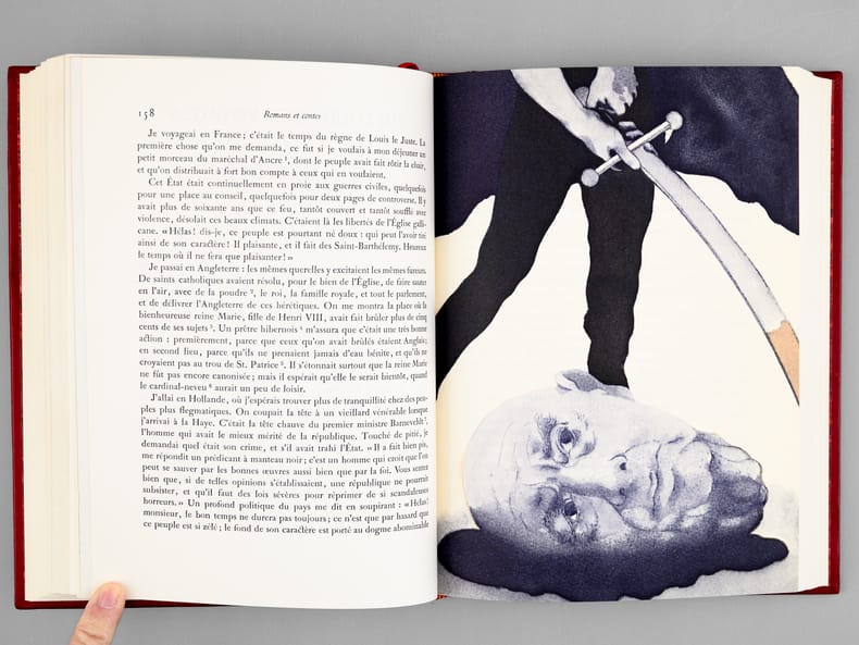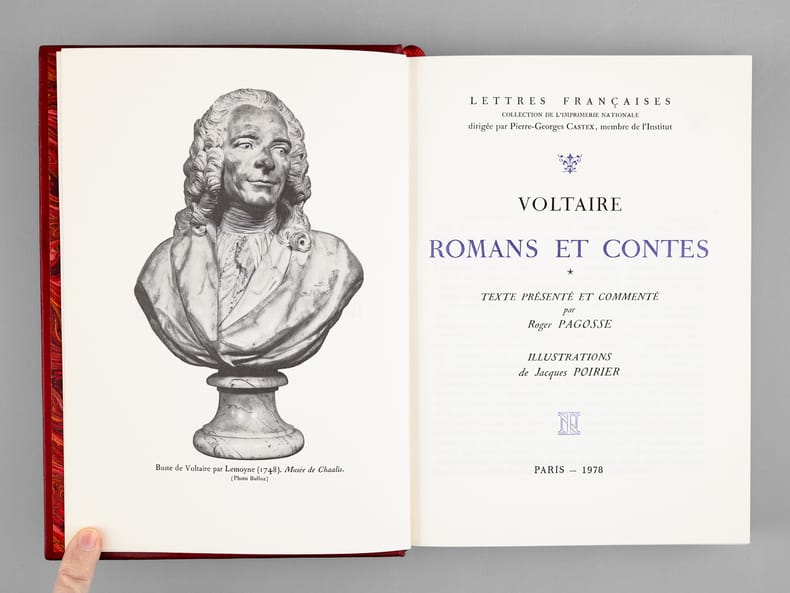 Texte présenté et commenté par Roger Pagosse, illustrations de Jacques Poirier, un des 5000 exemplaires sur papier d'édition de Rives numéroté, 2 vol. in-8 reliure pleine cuir rouge éditeur, dos à 4 nerfs dorés, tête dorée, coll. Lettres Françaises, collection de l'Imprimerie Nationale, Paris, 1978, 358 ; 360 pp.