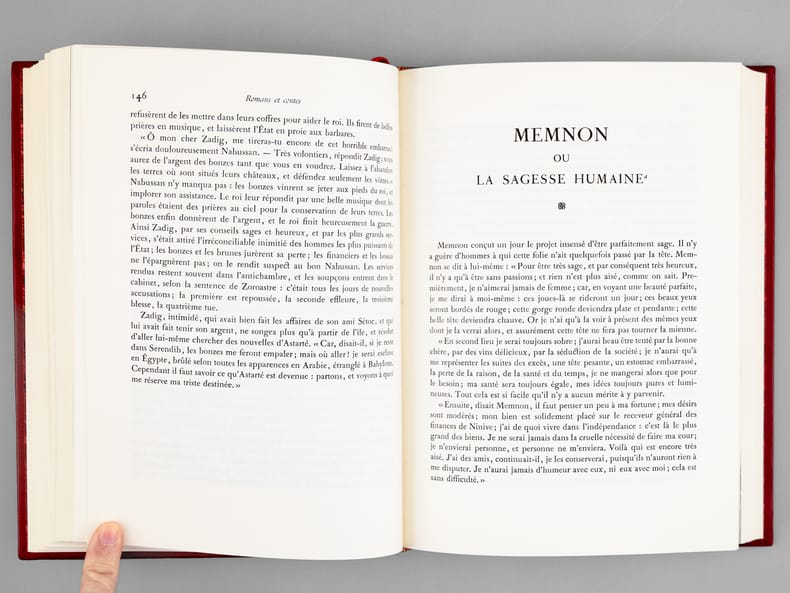 Magnifique exemplaire du tirage sur grand papier vélin, de toute beauté, parfaitement établi par Chambolle-Duru en superbe maroquin doublé, et enrichi de nombreuses figures par Moreau le Jeune et Desenne, dont de très rares planches en tirage avant la lettre. Ces 3 volumes, correspondant aux tomes 14 ("Contes en Vers, Satires, Poésies mêlées"), 44 et 45 ("Romans" réunissant notamment Zadig, Candide, Micromegas, etc...) de l'édition de Kehl en 70 volumes, font partie du tirage le plus luxueux sur grand papier vélin. Ils sont enrichis de de plusieurs suites de planches : on trouvera 31 planches en tirage avec la lettre de la première et de la seconde suite (publié chez Renouard en 1802) d'après Moreau le Jeune (dont le portrait gravé par Bonvoisin), 37 planches en tirage avant la lettre de la première et de la seconde suite d'après Moreau le Jeune, 20 planches de la suite par Desenne et 1 portrait par Benoist. Ce sublime exemplaire en parfait état est d'une provenance remarquable, portant l'ex-libris du très grand bibliophile américain Robert Hoe, fondateur du "Grolier Club". Notre exemplaire est ainsi décrit au numéro 3207 du "Catalogue of the library of Robert Hoe of New York" Part IV : "3 vols. 8vo, red levant morocco, richly gilt in a Derome pattern, doublures of blue levant, with gilt panels, silk ends, gilt edges, by Chambolle-Duru [ Paris ], 1785. Large vellum paper copy ; part of the 70 volume edition. EXTRA-ILLUSTRATED by the insertion of two portraits by Bonvoisin and Benoist, plates by De Ghendt, Simonet, Declos and others, after Moreau, 20 plates after Desenne, etc., mostly proofs before letters". Bengesco, 105 ; Cohen Ricci, 1043 à 1048 ("Les suites avant la lettre ne sont pas communes, et l'on prétend qu'il n'en existe que 25")