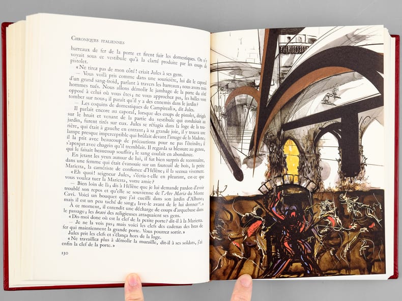 Imprimerie Nationale, 1986, in-8 carré rel. pleine peau grenat (16 x 22), 388 p.,coll. "Lettres françaises", tiré à 5200 exemplaires numérotés, celui-ci l'un des 4880 imprimés sur papier d'édition de Rives vingt-cinq pour cent chiffon, textes présentés et commentés par Robert André, 12 illustrations pleine page de Raymond Moretti, dos à 4 faux-nerfs, tranche de tête dorée, bon état.