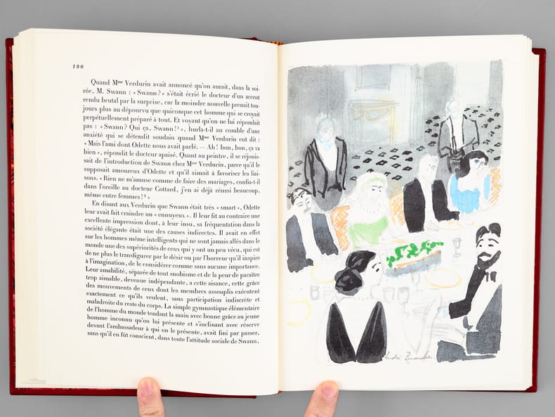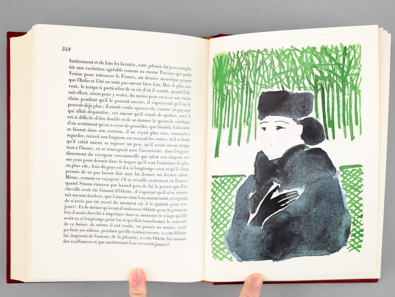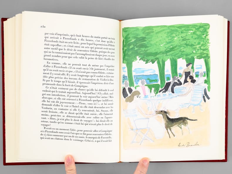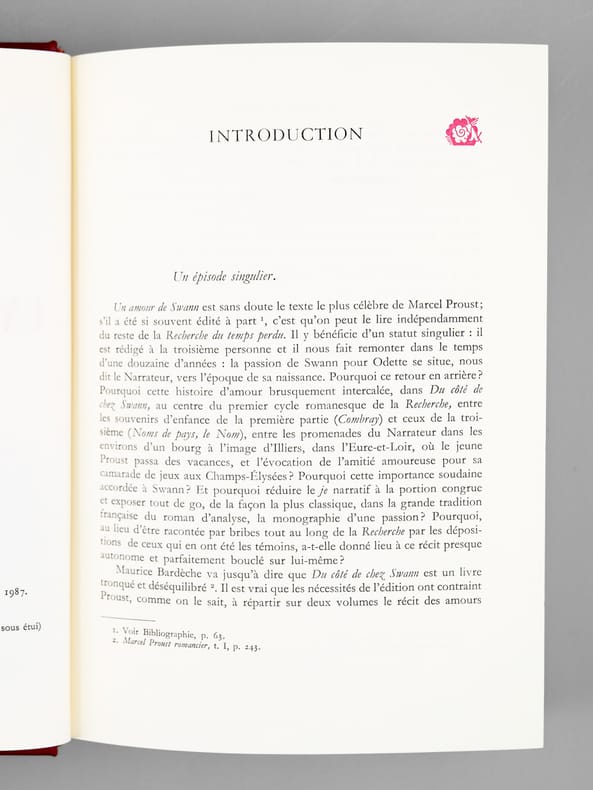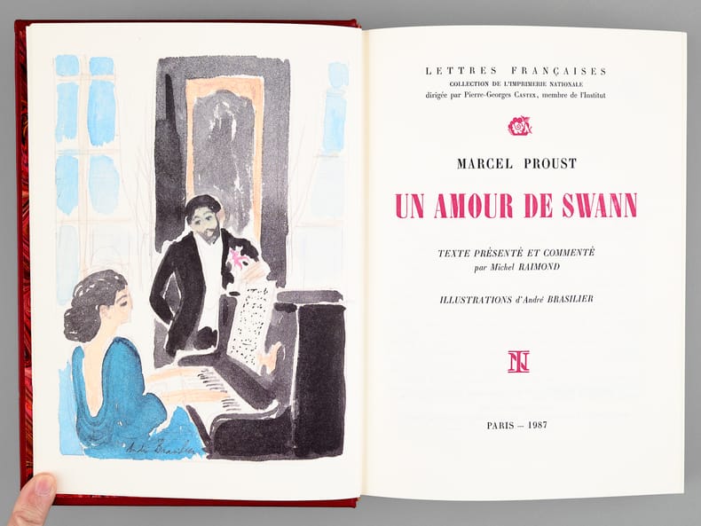 Texte présenté et commenté par Michel Raymond, illustrations d'André Brasilier, un des 4150 exemplaires sur papier d'édition de Rives numérotés, 1 vol. in-8 reliure pleine cuir rouge éditeur, dos à 4 nerfs dorés, tête dorée, coll. Lettres Françaises, collection de l'Imprimerie Nationale, Imprimerie Nationale, Paris, 1987, 414 pp.