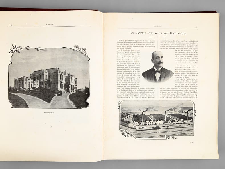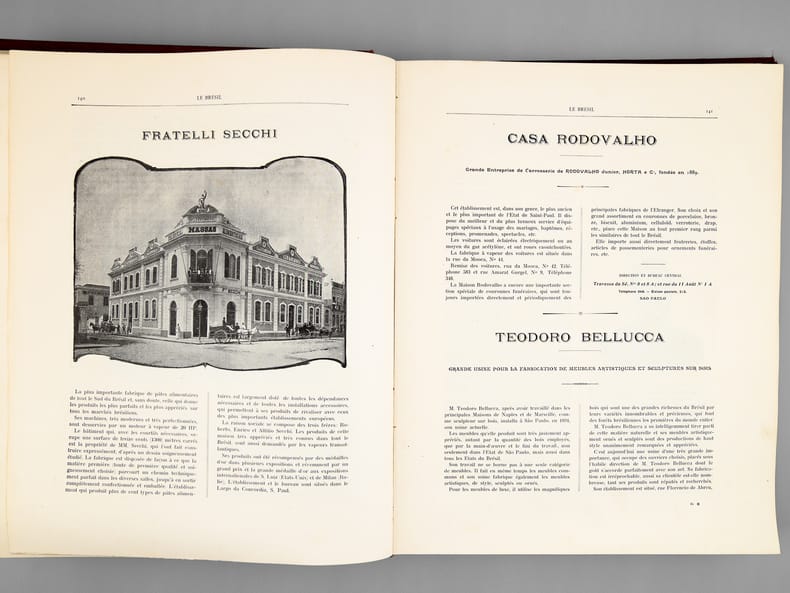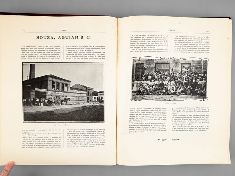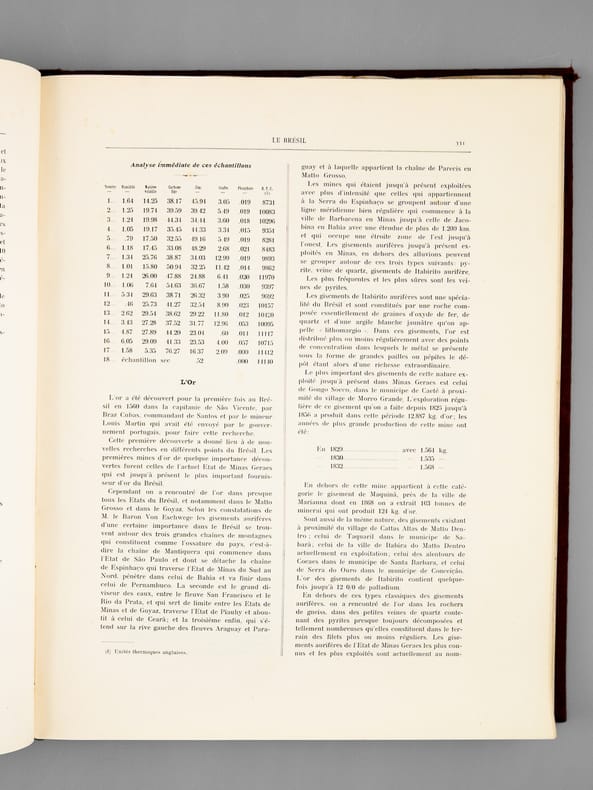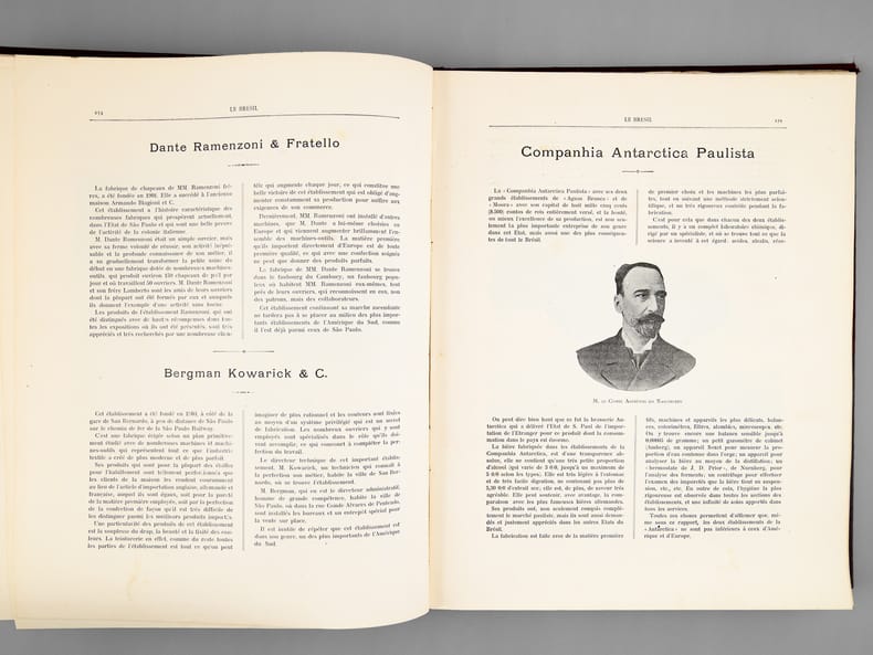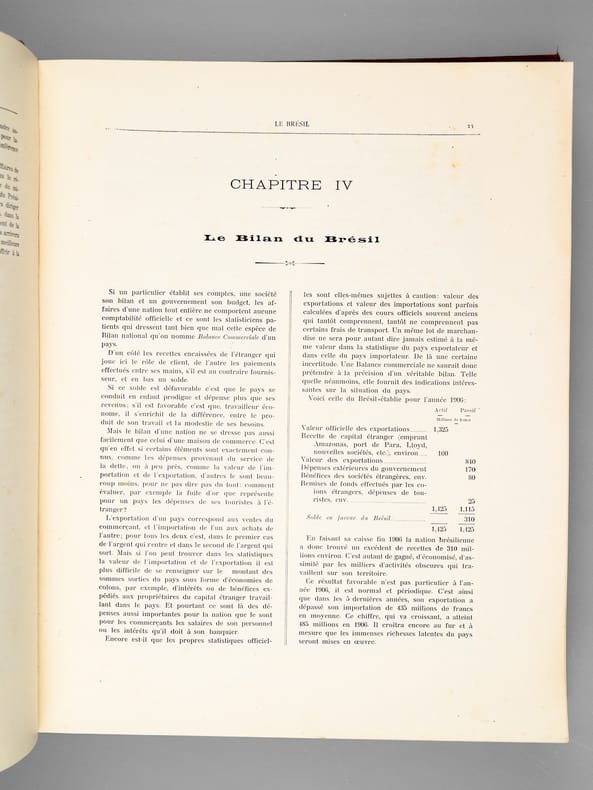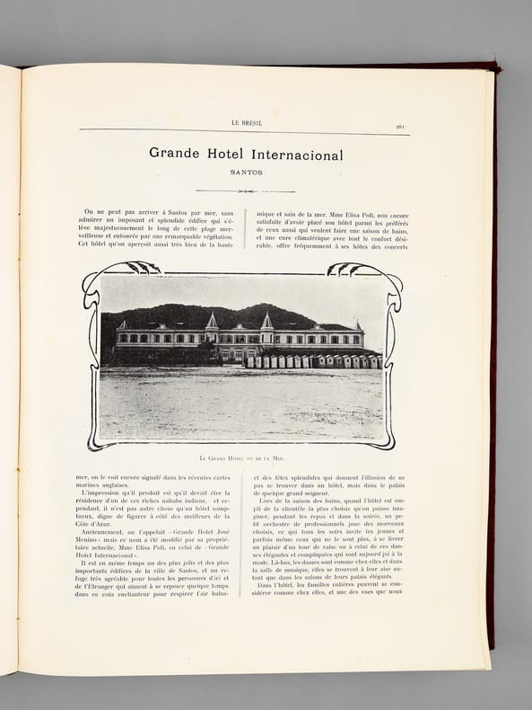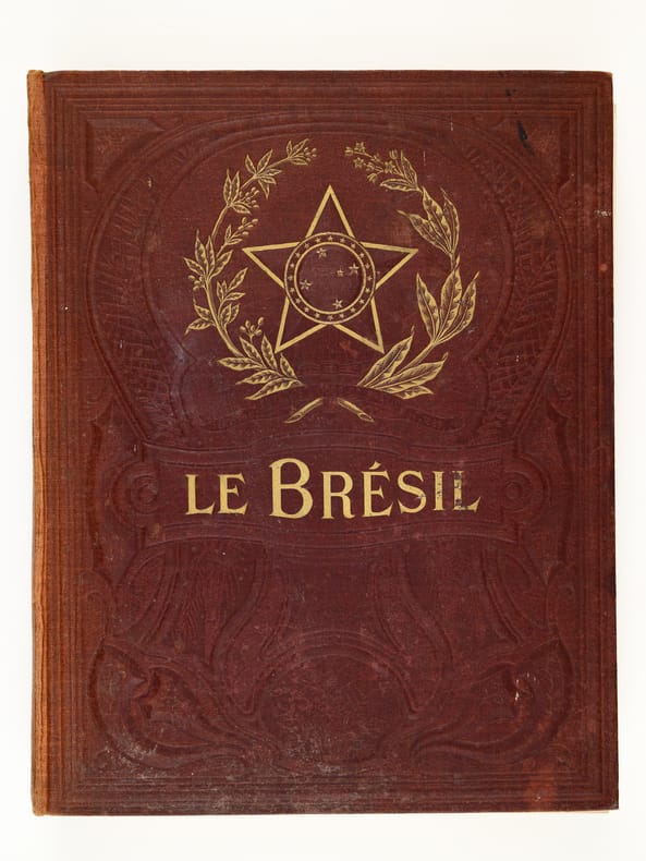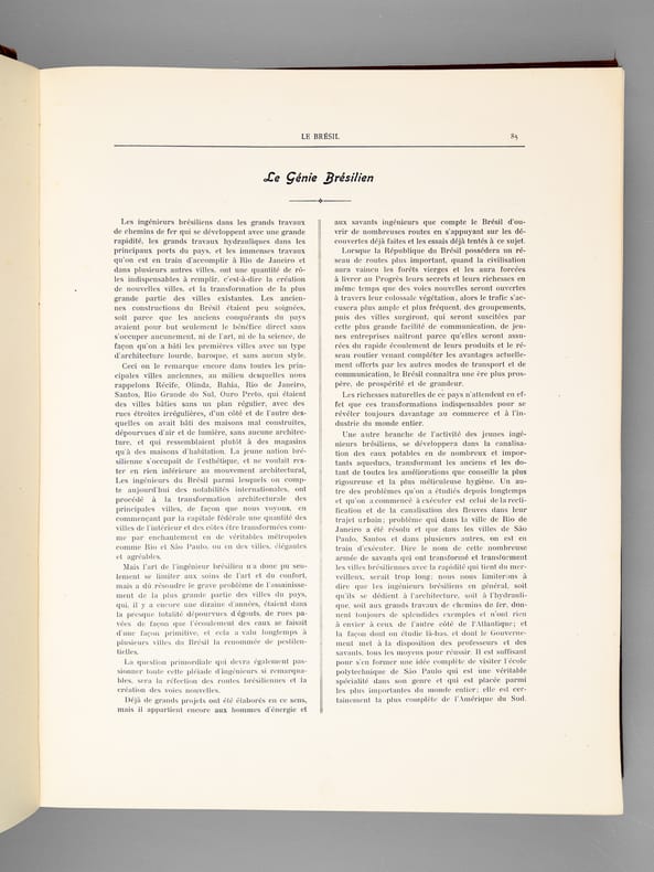 Impressionnant ouvrage richement illustré rédigé par le directeur de "France-Brésil", revue mensuelle de propagande industrielle et commerciale. Comme presque toujours, en raison du poids considérable de l'ouvrage, le mors intérieur a souffert, mais l'exemplaire est bien complet. On y trouvera notamment 2 panoramas dépliants de Manaus et Sao Paulo. Etat très satisfaisant (faiblesse à un mors visible au niveau du feuillet de titre, bon état par ailleurs).